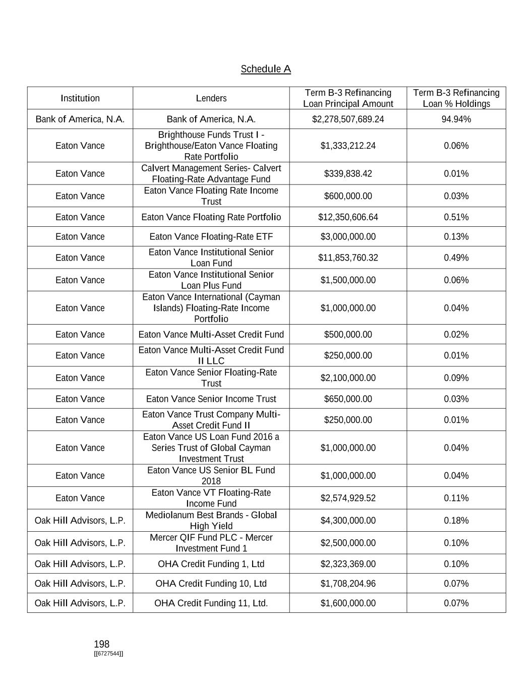 198 [[6727544]] Schedule A Institution Lenders Term B-3 Refinancing Loan Principal Amount Term B-3 Refinancing Loan % Holdings Bank of America, N.A. Bank of America, N.A. $2,278,507,689.24 94.94% Eaton Vance Brighthouse Funds Trust I - Brighthouse/Eaton Vance Floating Rate Portfolio $1,333,212.24 0.06% Eaton Vance Calvert Management Series- Calvert Floating-Rate Advantage Fund $339,838.42 0.01% Eaton Vance Eaton Vance Floating Rate Income Trust $600,000.00 0.03% Eaton Vance Eaton Vance Floating Rate Portfolio $12,350,606.64 0.51% Eaton Vance Eaton Vance Floating-Rate ETF $3,000,000.00 0.13% Eaton Vance Eaton Vance Institutional Senior Loan Fund $11,853,760.32 0.49% Eaton Vance Eaton Vance Institutional Senior Loan Plus Fund $1,500,000.00 0.06% Eaton Vance Eaton Vance International (Cayman Islands) Floating-Rate Income Portfolio $1,000,000.00 0.04% Eaton Vance Eaton Vance Multi-Asset Credit Fund $500,000.00 0.02% Eaton Vance Eaton Vance Multi-Asset Credit Fund II LLC $250,000.00 0.01% Eaton Vance Eaton Vance Senior Floating-Rate Trust $2,100,000.00 0.09% Eaton Vance Eaton Vance Senior Income Trust $650,000.00 0.03% Eaton Vance Eaton Vance Trust Company Multi- Asset Credit Fund II $250,000.00 0.01% Eaton Vance Eaton Vance US Loan Fund 2016 a Series Trust of Global Cayman Investment Trust $1,000,000.00 0.04% Eaton Vance Eaton Vance US Senior BL Fund 2018 $1,000,000.00 0.04% Eaton Vance Eaton Vance VT Floating-Rate Income Fund $2,574,929.52 0.11% Oak Hill Advisors, L.P. Mediolanum Best Brands - Global High Yield $4,300,000.00 0.18% Oak Hill Advisors, L.P. Mercer QIF Fund PLC - Mercer Investment Fund 1 $2,500,000.00 0.10% Oak Hill Advisors, L.P. OHA Credit Funding 1, Ltd $2,323,369.00 0.10% Oak Hill Advisors, L.P. OHA Credit Funding 10, Ltd $1,708,204.96 0.07% Oak Hill Advisors, L.P. OHA Credit Funding 11, Ltd. $1,600,000.00 0.07%