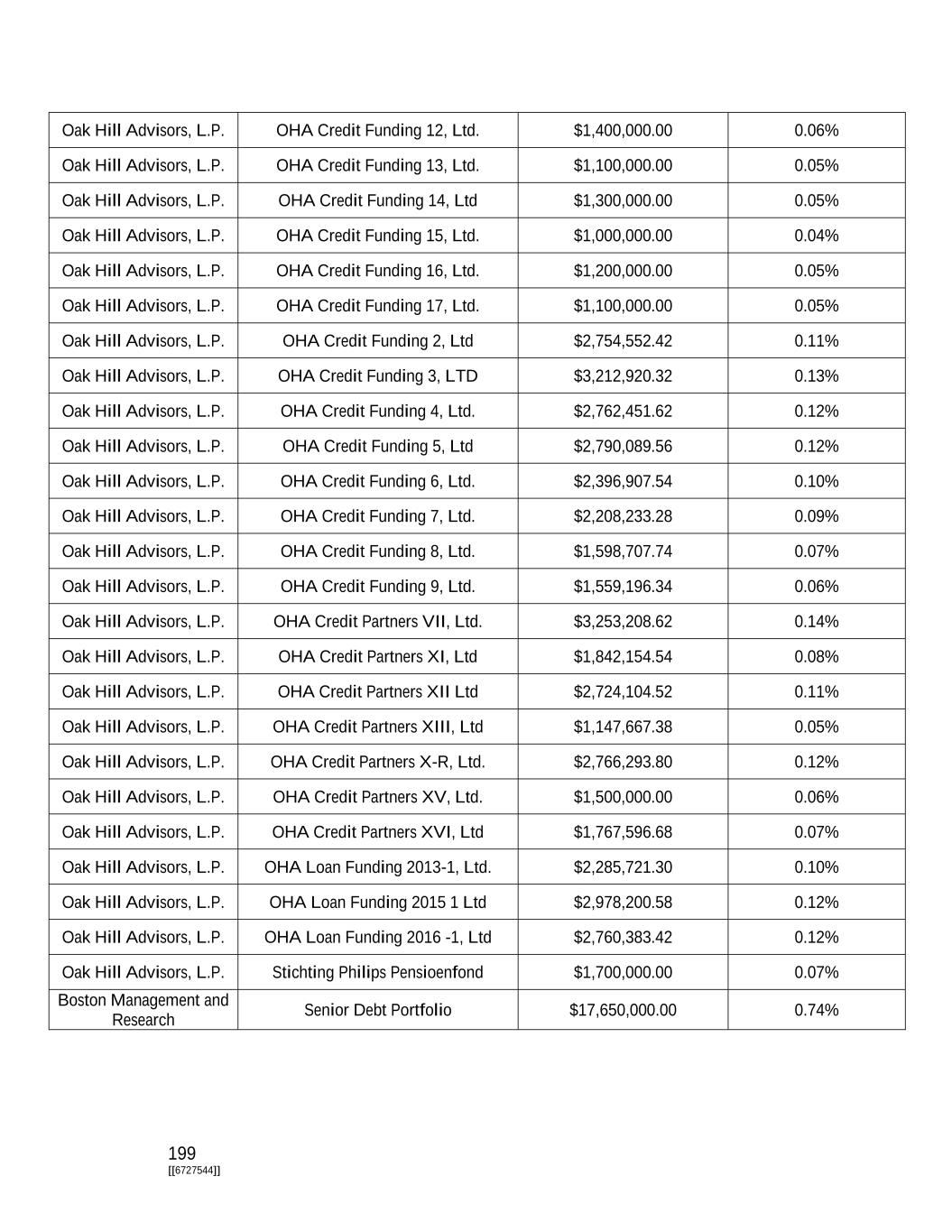 199 [[6727544]] Oak Hill Advisors, L.P. OHA Credit Funding 12, Ltd. $1,400,000.00 0.06% Oak Hill Advisors, L.P. OHA Credit Funding 13, Ltd. $1,100,000.00 0.05% Oak Hill Advisors, L.P. OHA Credit Funding 14, Ltd $1,300,000.00 0.05% Oak Hill Advisors, L.P. OHA Credit Funding 15, Ltd. $1,000,000.00 0.04% Oak Hill Advisors, L.P. OHA Credit Funding 16, Ltd. $1,200,000.00 0.05% Oak Hill Advisors, L.P. OHA Credit Funding 17, Ltd. $1,100,000.00 0.05% Oak Hill Advisors, L.P. OHA Credit Funding 2, Ltd $2,754,552.42 0.11% Oak Hill Advisors, L.P. OHA Credit Funding 3, LTD $3,212,920.32 0.13% Oak Hill Advisors, L.P. OHA Credit Funding 4, Ltd. $2,762,451.62 0.12% Oak Hill Advisors, L.P. OHA Credit Funding 5, Ltd $2,790,089.56 0.12% Oak Hill Advisors, L.P. OHA Credit Funding 6, Ltd. $2,396,907.54 0.10% Oak Hill Advisors, L.P. OHA Credit Funding 7, Ltd. $2,208,233.28 0.09% Oak Hill Advisors, L.P. OHA Credit Funding 8, Ltd. $1,598,707.74 0.07% Oak Hill Advisors, L.P. OHA Credit Funding 9, Ltd. $1,559,196.34 0.06% Oak Hill Advisors, L.P. OHA Credit Partners VII, Ltd. $3,253,208.62 0.14% Oak Hill Advisors, L.P. OHA Credit Partners XI, Ltd $1,842,154.54 0.08% Oak Hill Advisors, L.P. OHA Credit Partners XII Ltd $2,724,104.52 0.11% Oak Hill Advisors, L.P. OHA Credit Partners XIII, Ltd $1,147,667.38 0.05% Oak Hill Advisors, L.P. OHA Credit Partners X-R, Ltd. $2,766,293.80 0.12% Oak Hill Advisors, L.P. OHA Credit Partners XV, Ltd. $1,500,000.00 0.06% Oak Hill Advisors, L.P. OHA Credit Partners XVI, Ltd $1,767,596.68 0.07% Oak Hill Advisors, L.P. OHA Loan Funding 2013-1, Ltd. $2,285,721.30 0.10% Oak Hill Advisors, L.P. OHA Loan Funding 2015 1 Ltd $2,978,200.58 0.12% Oak Hill Advisors, L.P. OHA Loan Funding 2016 -1, Ltd $2,760,383.42 0.12% Oak Hill Advisors, L.P. Stichting Philips Pensioenfond $1,700,000.00 0.07% Boston Management and Research Senior Debt Portfolio $17,650,000.00 0.74%