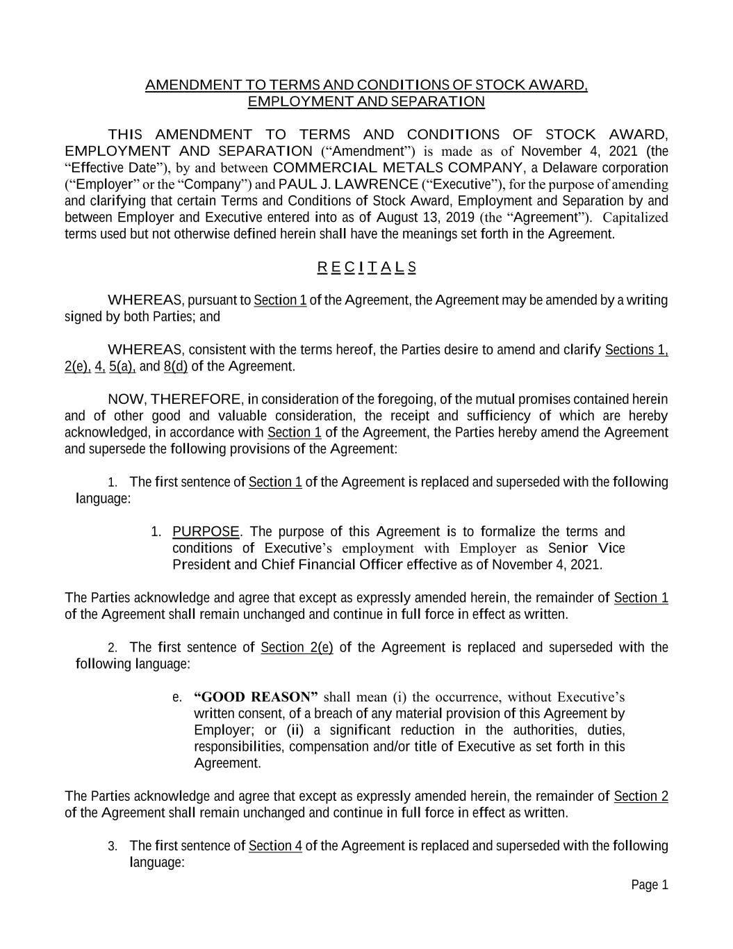 Page 1 AMENDMENT TO TERMS AND CONDITIONS OF STOCK AWARD, EMPLOYMENT AND SEPARATION THIS AMENDMENT TO TERMS AND CONDITIONS OF STOCK AWARD, EMPLOYMENT AND SEPARATION (“Amendment”) is made as of November 4, 2021 (the “Effective Date”), by and between COMMERCIAL METALS COMPANY, a Delaware corporation (“Employer” or the “Company”) and PAUL J. LAWRENCE (“Executive”), for the purpose of amending and clarifying that certain Terms and Conditions of Stock Award, Employment and Separation by and between Employer and Executive entered into as of August 13, 2019 (the “Agreement”). Capitalized terms used but not otherwise defined herein shall have the meanings set forth in the Agreement. R E C I T A L S WHEREAS, pursuant to Section 1 of the Agreement, the Agreement may be amended by a writing signed by both Parties; and WHEREAS, consistent with the terms hereof, the Parties desire to amend and clarify Sections 1, 2(e), 4, 5(a), and 8(d) of the Agreement. NOW, THEREFORE, in consideration of the foregoing, of the mutual promises contained herein and of other good and valuable consideration, the receipt and sufficiency of which are hereby acknowledged, in accordance with Section 1 of the Agreement, the Parties hereby amend the Agreement and supersede the following provisions of the Agreement: 1. The first sentence of Section 1 of the Agreement is replaced and superseded with the following language: 1. PURPOSE. The purpose of this Agreement is to formalize the terms and conditions of Executive’s employment with Employer as Senior Vice President and Chief Financial Officer effective as of November 4, 2021. The Parties acknowledge and agree that except as expressly amended herein, the remainder of Section 1 of the Agreement shall remain unchanged and continue in full force in effect as written. 2. The first sentence of Section 2(e) of the Agreement is replaced and superseded with the following language: e. “GOOD REASON” shall mean (i) the occurrence, without Executive’s written consent, of a breach of any material provision of this Agreement by Employer; or (ii) a significant reduction in the authorities, duties, responsibilities, compensation and/or title of Executive as set forth in this Agreement. The Parties acknowledge and agree that except as expressly amended herein, the remainder of Section 2 of the Agreement shall remain unchanged and continue in full force in effect as written. 3. The first sentence of Section 4 of the Agreement is replaced and superseded with the following language: