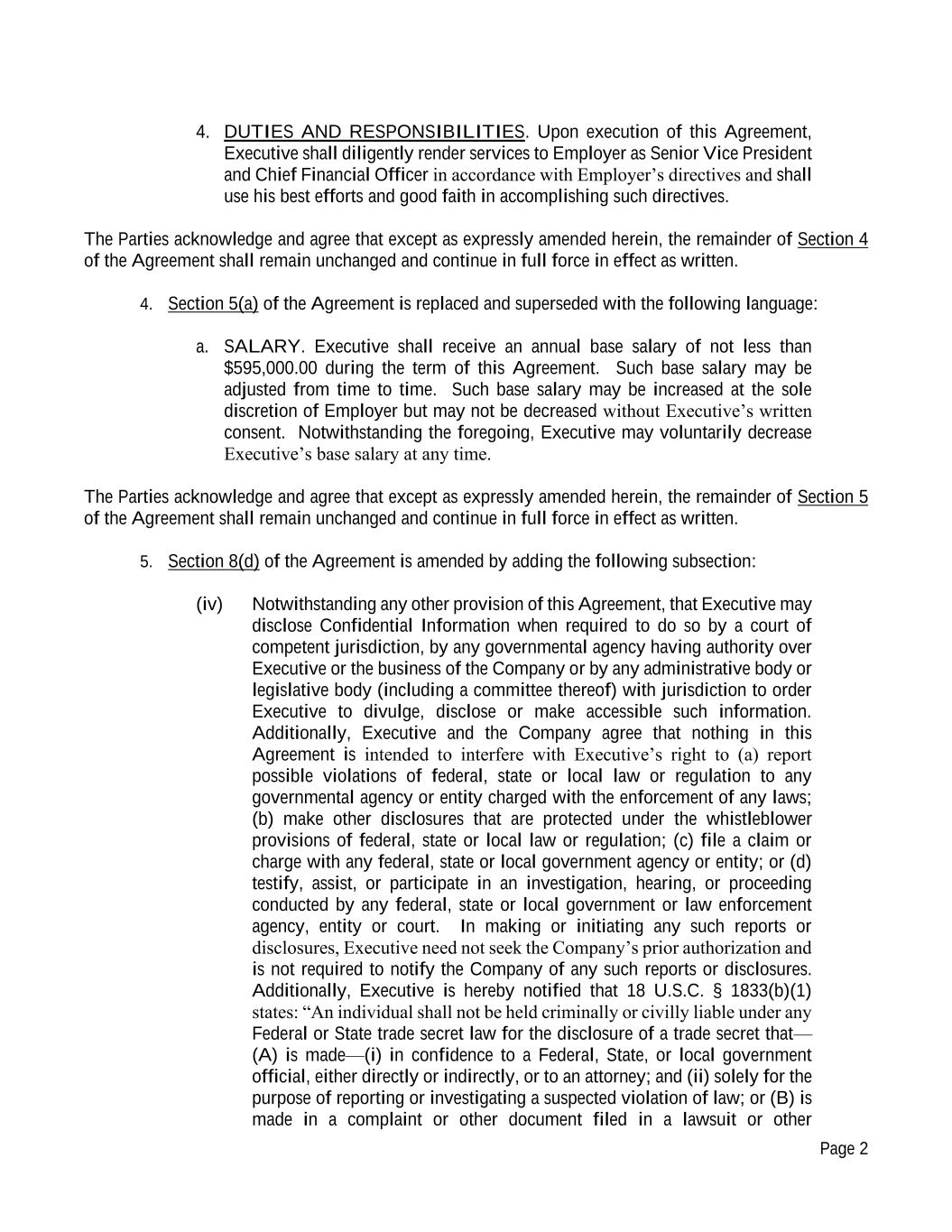 Page 2 4. DUTIES AND RESPONSIBILITIES. Upon execution of this Agreement, Executive shall diligently render services to Employer as Senior Vice President and Chief Financial Officer in accordance with Employer’s directives and shall use his best efforts and good faith in accomplishing such directives. The Parties acknowledge and agree that except as expressly amended herein, the remainder of Section 4 of the Agreement shall remain unchanged and continue in full force in effect as written. 4. Section 5(a) of the Agreement is replaced and superseded with the following language: a. SALARY. Executive shall receive an annual base salary of not less than $595,000.00 during the term of this Agreement. Such base salary may be adjusted from time to time. Such base salary may be increased at the sole discretion of Employer but may not be decreased without Executive’s written consent. Notwithstanding the foregoing, Executive may voluntarily decrease Executive’s base salary at any time. The Parties acknowledge and agree that except as expressly amended herein, the remainder of Section 5 of the Agreement shall remain unchanged and continue in full force in effect as written. 5. Section 8(d) of the Agreement is amended by adding the following subsection: (iv) Notwithstanding any other provision of this Agreement, that Executive may disclose Confidential Information when required to do so by a court of competent jurisdiction, by any governmental agency having authority over Executive or the business of the Company or by any administrative body or legislative body (including a committee thereof) with jurisdiction to order Executive to divulge, disclose or make accessible such information. Additionally, Executive and the Company agree that nothing in this Agreement is intended to interfere with Executive’s right to (a) report possible violations of federal, state or local law or regulation to any governmental agency or entity charged with the enforcement of any laws; (b) make other disclosures that are protected under the whistleblower provisions of federal, state or local law or regulation; (c) file a claim or charge with any federal, state or local government agency or entity; or (d) testify, assist, or participate in an investigation, hearing, or proceeding conducted by any federal, state or local government or law enforcement agency, entity or court. In making or initiating any such reports or disclosures, Executive need not seek the Company’s prior authorization and is not required to notify the Company of any such reports or disclosures. Additionally, Executive is hereby notified that 18 U.S.C. § 1833(b)(1) states: “An individual shall not be held criminally or civilly liable under any Federal or State trade secret law for the disclosure of a trade secret that— (A) is made—(i) in confidence to a Federal, State, or local government official, either directly or indirectly, or to an attorney; and (ii) solely for the purpose of reporting or investigating a suspected violation of law; or (B) is made in a complaint or other document filed in a lawsuit or other