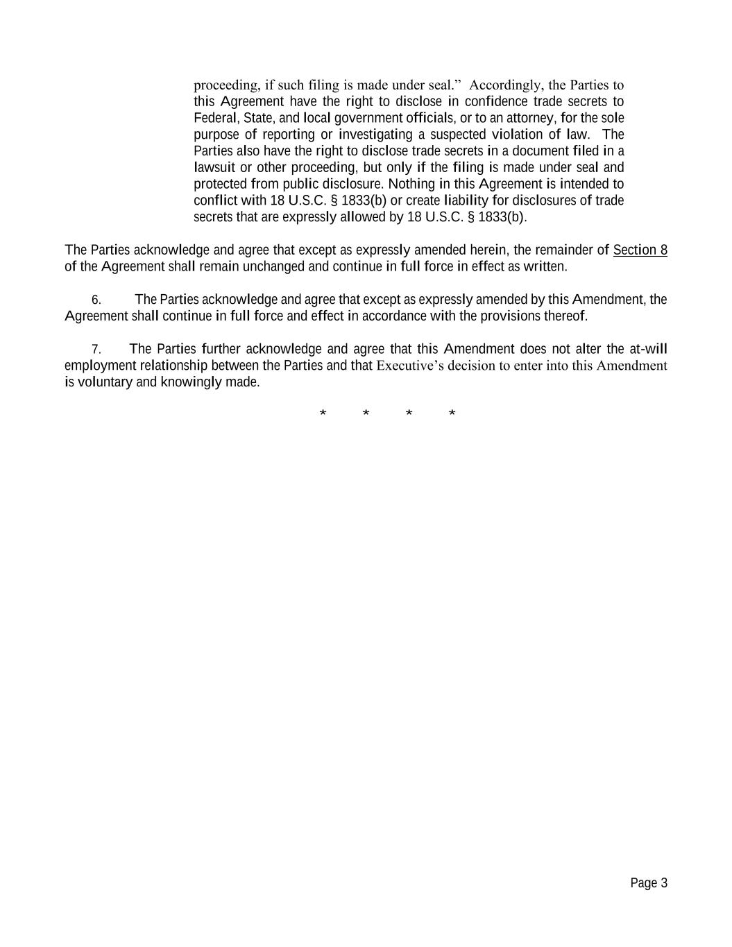 Page 3 proceeding, if such filing is made under seal.” Accordingly, the Parties to this Agreement have the right to disclose in confidence trade secrets to Federal, State, and local government officials, or to an attorney, for the sole purpose of reporting or investigating a suspected violation of law. The Parties also have the right to disclose trade secrets in a document filed in a lawsuit or other proceeding, but only if the filing is made under seal and protected from public disclosure. Nothing in this Agreement is intended to conflict with 18 U.S.C. § 1833(b) or create liability for disclosures of trade secrets that are expressly allowed by 18 U.S.C. § 1833(b). The Parties acknowledge and agree that except as expressly amended herein, the remainder of Section 8 of the Agreement shall remain unchanged and continue in full force in effect as written. 6. The Parties acknowledge and agree that except as expressly amended by this Amendment, the Agreement shall continue in full force and effect in accordance with the provisions thereof. 7. The Parties further acknowledge and agree that this Amendment does not alter the at-will employment relationship between the Parties and that Executive’s decision to enter into this Amendment is voluntary and knowingly made. * * * *