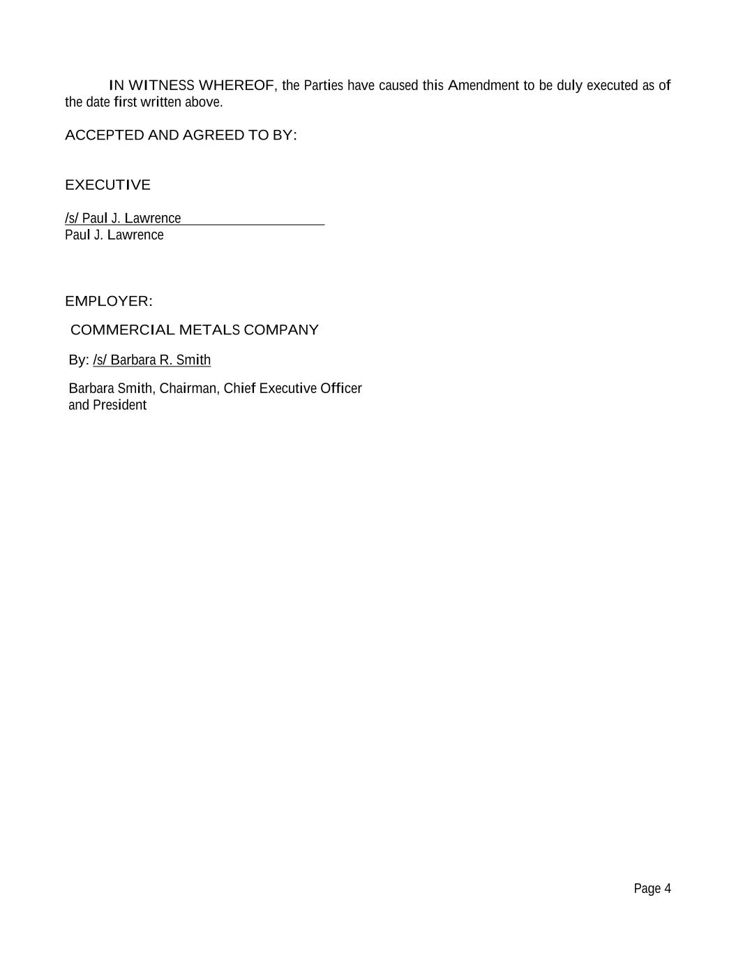 Page 4 IN WITNESS WHEREOF, the Parties have caused this Amendment to be duly executed as of the date first written above. ACCEPTED AND AGREED TO BY: EXECUTIVE /s/ Paul J. Lawrence Paul J. Lawrence EMPLOYER: COMMERCIAL METALS COMPANY By: /s/ Barbara R. Smith Barbara Smith, Chairman, Chief Executive Officer and President