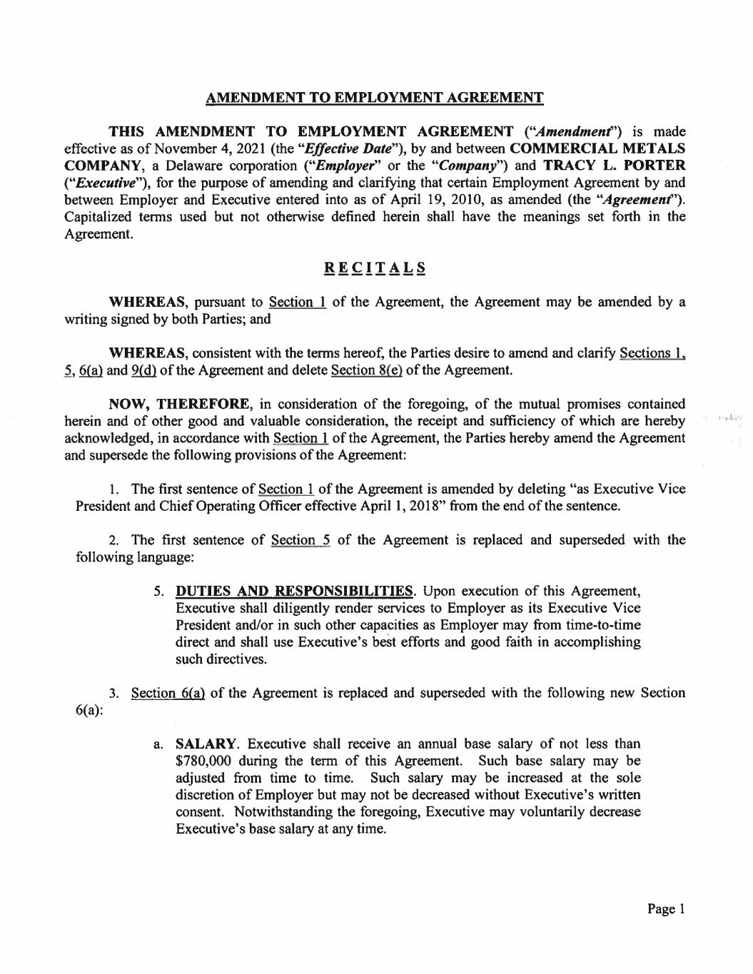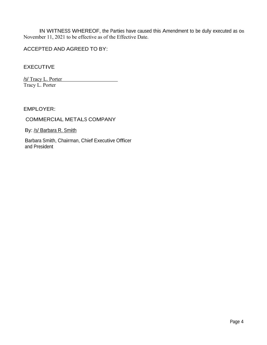 Page 4 IN WITNESS WHEREOF, the Parties have caused this Amendment to be duly executed as on November 11, 2021 to be effective as of the Effective Date. ACCEPTED AND AGREED TO BY: EXECUTIVE /s/ Tracy L. Porter Tracy L. Porter EMPLOYER: COMMERCIAL METALS COMPANY By: /s/ Barbara R. Smith Barbara Smith, Chairman, Chief Executive Officer and President