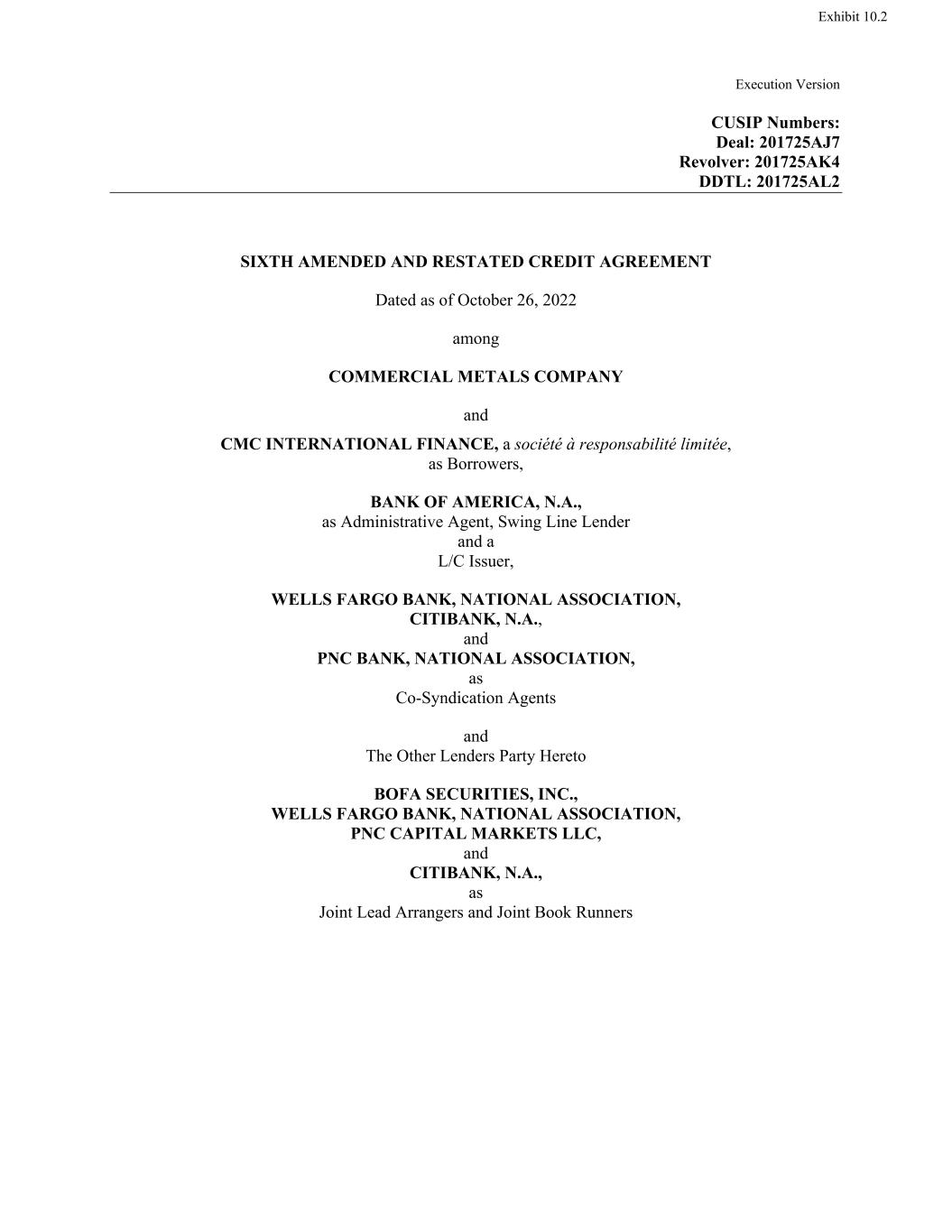 Execution Version CUSIP Numbers: Deal: 201725AJ7 Revolver: 201725AK4 DDTL: 201725AL2 SIXTH AMENDED AND RESTATED CREDIT AGREEMENT Dated as of October 26, 2022 among COMMERCIAL METALS COMPANY and CMC INTERNATIONAL FINANCE, a société à responsabilité limitée, as Borrowers, BANK OF AMERICA, N.A., as Administrative Agent, Swing Line Lender and a L/C Issuer, WELLS FARGO BANK, NATIONAL ASSOCIATION, CITIBANK, N.A., and PNC BANK, NATIONAL ASSOCIATION, as Co-Syndication Agents and The Other Lenders Party Hereto BOFA SECURITIES, INC., WELLS FARGO BANK, NATIONAL ASSOCIATION, PNC CAPITAL MARKETS LLC, and CITIBANK, N.A., as Joint Lead Arrangers and Joint Book Runners Exhibit 10.2