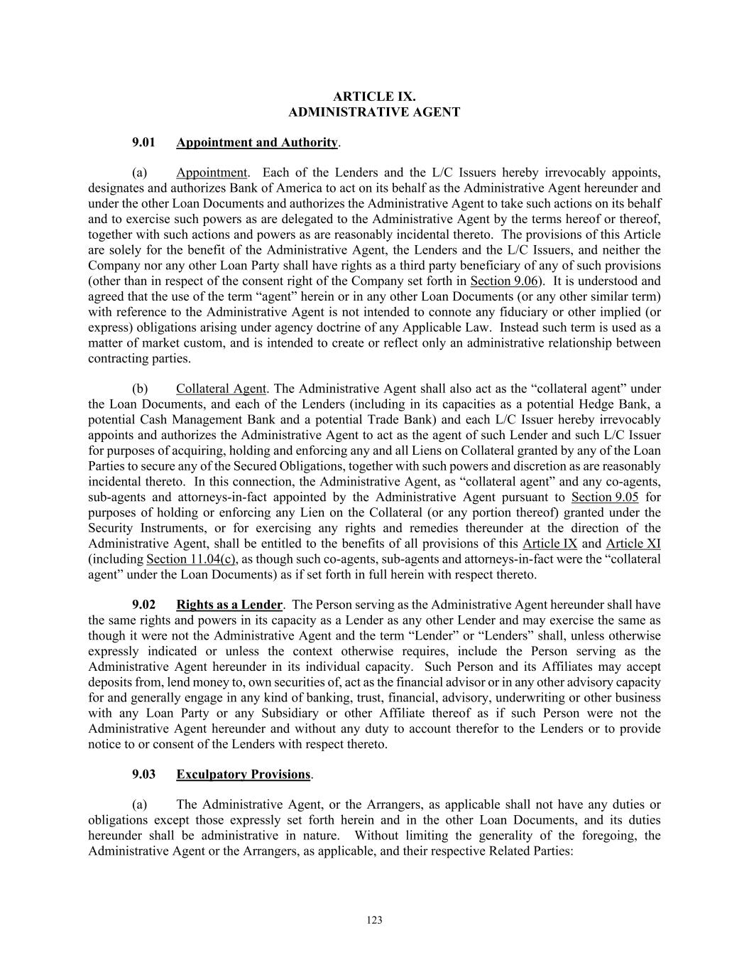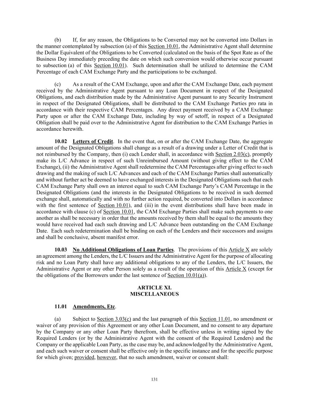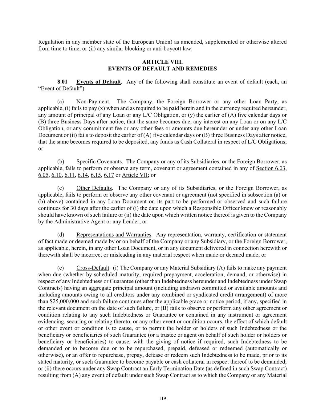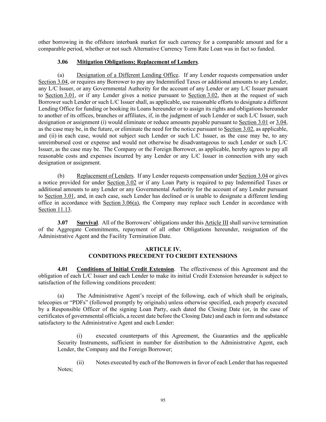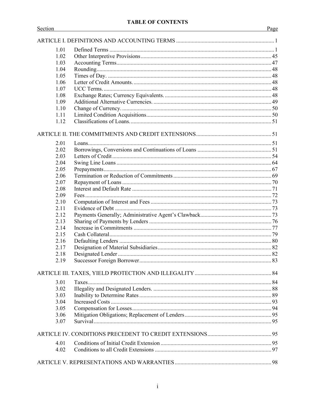 TABLE OF CONTENTS Section Page i ARTICLE I. DEFINITIONS AND ACCOUNTING TERMS ..................................................................... 1  1.01  Defined Terms .................................................................................................................... 1  1.02  Other Interpretive Provisions ............................................................................................ 45  1.03  Accounting Terms ............................................................................................................. 47  1.04  Rounding ........................................................................................................................... 48  1.05  Times of Day. ................................................................................................................... 48  1.06  Letter of Credit Amounts. ................................................................................................. 48  1.07  UCC Terms. ...................................................................................................................... 48  1.08  Exchange Rates; Currency Equivalents. ........................................................................... 48  1.09  Additional Alternative Currencies. ................................................................................... 49  1.10  Change of Currency. ......................................................................................................... 50  1.11  Limited Condition Acquisitions ........................................................................................ 50  1.12  Classifications of Loans. ................................................................................................... 51  ARTICLE II. THE COMMITMENTS AND CREDIT EXTENSIONS ..................................................... 51  2.01  Loans ................................................................................................................................. 51  2.02  Borrowings, Conversions and Continuations of Loans .................................................... 51  2.03  Letters of Credit ................................................................................................................ 54  2.04  Swing Line Loans ............................................................................................................. 64  2.05  Prepayments ...................................................................................................................... 67  2.06  Termination or Reduction of Commitments ..................................................................... 69  2.07  Repayment of Loans ......................................................................................................... 70  2.08  Interest and Default Rate .................................................................................................. 71  2.09  Fees ................................................................................................................................... 72  2.10  Computation of Interest and Fees ..................................................................................... 73  2.11  Evidence of Debt .............................................................................................................. 73  2.12  Payments Generally; Administrative Agent’s Clawback .................................................. 73  2.13  Sharing of Payments by Lenders ...................................................................................... 76  2.14  Increase in Commitments ................................................................................................. 77  2.15  Cash Collateral .................................................................................................................. 79  2.16  Defaulting Lenders ........................................................................................................... 80  2.17  Designation of Material Subsidiaries ................................................................................ 82  2.18  Designated Lender ............................................................................................................ 82  2.19  Successor Foreign Borrower ............................................................................................. 83  ARTICLE III. TAXES, YIELD PROTECTION AND ILLEGALITY ...................................................... 84  3.01  Taxes ................................................................................................................................. 84  3.02  Illegality and Designated Lenders. ................................................................................... 88  3.03  Inability to Determine Rates ............................................................................................. 89  3.04  Increased Costs ................................................................................................................. 93  3.05  Compensation for Losses .................................................................................................. 94  3.06  Mitigation Obligations; Replacement of Lenders ............................................................. 95  3.07  Survival ............................................................................................................................. 95  ARTICLE IV. CONDITIONS PRECEDENT TO CREDIT EXTENSIONS ............................................. 95  4.01  Conditions of Initial Credit Extension .............................................................................. 95  4.02  Conditions to all Credit Extensions .................................................................................. 97  ARTICLE V. REPRESENTATIONS AND WARRANTIES .............................................