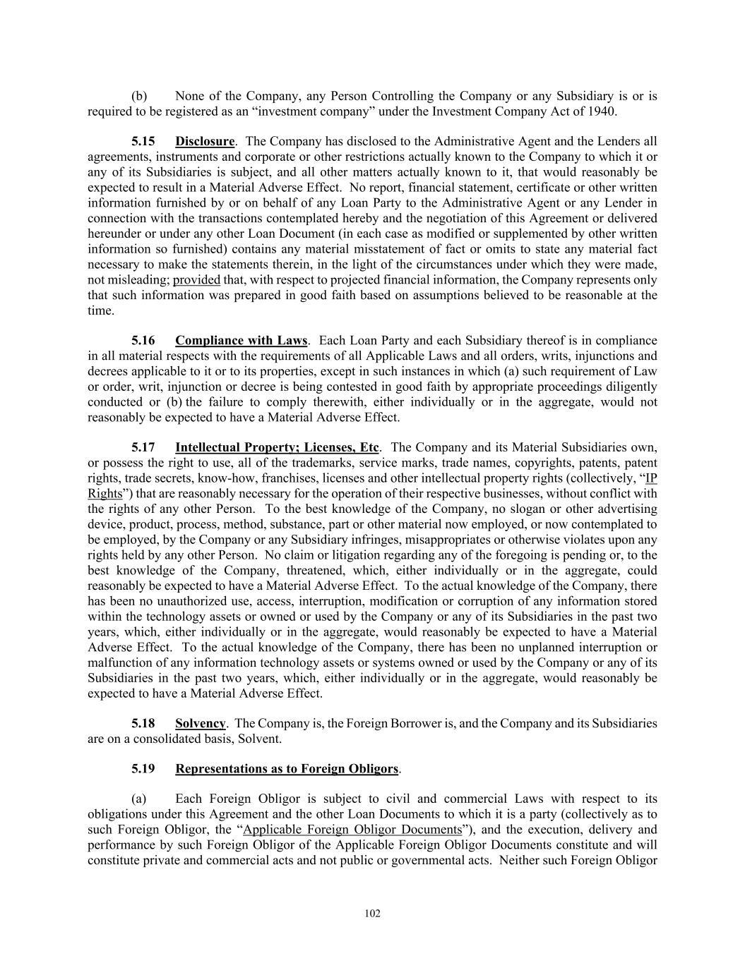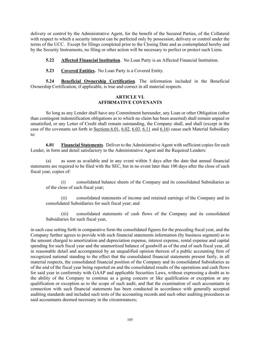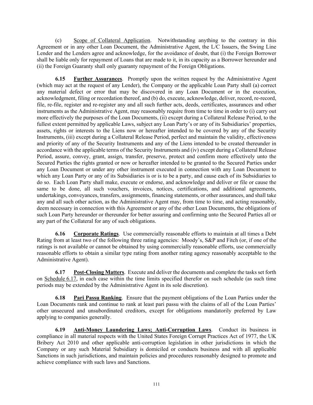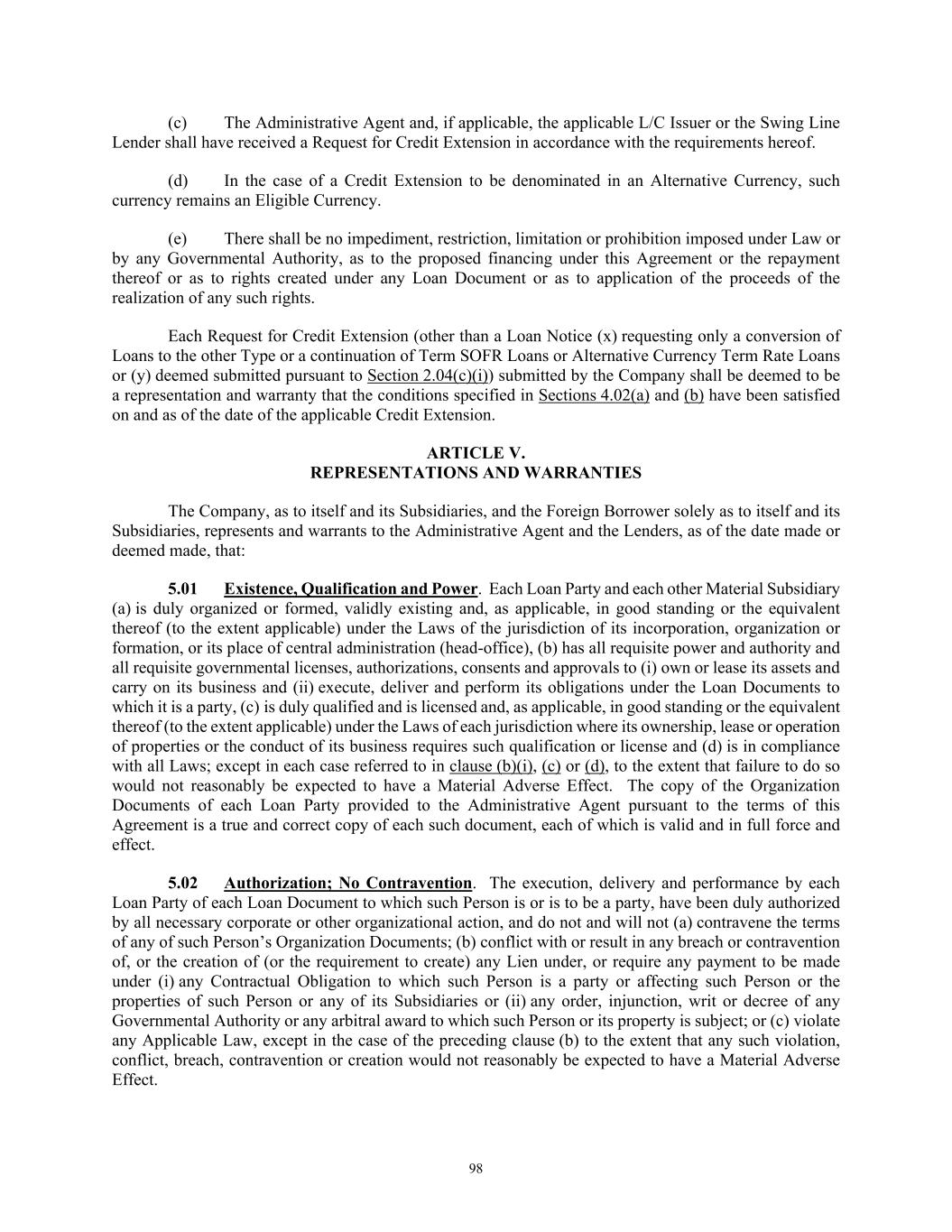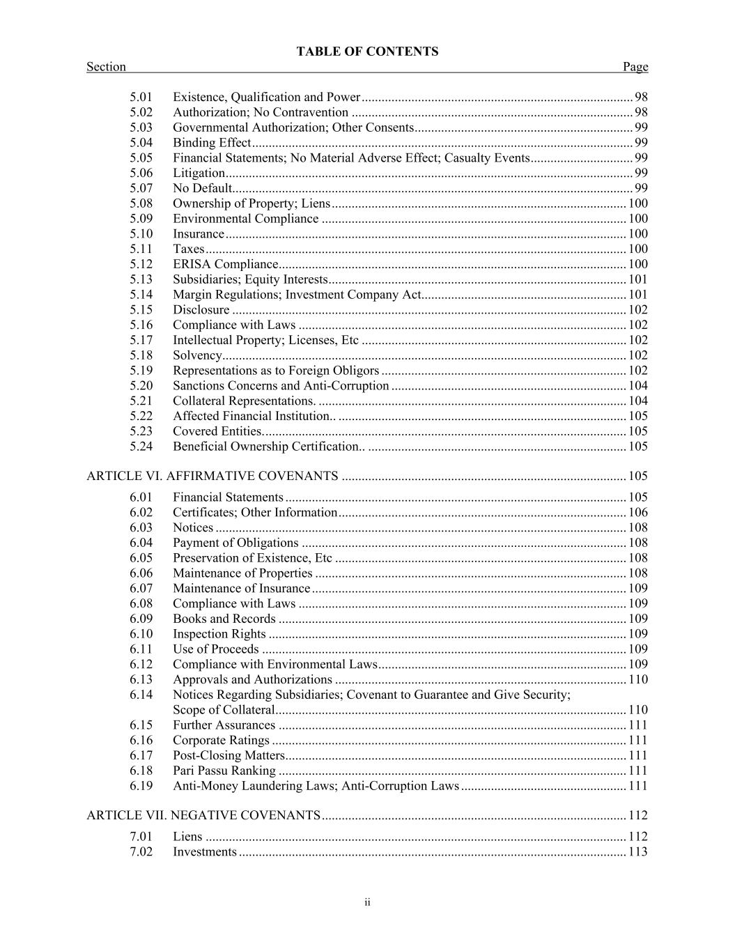 TABLE OF CONTENTS Section Page ii 5.01  Existence, Qualification and Power .................................................................................. 98  5.02  Authorization; No Contravention ..................................................................................... 98  5.03  Governmental Authorization; Other Consents .................................................................. 99  5.04  Binding Effect ................................................................................................................... 99  5.05  Financial Statements; No Material Adverse Effect; Casualty Events ............................... 99  5.06  Litigation ........................................................................................................................... 99  5.07  No Default......................................................................................................................... 99  5.08  Ownership of Property; Liens ......................................................................................... 100  5.09  Environmental Compliance ............................................................................................ 100  5.10  Insurance ......................................................................................................................... 100  5.11  Taxes ............................................................................................................................... 100  5.12  ERISA Compliance ......................................................................................................... 100  5.13  Subsidiaries; Equity Interests .......................................................................................... 101  5.14  Margin Regulations; Investment Company Act.............................................................. 101  5.15  Disclosure ....................................................................................................................... 102  5.16  Compliance with Laws ................................................................................................... 102  5.17  Intellectual Property; Licenses, Etc ................................................................................ 102  5.18  Solvency.......................................................................................................................... 102  5.19  Representations as to Foreign Obligors .......................................................................... 102  5.20  Sanctions Concerns and Anti-Corruption ....................................................................... 104  5.21  Collateral Representations. ............................................................................................. 104  5.22  Affected Financial Institution.. ....................................................................................... 105  5.23  Covered Entities. ............................................................................................................. 105  5.24  Beneficial Ownership Certification.. .............................................................................. 105  ARTICLE VI. AFFIRMATIVE COVENANTS ...................................................................................... 105  6.01  Financial Statements ....................................................................................................... 105  6.02  Certificates; Other Information ....................................................................................... 106  6.03  Notices ............................................................................................................................ 108  6.04  Payment of Obligations .................................................................................................. 108  6.05  Preservation of Existence, Etc ........................................................................................ 108  6.06  Maintenance of Properties .............................................................................................. 108  6.07  Maintenance of Insurance ............................................................................................... 109  6.08  Compliance with Laws ................................................................................................... 109  6.09  Books and Records ......................................................................................................... 109  6.10  Inspection Rights ............................................................................................................ 109  6.11  Use of Proceeds .............................................................................................................. 109  6.12  Compliance with Environmental Laws ........................................................................... 109  6.13  Approvals and Authorizations ........................................................................................ 110  6.14  Notices Regarding Subsidiaries; Covenant to Guarantee and Give Security; Scope of Collateral .......................................................................................................... 110  6.15  Further Assurances ......................................................................................................... 111  6.16  Corporate Ratings ........................................................................................................... 111  6.17  Post-Closing Matters ....................................................................................................... 111  6.18  Pari Passu Ranking ......................................................................................................... 111  6.19  Anti-Money Laundering Laws; Anti-Corruption Laws .............................................