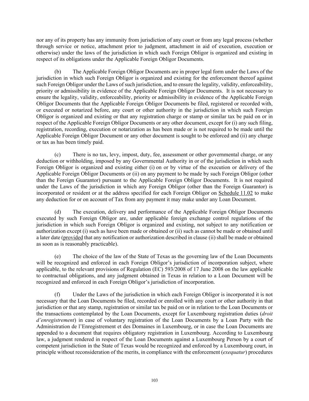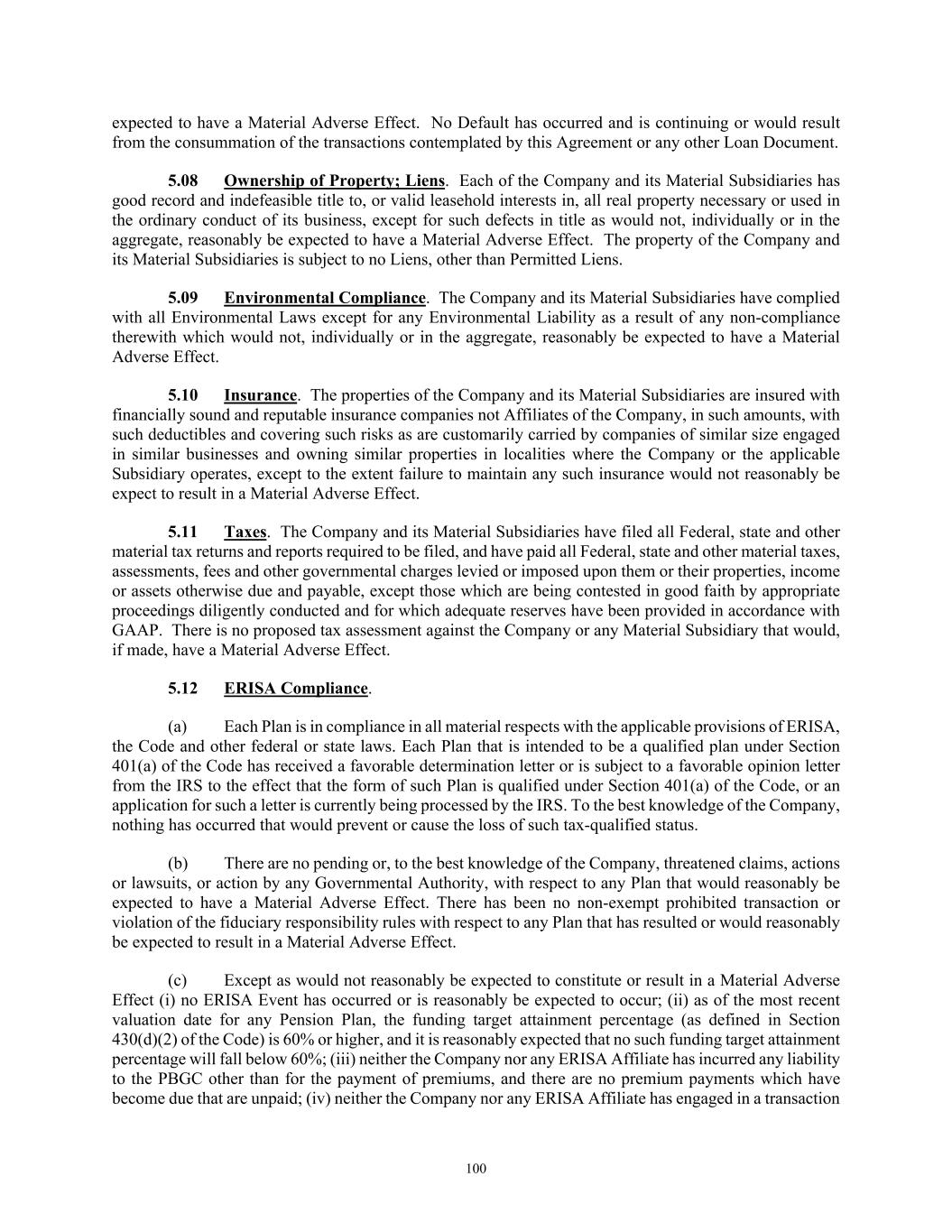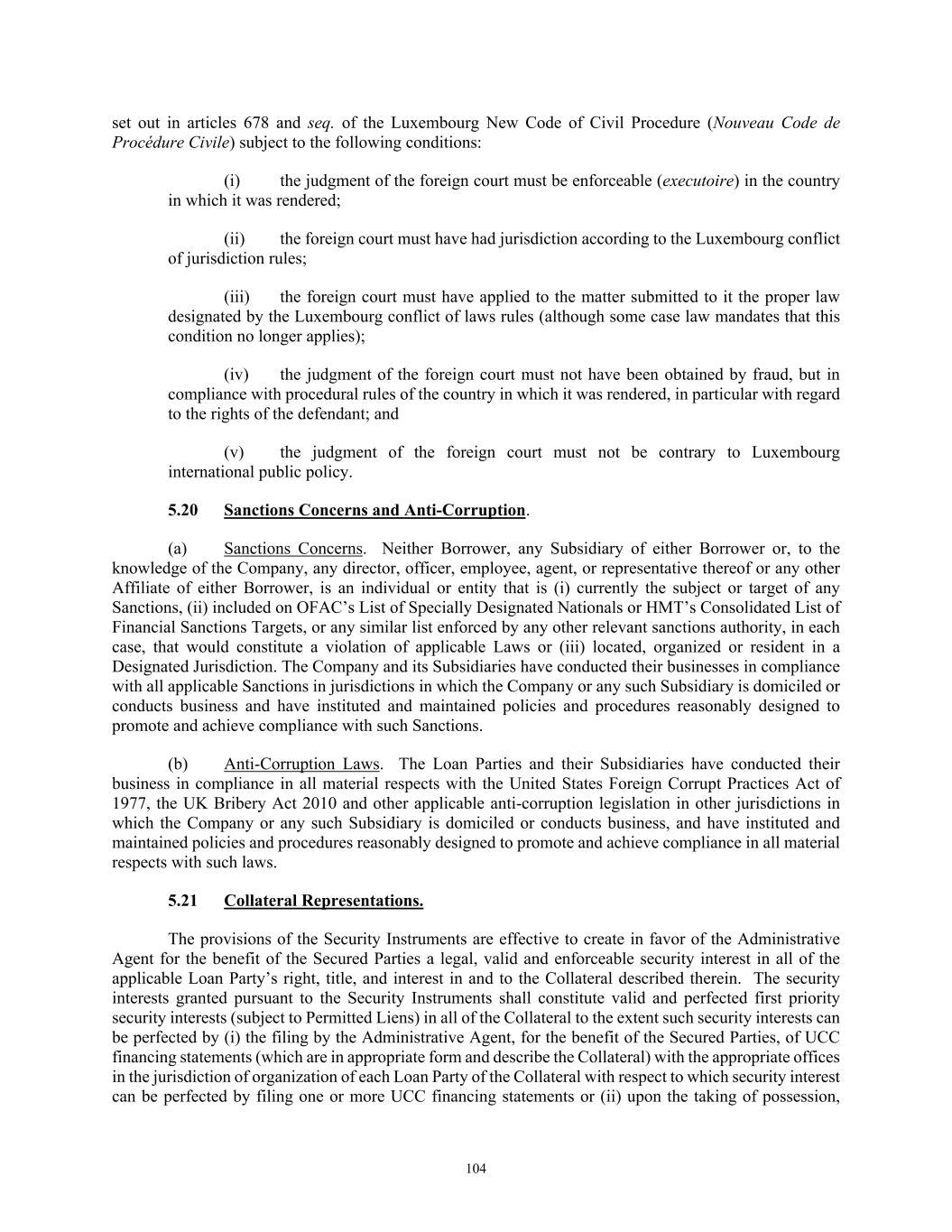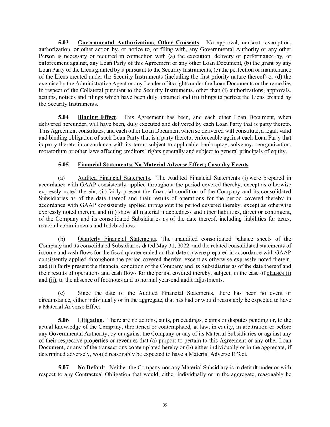 TABLE OF CONTENTS Section Page ii 5.01  Existence, Qualification and Power .................................................................................. 98  5.02  Authorization; No Contravention ..................................................................................... 98  5.03  Governmental Authorization; Other Consents .................................................................. 99  5.04  Binding Effect ................................................................................................................... 99  5.05  Financial Statements; No Material Adverse Effect; Casualty Events ............................... 99  5.06  Litigation ........................................................................................................................... 99  5.07  No Default......................................................................................................................... 99  5.08  Ownership of Property; Liens ......................................................................................... 100  5.09  Environmental Compliance ............................................................................................ 100  5.10  Insurance ......................................................................................................................... 100  5.11  Taxes ............................................................................................................................... 100  5.12  ERISA Compliance ......................................................................................................... 100  5.13  Subsidiaries; Equity Interests .......................................................................................... 101  5.14  Margin Regulations; Investment Company Act.............................................................. 101  5.15  Disclosure ....................................................................................................................... 102  5.16  Compliance with Laws ................................................................................................... 102  5.17  Intellectual Property; Licenses, Etc ................................................................................ 102  5.18  Solvency.......................................................................................................................... 102  5.19  Representations as to Foreign Obligors .......................................................................... 102  5.20  Sanctions Concerns and Anti-Corruption ....................................................................... 104  5.21  Collateral Representations. ............................................................................................. 104  5.22  Affected Financial Institution.. ....................................................................................... 105  5.23  Covered Entities. ............................................................................................................. 105  5.24  Beneficial Ownership Certification.. .............................................................................. 105  ARTICLE VI. AFFIRMATIVE COVENANTS ...................................................................................... 105  6.01  Financial Statements ....................................................................................................... 105  6.02  Certificates; Other Information ....................................................................................... 106  6.03  Notices ............................................................................................................................ 108  6.04  Payment of Obligations .................................................................................................. 108  6.05  Preservation of Existence, Etc ........................................................................................ 108  6.06  Maintenance of Properties .............................................................................................. 108  6.07  Maintenance of Insurance ............................................................................................... 109  6.08  Compliance with Laws ................................................................................................... 109  6.09  Books and Records ......................................................................................................... 109  6.10  Inspection Rights ............................................................................................................ 109  6.11  Use of Proceeds .............................................................................................................. 109  6.12  Compliance with Environmental Laws ........................................................................... 109  6.13  Approvals and Authorizations ........................................................................................ 110  6.14  Notices Regarding Subsidiaries; Covenant to Guarantee and Give Security; Scope of Collateral .......................................................................................................... 110  6.15  Further Assurances ......................................................................................................... 111  6.16  Corporate Ratings ........................................................................................................... 111  6.17  Post-Closing Matters ....................................................................................................... 111  6.18  Pari Passu Ranking ......................................................................................................... 111  6.19  Anti-Money Laundering Laws; Anti-Corruption Laws .............................................