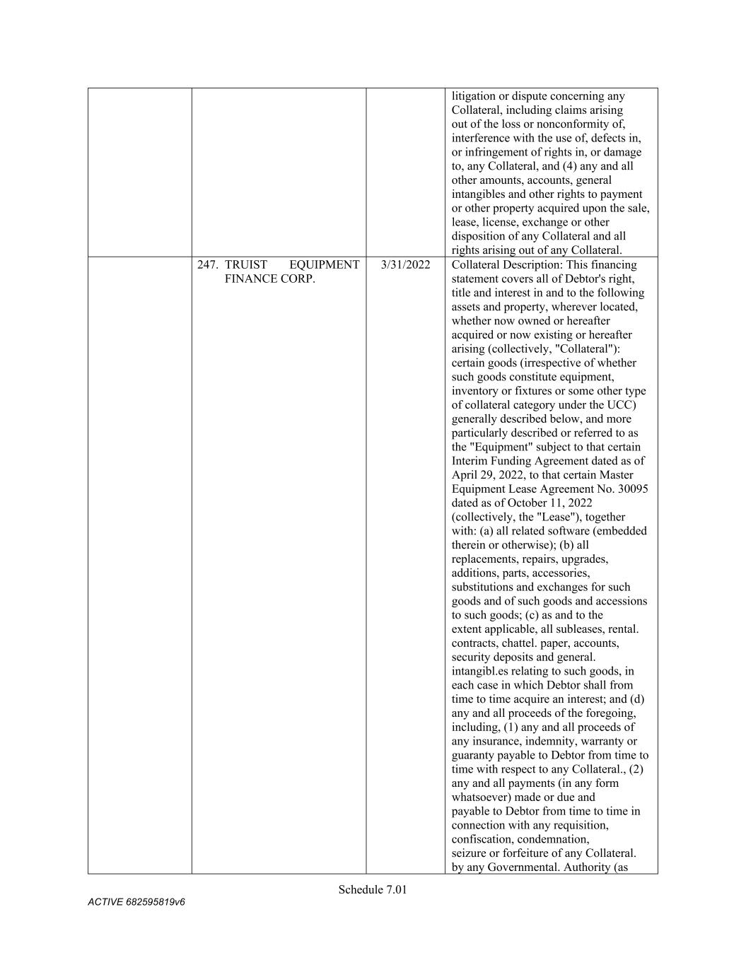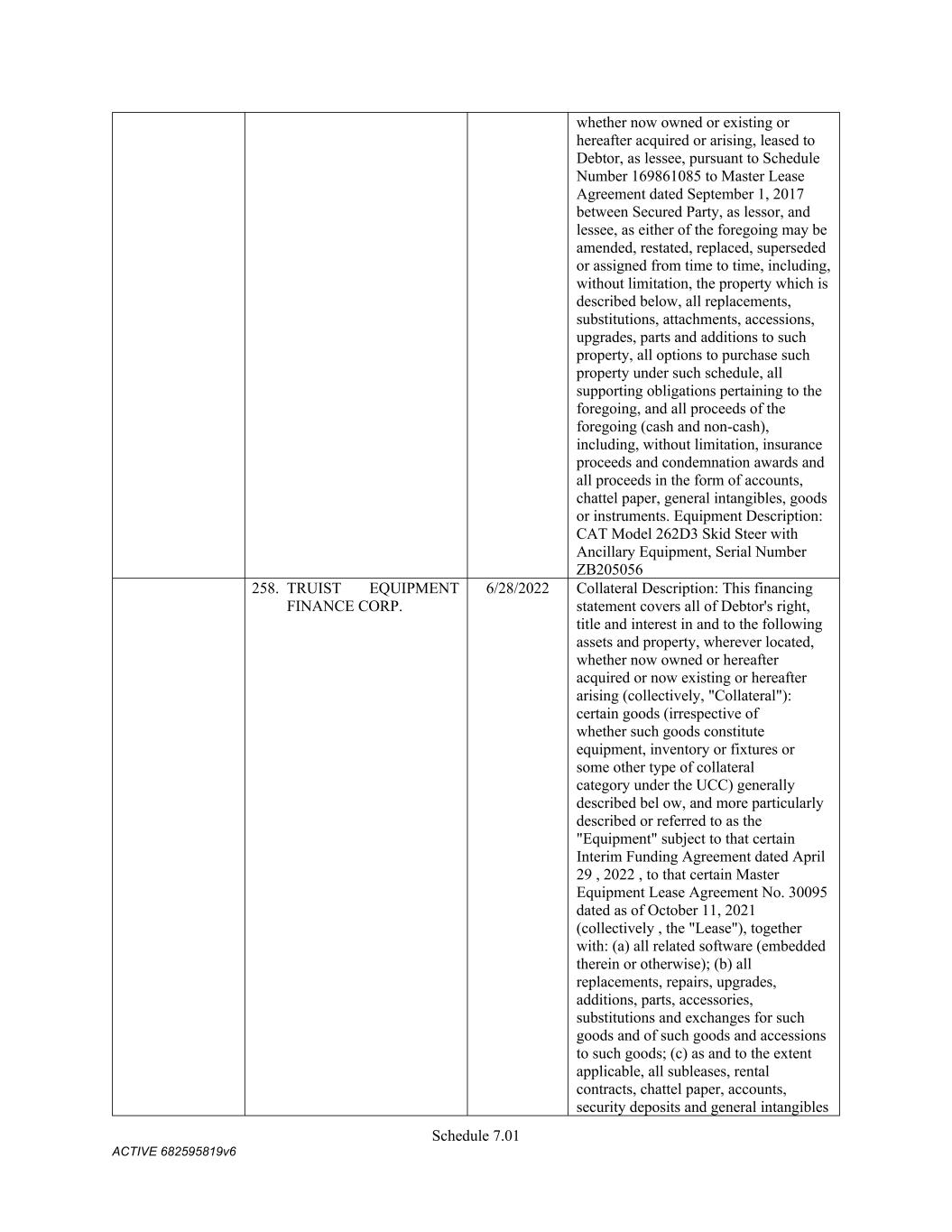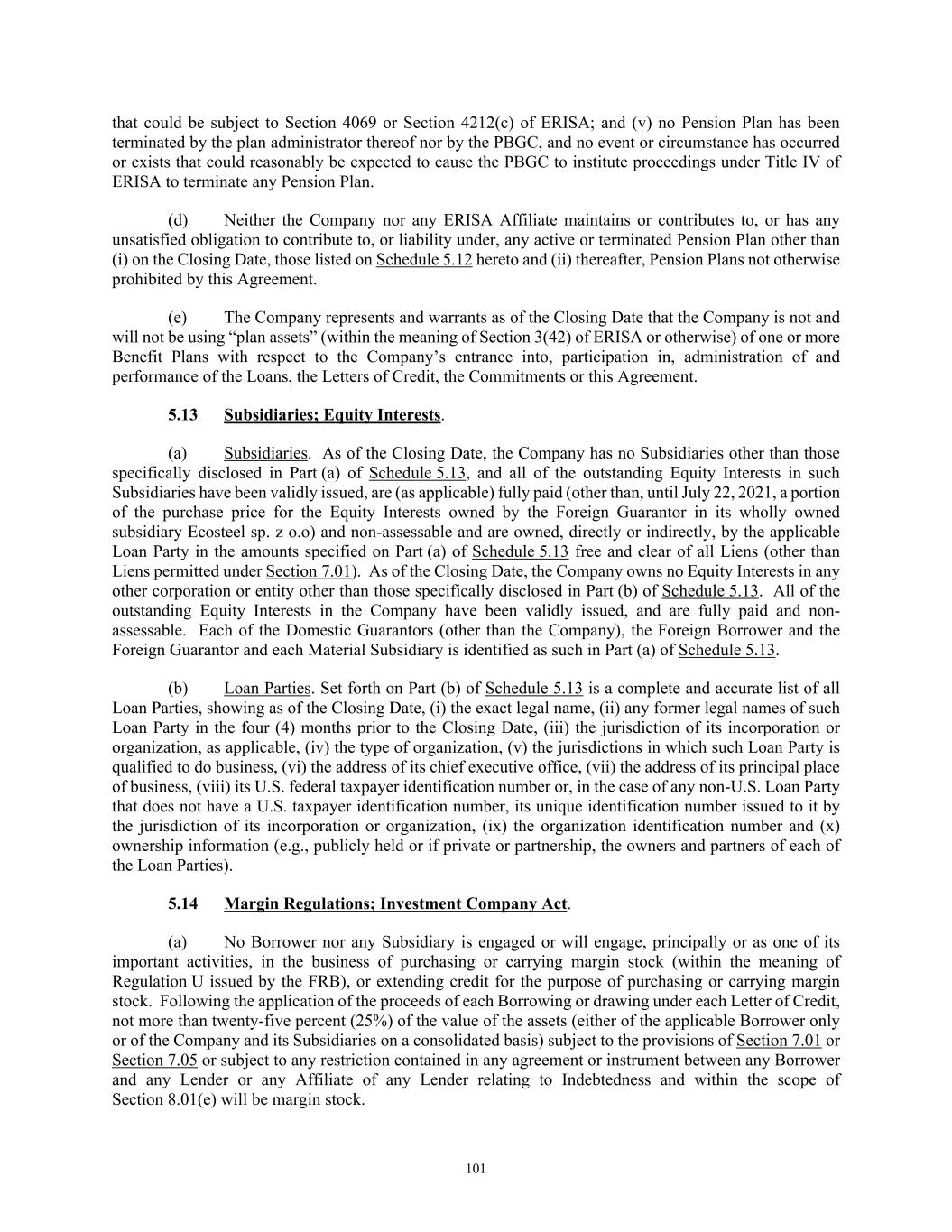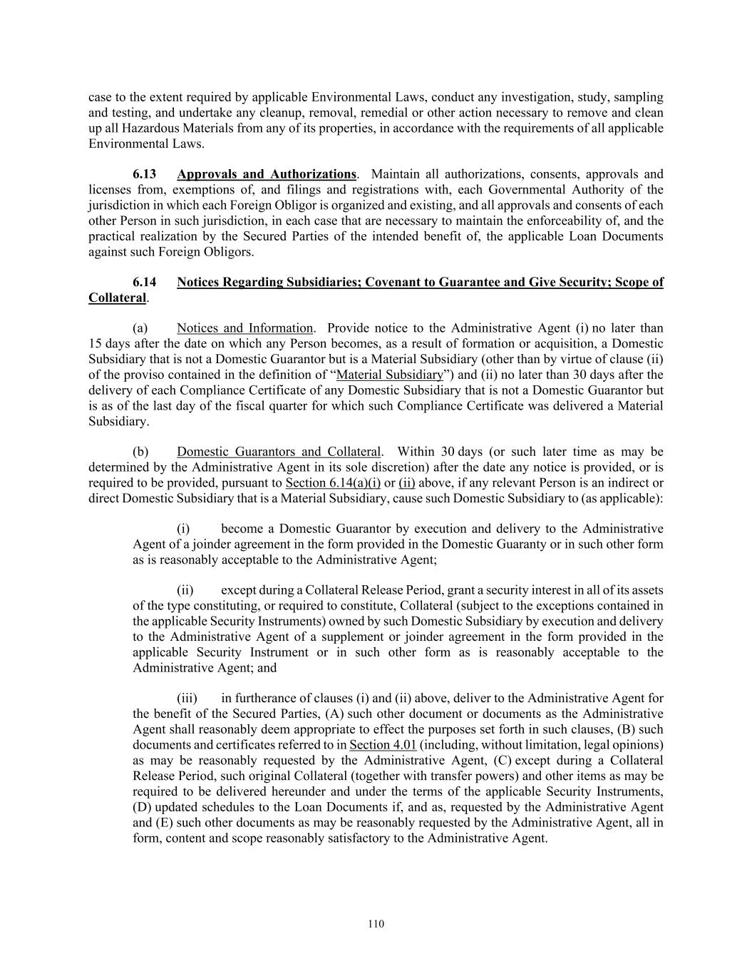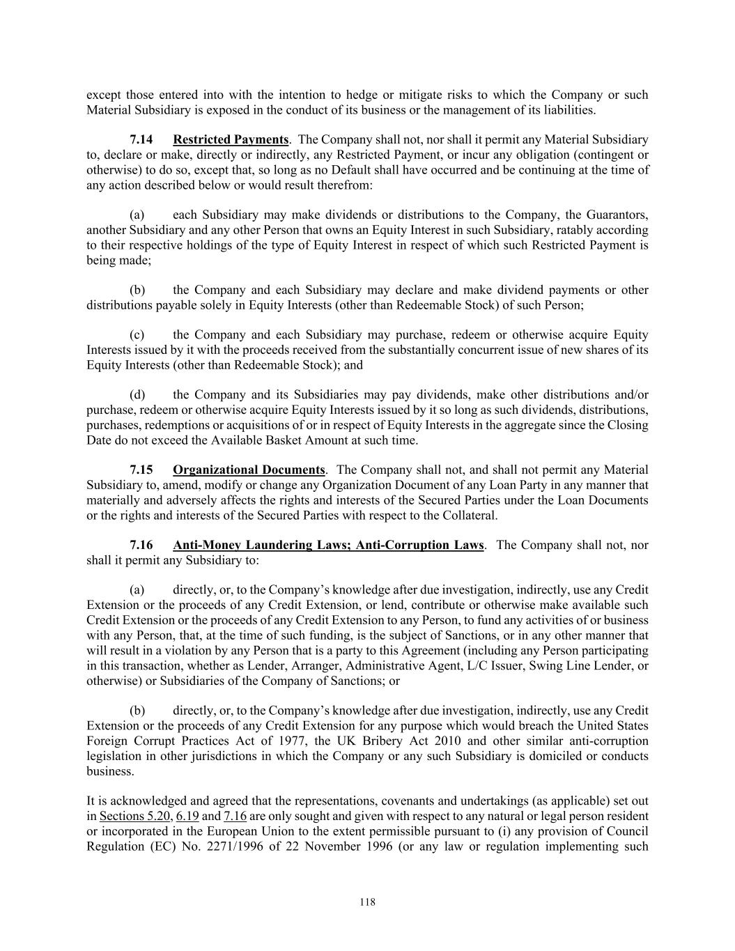 TABLE OF CONTENTS Section Page ii 5.01  Existence, Qualification and Power .................................................................................. 98  5.02  Authorization; No Contravention ..................................................................................... 98  5.03  Governmental Authorization; Other Consents .................................................................. 99  5.04  Binding Effect ................................................................................................................... 99  5.05  Financial Statements; No Material Adverse Effect; Casualty Events ............................... 99  5.06  Litigation ........................................................................................................................... 99  5.07  No Default......................................................................................................................... 99  5.08  Ownership of Property; Liens ......................................................................................... 100  5.09  Environmental Compliance ............................................................................................ 100  5.10  Insurance ......................................................................................................................... 100  5.11  Taxes ............................................................................................................................... 100  5.12  ERISA Compliance ......................................................................................................... 100  5.13  Subsidiaries; Equity Interests .......................................................................................... 101  5.14  Margin Regulations; Investment Company Act.............................................................. 101  5.15  Disclosure ....................................................................................................................... 102  5.16  Compliance with Laws ................................................................................................... 102  5.17  Intellectual Property; Licenses, Etc ................................................................................ 102  5.18  Solvency.......................................................................................................................... 102  5.19  Representations as to Foreign Obligors .......................................................................... 102  5.20  Sanctions Concerns and Anti-Corruption ....................................................................... 104  5.21  Collateral Representations. ............................................................................................. 104  5.22  Affected Financial Institution.. ....................................................................................... 105  5.23  Covered Entities. ............................................................................................................. 105  5.24  Beneficial Ownership Certification.. .............................................................................. 105  ARTICLE VI. AFFIRMATIVE COVENANTS ...................................................................................... 105  6.01  Financial Statements ....................................................................................................... 105  6.02  Certificates; Other Information ....................................................................................... 106  6.03  Notices ............................................................................................................................ 108  6.04  Payment of Obligations .................................................................................................. 108  6.05  Preservation of Existence, Etc ........................................................................................ 108  6.06  Maintenance of Properties .............................................................................................. 108  6.07  Maintenance of Insurance ............................................................................................... 109  6.08  Compliance with Laws ................................................................................................... 109  6.09  Books and Records ......................................................................................................... 109  6.10  Inspection Rights ............................................................................................................ 109  6.11  Use of Proceeds .............................................................................................................. 109  6.12  Compliance with Environmental Laws ........................................................................... 109  6.13  Approvals and Authorizations ........................................................................................ 110  6.14  Notices Regarding Subsidiaries; Covenant to Guarantee and Give Security; Scope of Collateral .......................................................................................................... 110  6.15  Further Assurances ......................................................................................................... 111  6.16  Corporate Ratings ........................................................................................................... 111  6.17  Post-Closing Matters ....................................................................................................... 111  6.18  Pari Passu Ranking ......................................................................................................... 111  6.19  Anti-Money Laundering Laws; Anti-Corruption Laws .............................................
