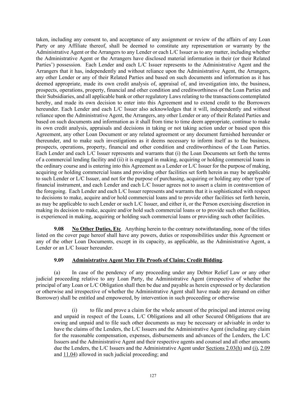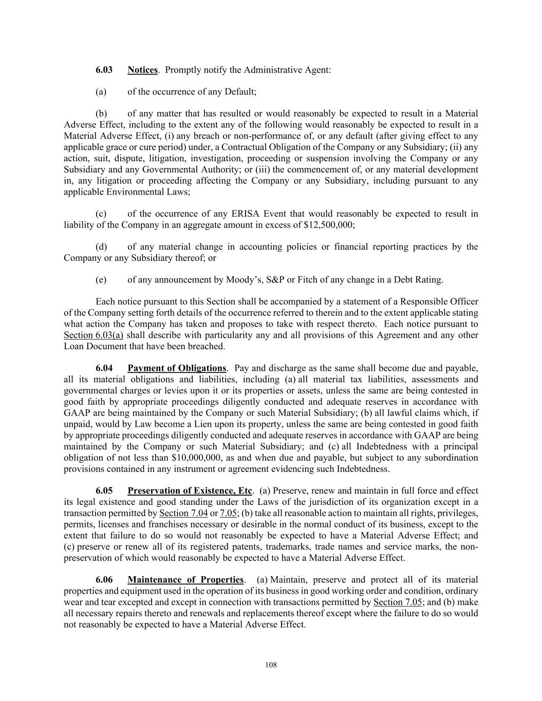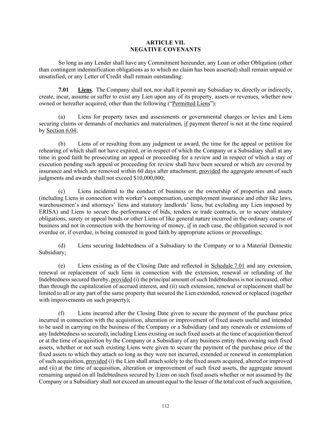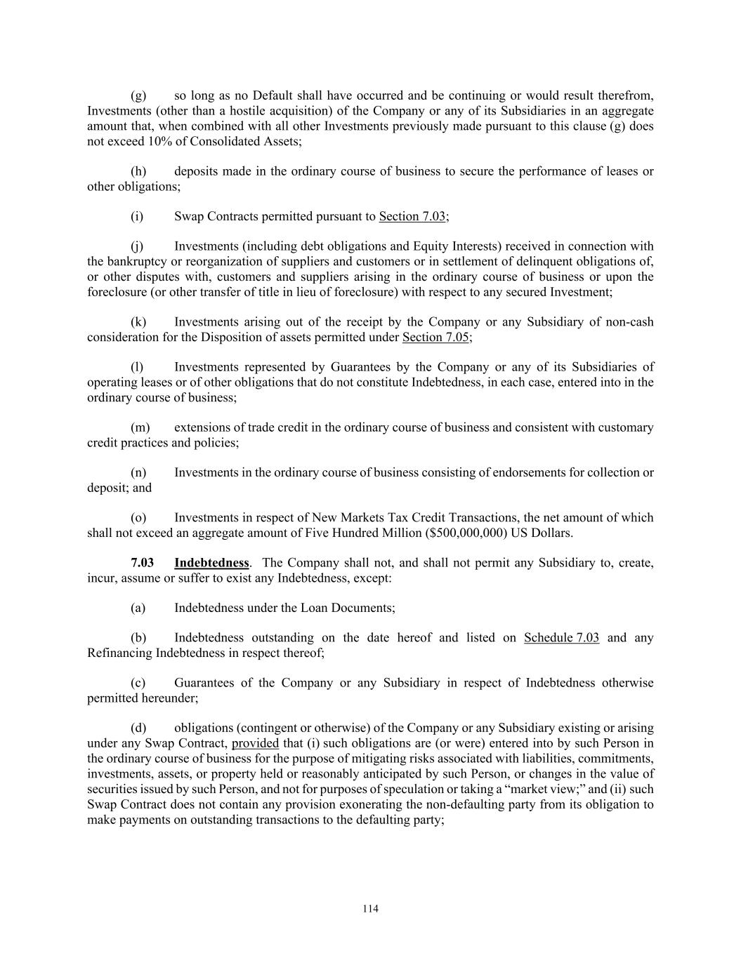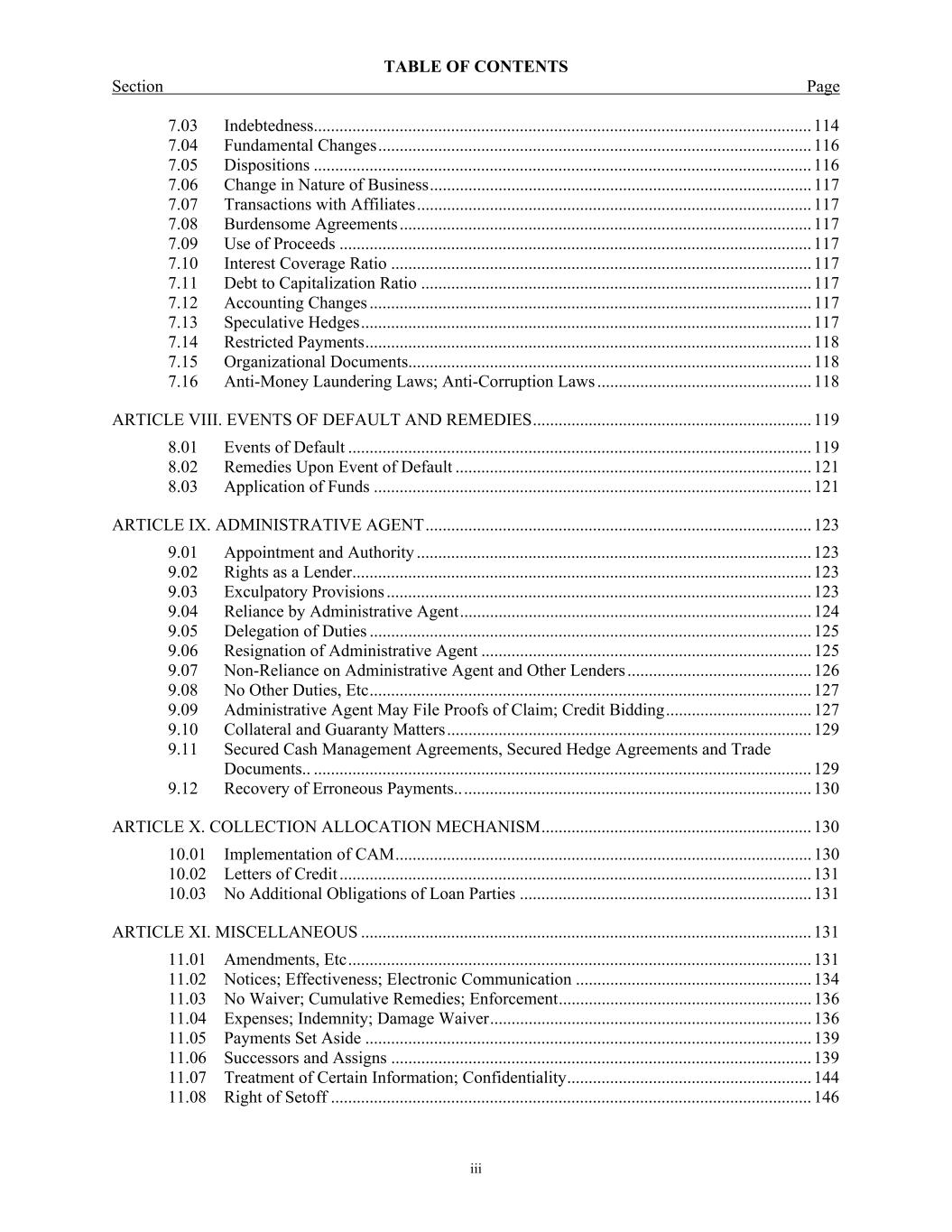 TABLE OF CONTENTS Section Page iii 7.03  Indebtedness .................................................................................................................... 114  7.04  Fundamental Changes ..................................................................................................... 116  7.05  Dispositions .................................................................................................................... 116  7.06  Change in Nature of Business ......................................................................................... 117  7.07  Transactions with Affiliates ............................................................................................ 117  7.08  Burdensome Agreements ................................................................................................ 117  7.09  Use of Proceeds .............................................................................................................. 117  7.10  Interest Coverage Ratio .................................................................................................. 117  7.11  Debt to Capitalization Ratio ........................................................................................... 117  7.12  Accounting Changes ....................................................................................................... 117  7.13  Speculative Hedges ......................................................................................................... 117  7.14  Restricted Payments ........................................................................................................ 118  7.15  Organizational Documents.............................................................................................. 118  7.16  Anti-Money Laundering Laws; Anti-Corruption Laws .................................................. 118  ARTICLE VIII. EVENTS OF DEFAULT AND REMEDIES ................................................................. 119  8.01  Events of Default ............................................................................................................ 119  8.02  Remedies Upon Event of Default ................................................................................... 121  8.03  Application of Funds ...................................................................................................... 121  ARTICLE IX. ADMINISTRATIVE AGENT .......................................................................................... 123  9.01  Appointment and Authority ............................................................................................ 123  9.02  Rights as a Lender ........................................................................................................... 123  9.03  Exculpatory Provisions ................................................................................................... 123  9.04  Reliance by Administrative Agent .................................................................................. 124  9.05  Delegation of Duties ....................................................................................................... 125  9.06  Resignation of Administrative Agent ............................................................................. 125  9.07  Non-Reliance on Administrative Agent and Other Lenders ........................................... 126  9.08  No Other Duties, Etc ....................................................................................................... 127  9.09  Administrative Agent May File Proofs of Claim; Credit Bidding .................................. 127  9.10  Collateral and Guaranty Matters ..................................................................................... 129  9.11  Secured Cash Management Agreements, Secured Hedge Agreements and Trade Documents.. .................................................................................................................... 129  9.12  Recovery of Erroneous Payments.. ................................................................................. 130  ARTICLE X. COLLECTION ALLOCATION MECHANISM ............................................................... 130  10.01  Implementation of CAM ................................................................................................. 130  10.02  Letters of Credit .............................................................................................................. 131  10.03  No Additional Obligations of Loan Parties .................................................................... 131  ARTICLE XI. MISCELLANEOUS ......................................................................................................... 131  11.01  Amendments, Etc ............................................................................................................ 131  11.02  Notices; Effectiveness; Electronic Communication ....................................................... 134  11.03  No Waiver; Cumulative Remedies; Enforcement ........................................................... 136  11.04  Expenses; Indemnity; Damage Waiver ........................................................................... 136  11.05  Payments Set Aside ........................................................................................................ 139  11.06  Successors and Assigns .................................................................................................. 139  11.07  Treatment of Certain Information; Confidentiality ......................................................... 144  11.08  Right of Setoff ................................................................................................................ 146