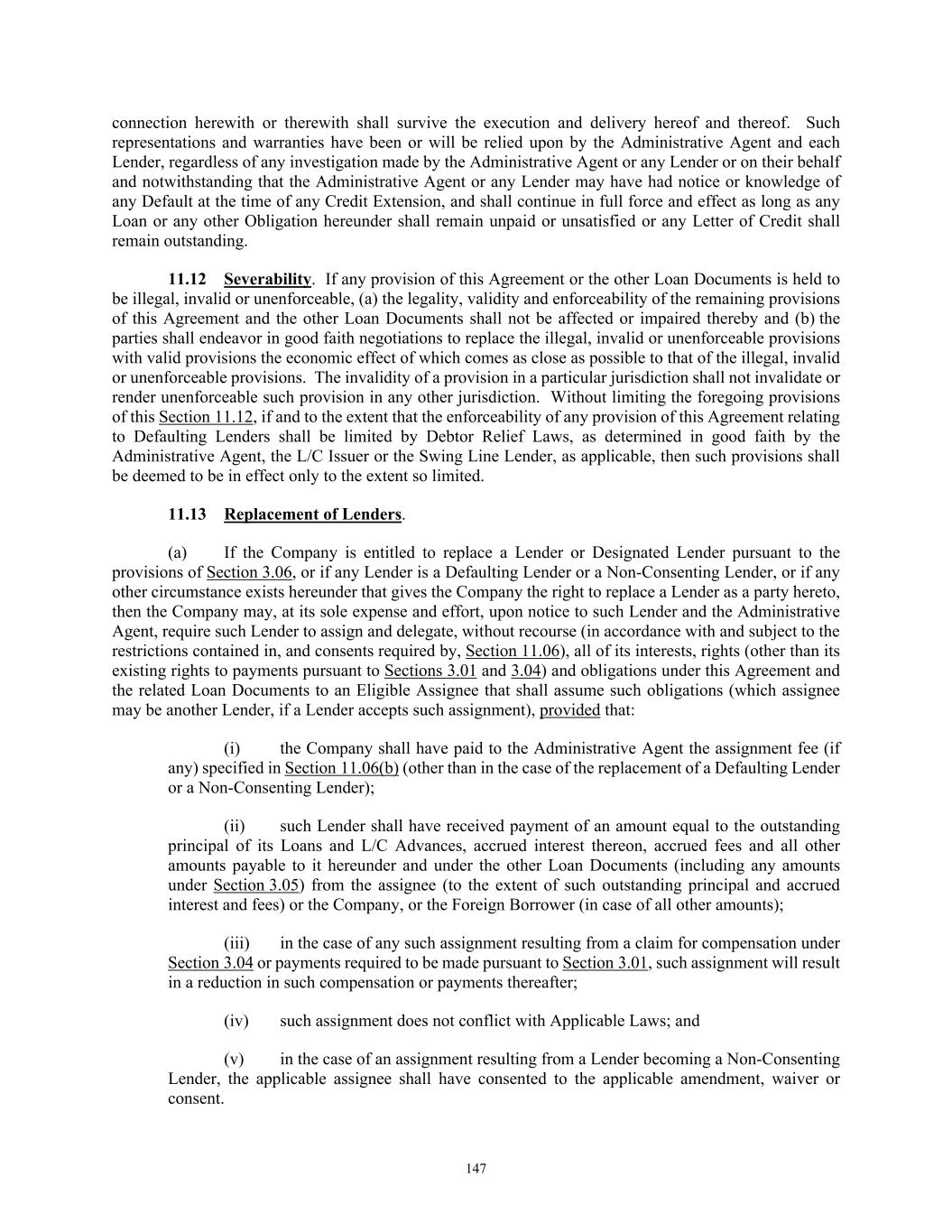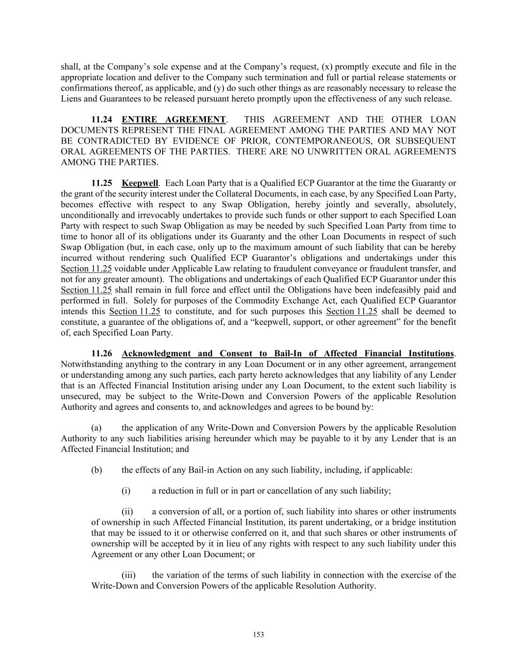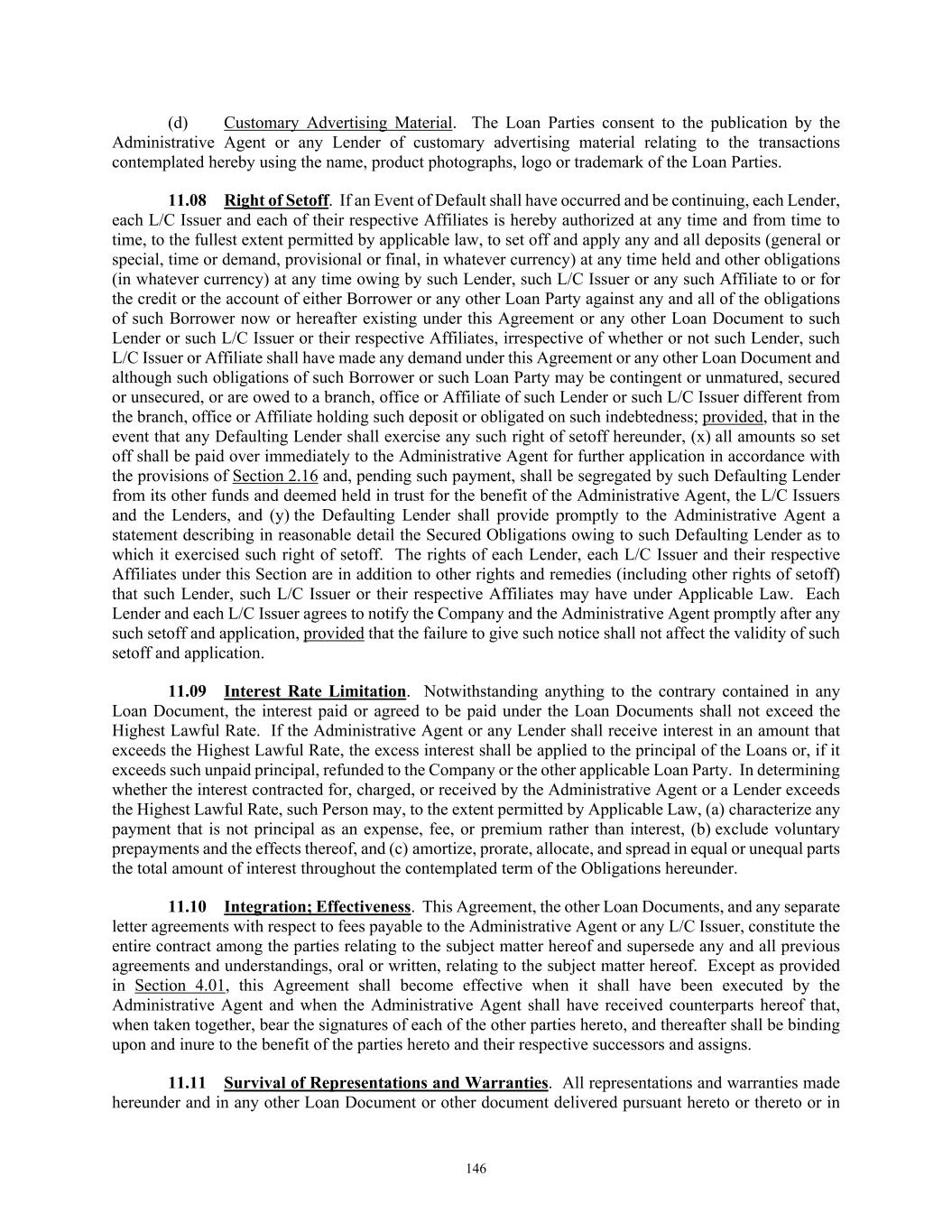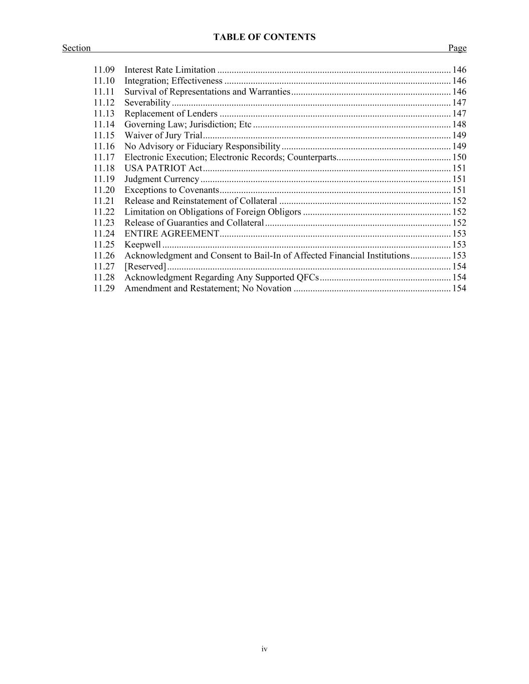 TABLE OF CONTENTS Section Page iv 11.09  Interest Rate Limitation .................................................................................................. 146  11.10  Integration; Effectiveness ............................................................................................... 146  11.11  Survival of Representations and Warranties ................................................................... 146  11.12  Severability ..................................................................................................................... 147  11.13  Replacement of Lenders ................................................................................................. 147  11.14  Governing Law; Jurisdiction; Etc ................................................................................... 148  11.15  Waiver of Jury Trial ........................................................................................................ 149  11.16  No Advisory or Fiduciary Responsibility ....................................................................... 149  11.17  Electronic Execution; Electronic Records; Counterparts.. .............................................. 150  11.18  USA PATRIOT Act ........................................................................................................ 151  11.19  Judgment Currency ......................................................................................................... 151  11.20  Exceptions to Covenants ................................................................................................. 151  11.21  Release and Reinstatement of Collateral ........................................................................ 152  11.22  Limitation on Obligations of Foreign Obligors .............................................................. 152  11.23  Release of Guaranties and Collateral .............................................................................. 152  11.24  ENTIRE AGREEMENT ................................................................................................. 153  11.25  Keepwell ......................................................................................................................... 153  11.26  Acknowledgment and Consent to Bail-In of Affected Financial Institutions ................. 153  11.27  [Reserved] ....................................................................................................................... 154  11.28  Acknowledgment Regarding Any Supported QFCs ....................................................... 154  11.29  Amendment and Restatement; No Novation .................................................................. 154