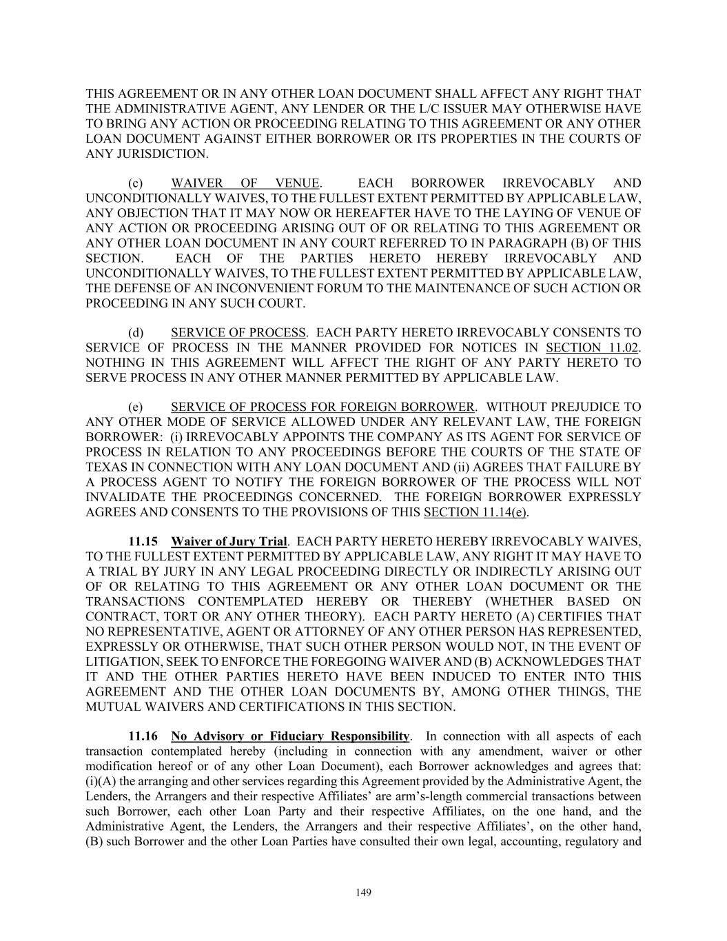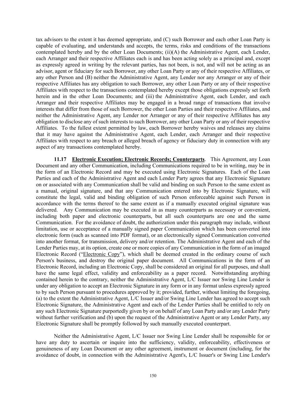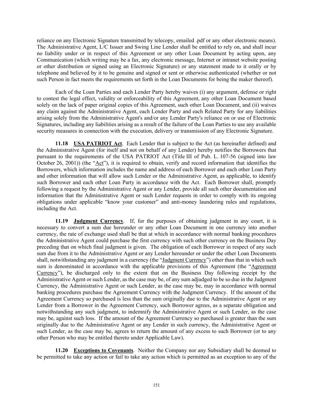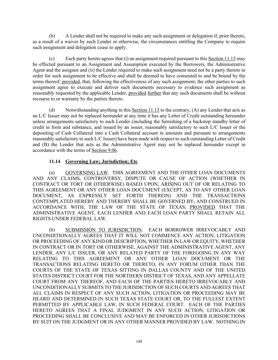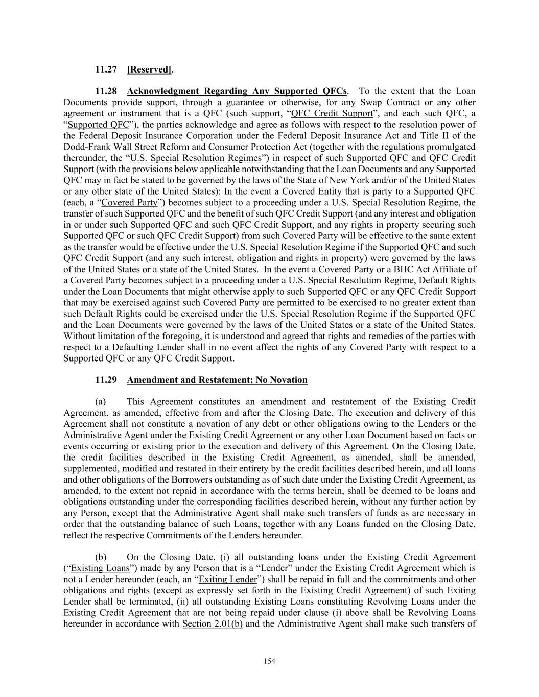 TABLE OF CONTENTS Section Page iv 11.09  Interest Rate Limitation .................................................................................................. 146  11.10  Integration; Effectiveness ............................................................................................... 146  11.11  Survival of Representations and Warranties ................................................................... 146  11.12  Severability ..................................................................................................................... 147  11.13  Replacement of Lenders ................................................................................................. 147  11.14  Governing Law; Jurisdiction; Etc ................................................................................... 148  11.15  Waiver of Jury Trial ........................................................................................................ 149  11.16  No Advisory or Fiduciary Responsibility ....................................................................... 149  11.17  Electronic Execution; Electronic Records; Counterparts.. .............................................. 150  11.18  USA PATRIOT Act ........................................................................................................ 151  11.19  Judgment Currency ......................................................................................................... 151  11.20  Exceptions to Covenants ................................................................................................. 151  11.21  Release and Reinstatement of Collateral ........................................................................ 152  11.22  Limitation on Obligations of Foreign Obligors .............................................................. 152  11.23  Release of Guaranties and Collateral .............................................................................. 152  11.24  ENTIRE AGREEMENT ................................................................................................. 153  11.25  Keepwell ......................................................................................................................... 153  11.26  Acknowledgment and Consent to Bail-In of Affected Financial Institutions ................. 153  11.27  [Reserved] ....................................................................................................................... 154  11.28  Acknowledgment Regarding Any Supported QFCs ....................................................... 154  11.29  Amendment and Restatement; No Novation .................................................................. 154