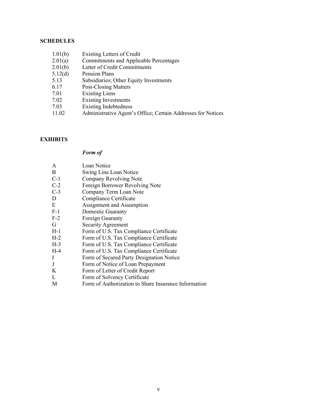 v SCHEDULES 1.01(b) Existing Letters of Credit 2.01(a) Commitments and Applicable Percentages 2.01(b) Letter of Credit Commitments 5.12(d) Pension Plans 5.13 Subsidiaries; Other Equity Investments 6.17 Post-Closing Matters 7.01 Existing Liens 7.02 Existing Investments 7.03 Existing Indebtedness 11.02 Administrative Agent’s Office; Certain Addresses for Notices EXHIBITS Form of A Loan Notice B Swing Line Loan Notice C-1 Company Revolving Note C-2 Foreign Borrower Revolving Note C-3 Company Term Loan Note D Compliance Certificate E Assignment and Assumption F-1 Domestic Guaranty F-2 Foreign Guaranty G Security Agreement H-1 Form of U.S. Tax Compliance Certificate H-2 Form of U.S. Tax Compliance Certificate H-3 Form of U.S. Tax Compliance Certificate H-4 Form of U.S. Tax Compliance Certificate I Form of Secured Party Designation Notice J Form of Notice of Loan Prepayment K L M Form of Letter of Credit Report Form of Solvency Certificate Form of Authorization to Share Insurance Information