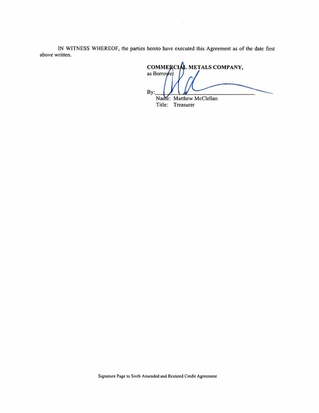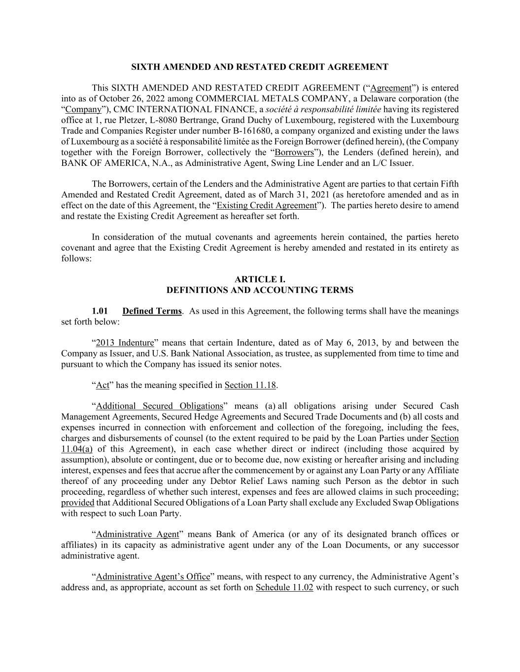 SIXTH AMENDED AND RESTATED CREDIT AGREEMENT This SIXTH AMENDED AND RESTATED CREDIT AGREEMENT (“Agreement”) is entered into as of October 26, 2022 among COMMERCIAL METALS COMPANY, a Delaware corporation (the “Company”), CMC INTERNATIONAL FINANCE, a société à responsabilité limitée having its registered office at 1, rue Pletzer, L-8080 Bertrange, Grand Duchy of Luxembourg, registered with the Luxembourg Trade and Companies Register under number B-161680, a company organized and existing under the laws of Luxembourg as a société à responsabilité limitée as the Foreign Borrower (defined herein), (the Company together with the Foreign Borrower, collectively the “Borrowers”), the Lenders (defined herein), and BANK OF AMERICA, N.A., as Administrative Agent, Swing Line Lender and an L/C Issuer. The Borrowers, certain of the Lenders and the Administrative Agent are parties to that certain Fifth Amended and Restated Credit Agreement, dated as of March 31, 2021 (as heretofore amended and as in effect on the date of this Agreement, the “Existing Credit Agreement”). The parties hereto desire to amend and restate the Existing Credit Agreement as hereafter set forth. In consideration of the mutual covenants and agreements herein contained, the parties hereto covenant and agree that the Existing Credit Agreement is hereby amended and restated in its entirety as follows: ARTICLE I. DEFINITIONS AND ACCOUNTING TERMS 1.01 Defined Terms. As used in this Agreement, the following terms shall have the meanings set forth below: “2013 Indenture” means that certain Indenture, dated as of May 6, 2013, by and between the Company as Issuer, and U.S. Bank National Association, as trustee, as supplemented from time to time and pursuant to which the Company has issued its senior notes. “Act” has the meaning specified in Section 11.18. “Additional Secured Obligations” means (a) all obligations arising under Secured Cash Management Agreements, Secured Hedge Agreements and Secured Trade Documents and (b) all costs and expenses incurred in connection with enforcement and collection of the foregoing, including the fees, charges and disbursements of counsel (to the extent required to be paid by the Loan Parties under Section 11.04(a) of this Agreement), in each case whether direct or indirect (including those acquired by assumption), absolute or contingent, due or to become due, now existing or hereafter arising and including interest, expenses and fees that accrue after the commencement by or against any Loan Party or any Affiliate thereof of any proceeding under any Debtor Relief Laws naming such Person as the debtor in such proceeding, regardless of whether such interest, expenses and fees are allowed claims in such proceeding; provided that Additional Secured Obligations of a Loan Party shall exclude any Excluded Swap Obligations with respect to such Loan Party. “Administrative Agent” means Bank of America (or any of its designated branch offices or affiliates) in its capacity as administrative agent under any of the Loan Documents, or any successor administrative agent. “Administrative Agent’s Office” means, with respect to any currency, the Administrative Agent’s address and, as appropriate, account as set forth on Schedule 11.02 with respect to such currency, or such