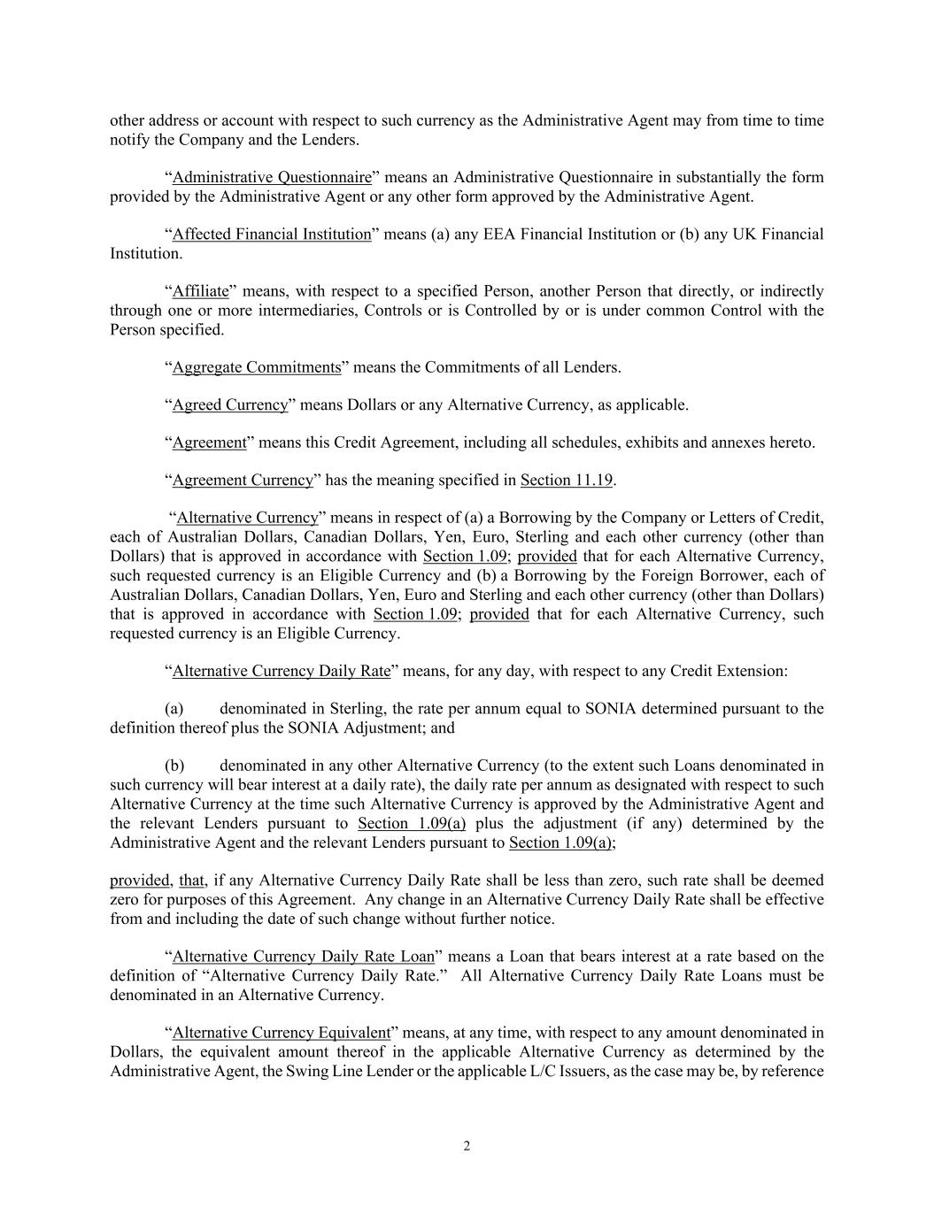 2 other address or account with respect to such currency as the Administrative Agent may from time to time notify the Company and the Lenders. “Administrative Questionnaire” means an Administrative Questionnaire in substantially the form provided by the Administrative Agent or any other form approved by the Administrative Agent. “Affected Financial Institution” means (a) any EEA Financial Institution or (b) any UK Financial Institution. “Affiliate” means, with respect to a specified Person, another Person that directly, or indirectly through one or more intermediaries, Controls or is Controlled by or is under common Control with the Person specified. “Aggregate Commitments” means the Commitments of all Lenders. “Agreed Currency” means Dollars or any Alternative Currency, as applicable. “Agreement” means this Credit Agreement, including all schedules, exhibits and annexes hereto. “Agreement Currency” has the meaning specified in Section 11.19. “Alternative Currency” means in respect of (a) a Borrowing by the Company or Letters of Credit, each of Australian Dollars, Canadian Dollars, Yen, Euro, Sterling and each other currency (other than Dollars) that is approved in accordance with Section 1.09; provided that for each Alternative Currency, such requested currency is an Eligible Currency and (b) a Borrowing by the Foreign Borrower, each of Australian Dollars, Canadian Dollars, Yen, Euro and Sterling and each other currency (other than Dollars) that is approved in accordance with Section 1.09; provided that for each Alternative Currency, such requested currency is an Eligible Currency. “Alternative Currency Daily Rate” means, for any day, with respect to any Credit Extension: (a) denominated in Sterling, the rate per annum equal to SONIA determined pursuant to the definition thereof plus the SONIA Adjustment; and (b) denominated in any other Alternative Currency (to the extent such Loans denominated in such currency will bear interest at a daily rate), the daily rate per annum as designated with respect to such Alternative Currency at the time such Alternative Currency is approved by the Administrative Agent and the relevant Lenders pursuant to Section 1.09(a) plus the adjustment (if any) determined by the Administrative Agent and the relevant Lenders pursuant to Section 1.09(a); provided, that, if any Alternative Currency Daily Rate shall be less than zero, such rate shall be deemed zero for purposes of this Agreement. Any change in an Alternative Currency Daily Rate shall be effective from and including the date of such change without further notice. “Alternative Currency Daily Rate Loan” means a Loan that bears interest at a rate based on the definition of “Alternative Currency Daily Rate.” All Alternative Currency Daily Rate Loans must be denominated in an Alternative Currency. “Alternative Currency Equivalent” means, at any time, with respect to any amount denominated in Dollars, the equivalent amount thereof in the applicable Alternative Currency as determined by the Administrative Agent, the Swing Line Lender or the applicable L/C Issuers, as the case may be, by reference