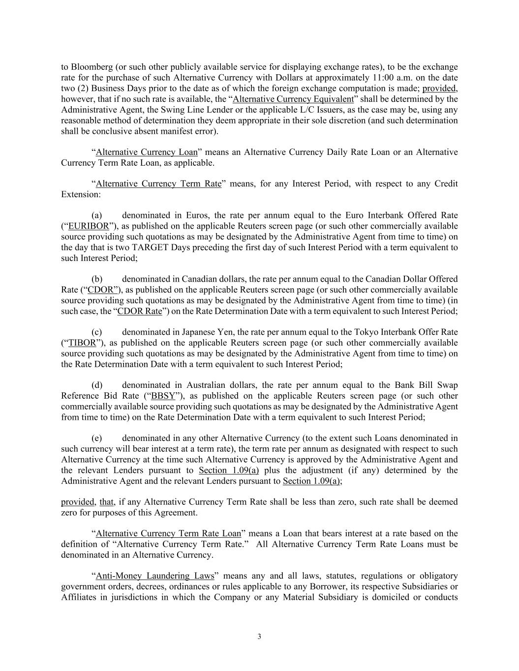 3 to Bloomberg (or such other publicly available service for displaying exchange rates), to be the exchange rate for the purchase of such Alternative Currency with Dollars at approximately 11:00 a.m. on the date two (2) Business Days prior to the date as of which the foreign exchange computation is made; provided, however, that if no such rate is available, the “Alternative Currency Equivalent” shall be determined by the Administrative Agent, the Swing Line Lender or the applicable L/C Issuers, as the case may be, using any reasonable method of determination they deem appropriate in their sole discretion (and such determination shall be conclusive absent manifest error). “Alternative Currency Loan” means an Alternative Currency Daily Rate Loan or an Alternative Currency Term Rate Loan, as applicable. “Alternative Currency Term Rate” means, for any Interest Period, with respect to any Credit Extension: (a) denominated in Euros, the rate per annum equal to the Euro Interbank Offered Rate (“EURIBOR”), as published on the applicable Reuters screen page (or such other commercially available source providing such quotations as may be designated by the Administrative Agent from time to time) on the day that is two TARGET Days preceding the first day of such Interest Period with a term equivalent to such Interest Period; (b) denominated in Canadian dollars, the rate per annum equal to the Canadian Dollar Offered Rate (“CDOR”), as published on the applicable Reuters screen page (or such other commercially available source providing such quotations as may be designated by the Administrative Agent from time to time) (in such case, the “CDOR Rate”) on the Rate Determination Date with a term equivalent to such Interest Period; (c) denominated in Japanese Yen, the rate per annum equal to the Tokyo Interbank Offer Rate (“TIBOR”), as published on the applicable Reuters screen page (or such other commercially available source providing such quotations as may be designated by the Administrative Agent from time to time) on the Rate Determination Date with a term equivalent to such Interest Period; (d) denominated in Australian dollars, the rate per annum equal to the Bank Bill Swap Reference Bid Rate (“BBSY”), as published on the applicable Reuters screen page (or such other commercially available source providing such quotations as may be designated by the Administrative Agent from time to time) on the Rate Determination Date with a term equivalent to such Interest Period; (e) denominated in any other Alternative Currency (to the extent such Loans denominated in such currency will bear interest at a term rate), the term rate per annum as designated with respect to such Alternative Currency at the time such Alternative Currency is approved by the Administrative Agent and the relevant Lenders pursuant to Section 1.09(a) plus the adjustment (if any) determined by the Administrative Agent and the relevant Lenders pursuant to Section 1.09(a); provided, that, if any Alternative Currency Term Rate shall be less than zero, such rate shall be deemed zero for purposes of this Agreement. “Alternative Currency Term Rate Loan” means a Loan that bears interest at a rate based on the definition of “Alternative Currency Term Rate.” All Alternative Currency Term Rate Loans must be denominated in an Alternative Currency. “Anti-Money Laundering Laws” means any and all laws, statutes, regulations or obligatory government orders, decrees, ordinances or rules applicable to any Borrower, its respective Subsidiaries or Affiliates in jurisdictions in which the Company or any Material Subsidiary is domiciled or conducts