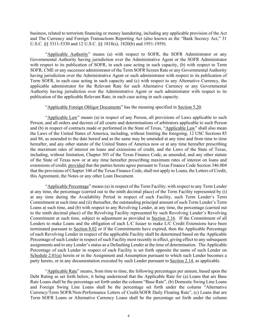4 business, related to terrorism financing or money laundering, including any applicable provision of the Act and The Currency and Foreign Transactions Reporting Act (also known as the “Bank Secrecy Act,” 31 U.S.C. §§ 5311-5330 and 12 U.S.C. §§ 1818(s), 1820(b) and 1951-1959). “Applicable Authority” means (a) with respect to SOFR, the SOFR Administrator or any Governmental Authority having jurisdiction over the Administrative Agent or the SOFR Administrator with respect to its publication of SOFR, in each case acting in such capacity, (b) with respect to Term SOFR, CME or any successor administrator of the Term SOFR Screen Rate or any Governmental Authority having jurisdiction over the Administrative Agent or such administrator with respect to its publication of Term SOFR, in each case acting in such capacity and (c) with respect to any Alternative Currency, the applicable administrator for the Relevant Rate for such Alternative Currency or any Governmental Authority having jurisdiction over the Administrative Agent or such administrator with respect to its publication of the applicable Relevant Rate, in each case acting in such capacity. “Applicable Foreign Obligor Documents” has the meaning specified in Section 5.20. “Applicable Law” means (a) in respect of any Person, all provisions of Laws applicable to such Person, and all orders and decrees of all courts and determinations of arbitrators applicable to such Person and (b) in respect of contracts made or performed in the State of Texas, “Applicable Law” shall also mean the Laws of the United States of America, including, without limiting the foregoing, 12 USC Sections 85 and 86, as amended to the date hereof and as the same may be amended at any time and from time to time hereafter, and any other statute of the United States of America now or at any time hereafter prescribing the maximum rates of interest on loans and extensions of credit, and the Laws of the State of Texas, including, without limitation, Chapter 303 of the Texas Finance Code, as amended, and any other statute of the State of Texas now or at any time hereafter prescribing maximum rates of interest on loans and extensions of credit; provided that the parties hereto agree pursuant to Texas Finance Code Section 346.004 that the provisions of Chapter 346 of the Texas Finance Code, shall not apply to Loans, the Letters of Credit, this Agreement, the Notes or any other Loan Document. “Applicable Percentage” means (a) in respect of the Term Facility, with respect to any Term Lender at any time, the percentage (carried out to the ninth decimal place) of the Term Facility represented by (i) at any time during the Availability Period in respect of such Facility, such Term Lender’s Term Commitment at such time and (ii) thereafter, the outstanding principal amount of such Term Lender’s Term Loans at such time, and (b) with respect to any Revolving Lender, at any time, the percentage (carried out to the ninth decimal place) of the Revolving Facility represented by such Revolving Lender’s Revolving Commitment at such time, subject to adjustment as provided in Section 2.16. If the Commitment of all Lenders to make Loans and the obligation of each L/C Issuer to make L/C Credit Extensions have been terminated pursuant to Section 8.02 or if the Commitments have expired, then the Applicable Percentage of each Revolving Lender in respect of the applicable Facility shall be determined based on the Applicable Percentage of such Lender in respect of such Facility most recently in effect, giving effect to any subsequent assignments and to any Lender’s status as a Defaulting Lender at the time of determination. The Applicable Percentage of each Lender in respect of each Facility is set forth opposite the name of such Lender on Schedule 2.01(a) herein or in the Assignment and Assumption pursuant to which such Lender becomes a party hereto, or in any documentation executed by such Lender pursuant to Section 2.14, as applicable. “Applicable Rate” means, from time to time, the following percentages per annum, based upon the Debt Rating as set forth below, it being understood that the Applicable Rate for (a) Loans that are Base Rate Loans shall be the percentage set forth under the column “Base Rate”, (b) Domestic Swing Line Loans and Foreign Swing Line Loans shall be the percentage set forth under the column “Alternative Currency/Term SOFR/Non-Performance Letters of Credit/SOFR Daily Floating Rate”, (c) Loans that are Term SOFR Loans or Alternative Currency Loans shall be the percentage set forth under the column