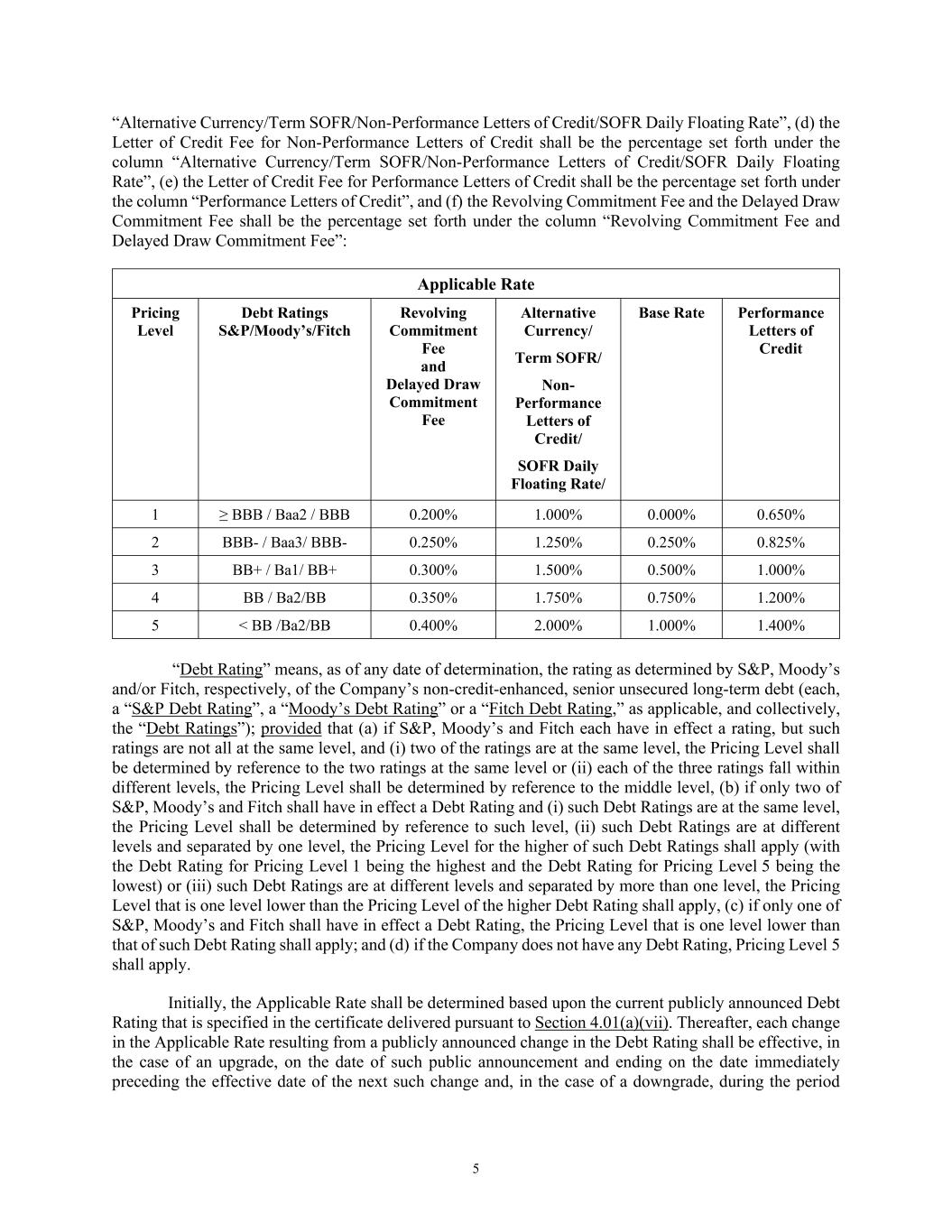 5 “Alternative Currency/Term SOFR/Non-Performance Letters of Credit/SOFR Daily Floating Rate”, (d) the Letter of Credit Fee for Non-Performance Letters of Credit shall be the percentage set forth under the column “Alternative Currency/Term SOFR/Non-Performance Letters of Credit/SOFR Daily Floating Rate”, (e) the Letter of Credit Fee for Performance Letters of Credit shall be the percentage set forth under the column “Performance Letters of Credit”, and (f) the Revolving Commitment Fee and the Delayed Draw Commitment Fee shall be the percentage set forth under the column “Revolving Commitment Fee and Delayed Draw Commitment Fee”: Applicable Rate Pricing Level Debt Ratings S&P/Moody’s/Fitch Revolving Commitment Fee and Delayed Draw Commitment Fee Alternative Currency/ Term SOFR/ Non- Performance Letters of Credit/ SOFR Daily Floating Rate/ Base Rate Performance Letters of Credit 1 ≥ BBB / Baa2 / BBB 0.200% 1.000% 0.000% 0.650% 2 BBB- / Baa3/ BBB- 0.250% 1.250% 0.250% 0.825% 3 BB+ / Ba1/ BB+ 0.300% 1.500% 0.500% 1.000% 4 BB / Ba2/BB 0.350% 1.750% 0.750% 1.200% 5 < BB /Ba2/BB 0.400% 2.000% 1.000% 1.400% “Debt Rating” means, as of any date of determination, the rating as determined by S&P, Moody’s and/or Fitch, respectively, of the Company’s non-credit-enhanced, senior unsecured long-term debt (each, a “S&P Debt Rating”, a “Moody’s Debt Rating” or a “Fitch Debt Rating,” as applicable, and collectively, the “Debt Ratings”); provided that (a) if S&P, Moody’s and Fitch each have in effect a rating, but such ratings are not all at the same level, and (i) two of the ratings are at the same level, the Pricing Level shall be determined by reference to the two ratings at the same level or (ii) each of the three ratings fall within different levels, the Pricing Level shall be determined by reference to the middle level, (b) if only two of S&P, Moody’s and Fitch shall have in effect a Debt Rating and (i) such Debt Ratings are at the same level, the Pricing Level shall be determined by reference to such level, (ii) such Debt Ratings are at different levels and separated by one level, the Pricing Level for the higher of such Debt Ratings shall apply (with the Debt Rating for Pricing Level 1 being the highest and the Debt Rating for Pricing Level 5 being the lowest) or (iii) such Debt Ratings are at different levels and separated by more than one level, the Pricing Level that is one level lower than the Pricing Level of the higher Debt Rating shall apply, (c) if only one of S&P, Moody’s and Fitch shall have in effect a Debt Rating, the Pricing Level that is one level lower than that of such Debt Rating shall apply; and (d) if the Company does not have any Debt Rating, Pricing Level 5 shall apply. Initially, the Applicable Rate shall be determined based upon the current publicly announced Debt Rating that is specified in the certificate delivered pursuant to Section 4.01(a)(vii). Thereafter, each change in the Applicable Rate resulting from a publicly announced change in the Debt Rating shall be effective, in the case of an upgrade, on the date of such public announcement and ending on the date immediately preceding the effective date of the next such change and, in the case of a downgrade, during the period