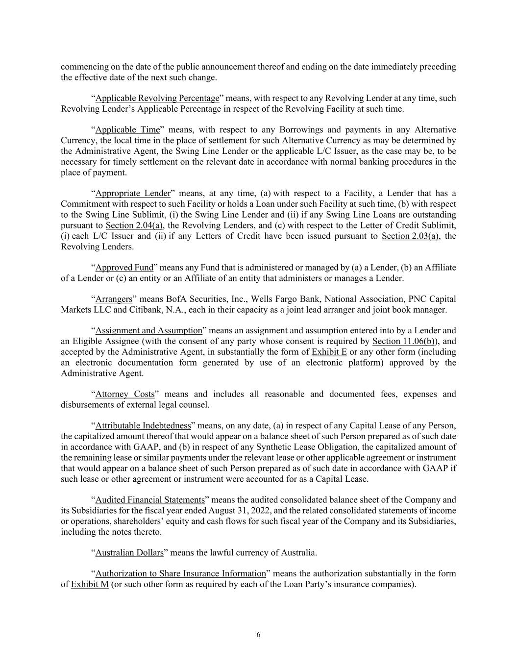 6 commencing on the date of the public announcement thereof and ending on the date immediately preceding the effective date of the next such change. “Applicable Revolving Percentage” means, with respect to any Revolving Lender at any time, such Revolving Lender’s Applicable Percentage in respect of the Revolving Facility at such time. “Applicable Time” means, with respect to any Borrowings and payments in any Alternative Currency, the local time in the place of settlement for such Alternative Currency as may be determined by the Administrative Agent, the Swing Line Lender or the applicable L/C Issuer, as the case may be, to be necessary for timely settlement on the relevant date in accordance with normal banking procedures in the place of payment. “Appropriate Lender” means, at any time, (a) with respect to a Facility, a Lender that has a Commitment with respect to such Facility or holds a Loan under such Facility at such time, (b) with respect to the Swing Line Sublimit, (i) the Swing Line Lender and (ii) if any Swing Line Loans are outstanding pursuant to Section 2.04(a), the Revolving Lenders, and (c) with respect to the Letter of Credit Sublimit, (i) each L/C Issuer and (ii) if any Letters of Credit have been issued pursuant to Section 2.03(a), the Revolving Lenders. “Approved Fund” means any Fund that is administered or managed by (a) a Lender, (b) an Affiliate of a Lender or (c) an entity or an Affiliate of an entity that administers or manages a Lender. “Arrangers” means BofA Securities, Inc., Wells Fargo Bank, National Association, PNC Capital Markets LLC and Citibank, N.A., each in their capacity as a joint lead arranger and joint book manager. “Assignment and Assumption” means an assignment and assumption entered into by a Lender and an Eligible Assignee (with the consent of any party whose consent is required by Section 11.06(b)), and accepted by the Administrative Agent, in substantially the form of Exhibit E or any other form (including an electronic documentation form generated by use of an electronic platform) approved by the Administrative Agent. “Attorney Costs” means and includes all reasonable and documented fees, expenses and disbursements of external legal counsel. “Attributable Indebtedness” means, on any date, (a) in respect of any Capital Lease of any Person, the capitalized amount thereof that would appear on a balance sheet of such Person prepared as of such date in accordance with GAAP, and (b) in respect of any Synthetic Lease Obligation, the capitalized amount of the remaining lease or similar payments under the relevant lease or other applicable agreement or instrument that would appear on a balance sheet of such Person prepared as of such date in accordance with GAAP if such lease or other agreement or instrument were accounted for as a Capital Lease. “Audited Financial Statements” means the audited consolidated balance sheet of the Company and its Subsidiaries for the fiscal year ended August 31, 2022, and the related consolidated statements of income or operations, shareholders’ equity and cash flows for such fiscal year of the Company and its Subsidiaries, including the notes thereto. “Australian Dollars” means the lawful currency of Australia. “Authorization to Share Insurance Information” means the authorization substantially in the form of Exhibit M (or such other form as required by each of the Loan Party’s insurance companies).