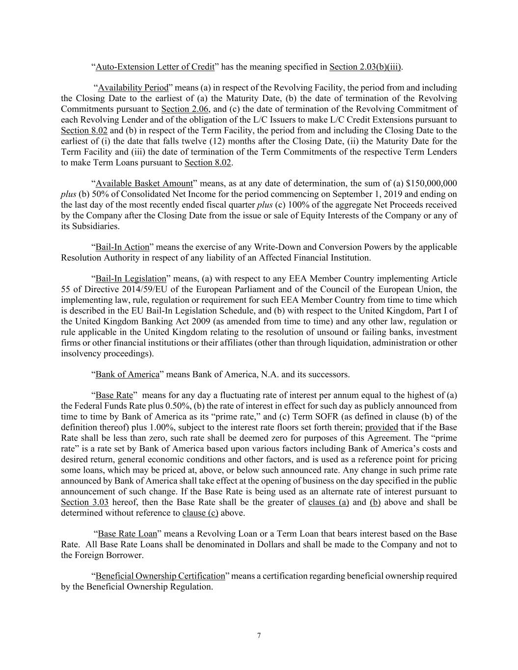 7 “Auto-Extension Letter of Credit” has the meaning specified in Section 2.03(b)(iii). “Availability Period” means (a) in respect of the Revolving Facility, the period from and including the Closing Date to the earliest of (a) the Maturity Date, (b) the date of termination of the Revolving Commitments pursuant to Section 2.06, and (c) the date of termination of the Revolving Commitment of each Revolving Lender and of the obligation of the L/C Issuers to make L/C Credit Extensions pursuant to Section 8.02 and (b) in respect of the Term Facility, the period from and including the Closing Date to the earliest of (i) the date that falls twelve (12) months after the Closing Date, (ii) the Maturity Date for the Term Facility and (iii) the date of termination of the Term Commitments of the respective Term Lenders to make Term Loans pursuant to Section 8.02. “Available Basket Amount” means, as at any date of determination, the sum of (a) $150,000,000 plus (b) 50% of Consolidated Net Income for the period commencing on September 1, 2019 and ending on the last day of the most recently ended fiscal quarter plus (c) 100% of the aggregate Net Proceeds received by the Company after the Closing Date from the issue or sale of Equity Interests of the Company or any of its Subsidiaries. “Bail-In Action” means the exercise of any Write-Down and Conversion Powers by the applicable Resolution Authority in respect of any liability of an Affected Financial Institution. “Bail-In Legislation” means, (a) with respect to any EEA Member Country implementing Article 55 of Directive 2014/59/EU of the European Parliament and of the Council of the European Union, the implementing law, rule, regulation or requirement for such EEA Member Country from time to time which is described in the EU Bail-In Legislation Schedule, and (b) with respect to the United Kingdom, Part I of the United Kingdom Banking Act 2009 (as amended from time to time) and any other law, regulation or rule applicable in the United Kingdom relating to the resolution of unsound or failing banks, investment firms or other financial institutions or their affiliates (other than through liquidation, administration or other insolvency proceedings). “Bank of America” means Bank of America, N.A. and its successors. “Base Rate” means for any day a fluctuating rate of interest per annum equal to the highest of (a) the Federal Funds Rate plus 0.50%, (b) the rate of interest in effect for such day as publicly announced from time to time by Bank of America as its “prime rate,” and (c) Term SOFR (as defined in clause (b) of the definition thereof) plus 1.00%, subject to the interest rate floors set forth therein; provided that if the Base Rate shall be less than zero, such rate shall be deemed zero for purposes of this Agreement. The “prime rate” is a rate set by Bank of America based upon various factors including Bank of America’s costs and desired return, general economic conditions and other factors, and is used as a reference point for pricing some loans, which may be priced at, above, or below such announced rate. Any change in such prime rate announced by Bank of America shall take effect at the opening of business on the day specified in the public announcement of such change. If the Base Rate is being used as an alternate rate of interest pursuant to Section 3.03 hereof, then the Base Rate shall be the greater of clauses (a) and (b) above and shall be determined without reference to clause (c) above. “Base Rate Loan” means a Revolving Loan or a Term Loan that bears interest based on the Base Rate. All Base Rate Loans shall be denominated in Dollars and shall be made to the Company and not to the Foreign Borrower. “Beneficial Ownership Certification” means a certification regarding beneficial ownership required by the Beneficial Ownership Regulation.