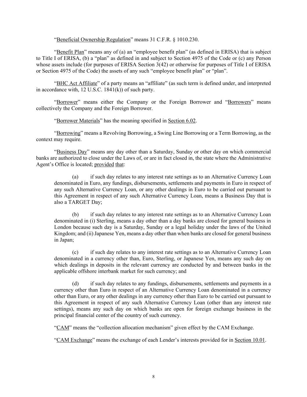8 “Beneficial Ownership Regulation” means 31 C.F.R. § 1010.230. “Benefit Plan” means any of (a) an “employee benefit plan” (as defined in ERISA) that is subject to Title I of ERISA, (b) a “plan” as defined in and subject to Section 4975 of the Code or (c) any Person whose assets include (for purposes of ERISA Section 3(42) or otherwise for purposes of Title I of ERISA or Section 4975 of the Code) the assets of any such “employee benefit plan” or “plan”. “BHC Act Affiliate” of a party means an “affiliate” (as such term is defined under, and interpreted in accordance with, 12 U.S.C. 1841(k)) of such party. “Borrower” means either the Company or the Foreign Borrower and “Borrowers” means collectively the Company and the Foreign Borrower. “Borrower Materials” has the meaning specified in Section 6.02. “Borrowing” means a Revolving Borrowing, a Swing Line Borrowing or a Term Borrowing, as the context may require. “Business Day” means any day other than a Saturday, Sunday or other day on which commercial banks are authorized to close under the Laws of, or are in fact closed in, the state where the Administrative Agent’s Office is located; provided that: (a) if such day relates to any interest rate settings as to an Alternative Currency Loan denominated in Euro, any fundings, disbursements, settlements and payments in Euro in respect of any such Alternative Currency Loan, or any other dealings in Euro to be carried out pursuant to this Agreement in respect of any such Alternative Currency Loan, means a Business Day that is also a TARGET Day; (b) if such day relates to any interest rate settings as to an Alternative Currency Loan denominated in (i) Sterling, means a day other than a day banks are closed for general business in London because such day is a Saturday, Sunday or a legal holiday under the laws of the United Kingdom; and (ii) Japanese Yen, means a day other than when banks are closed for general business in Japan; (c) if such day relates to any interest rate settings as to an Alternative Currency Loan denominated in a currency other than, Euro, Sterling, or Japanese Yen, means any such day on which dealings in deposits in the relevant currency are conducted by and between banks in the applicable offshore interbank market for such currency; and (d) if such day relates to any fundings, disbursements, settlements and payments in a currency other than Euro in respect of an Alternative Currency Loan denominated in a currency other than Euro, or any other dealings in any currency other than Euro to be carried out pursuant to this Agreement in respect of any such Alternative Currency Loan (other than any interest rate settings), means any such day on which banks are open for foreign exchange business in the principal financial center of the country of such currency. “CAM” means the “collection allocation mechanism” given effect by the CAM Exchange. “CAM Exchange” means the exchange of each Lender’s interests provided for in Section 10.01.