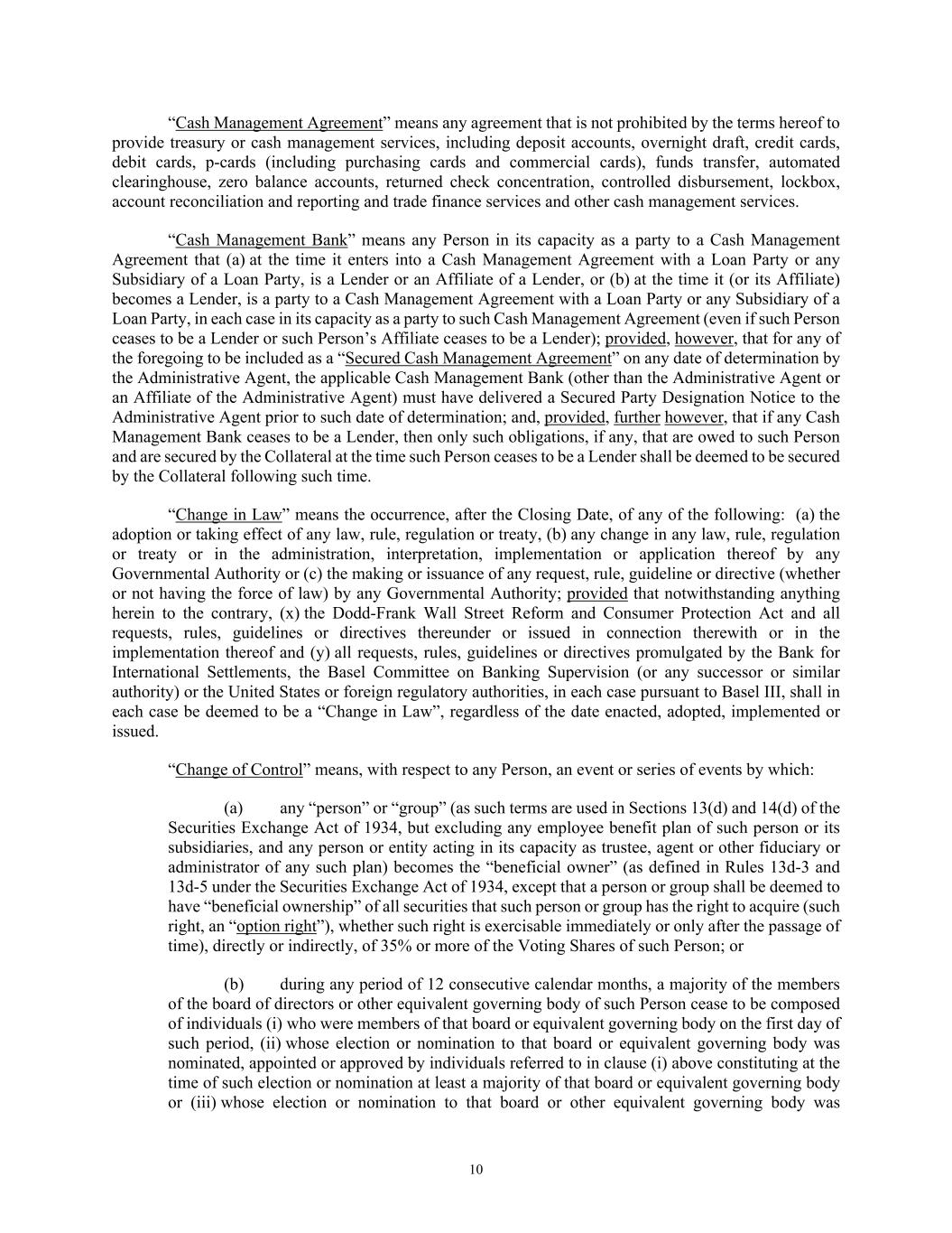 10 “Cash Management Agreement” means any agreement that is not prohibited by the terms hereof to provide treasury or cash management services, including deposit accounts, overnight draft, credit cards, debit cards, p-cards (including purchasing cards and commercial cards), funds transfer, automated clearinghouse, zero balance accounts, returned check concentration, controlled disbursement, lockbox, account reconciliation and reporting and trade finance services and other cash management services. “Cash Management Bank” means any Person in its capacity as a party to a Cash Management Agreement that (a) at the time it enters into a Cash Management Agreement with a Loan Party or any Subsidiary of a Loan Party, is a Lender or an Affiliate of a Lender, or (b) at the time it (or its Affiliate) becomes a Lender, is a party to a Cash Management Agreement with a Loan Party or any Subsidiary of a Loan Party, in each case in its capacity as a party to such Cash Management Agreement (even if such Person ceases to be a Lender or such Person’s Affiliate ceases to be a Lender); provided, however, that for any of the foregoing to be included as a “Secured Cash Management Agreement” on any date of determination by the Administrative Agent, the applicable Cash Management Bank (other than the Administrative Agent or an Affiliate of the Administrative Agent) must have delivered a Secured Party Designation Notice to the Administrative Agent prior to such date of determination; and, provided, further however, that if any Cash Management Bank ceases to be a Lender, then only such obligations, if any, that are owed to such Person and are secured by the Collateral at the time such Person ceases to be a Lender shall be deemed to be secured by the Collateral following such time. “Change in Law” means the occurrence, after the Closing Date, of any of the following: (a) the adoption or taking effect of any law, rule, regulation or treaty, (b) any change in any law, rule, regulation or treaty or in the administration, interpretation, implementation or application thereof by any Governmental Authority or (c) the making or issuance of any request, rule, guideline or directive (whether or not having the force of law) by any Governmental Authority; provided that notwithstanding anything herein to the contrary, (x) the Dodd-Frank Wall Street Reform and Consumer Protection Act and all requests, rules, guidelines or directives thereunder or issued in connection therewith or in the implementation thereof and (y) all requests, rules, guidelines or directives promulgated by the Bank for International Settlements, the Basel Committee on Banking Supervision (or any successor or similar authority) or the United States or foreign regulatory authorities, in each case pursuant to Basel III, shall in each case be deemed to be a “Change in Law”, regardless of the date enacted, adopted, implemented or issued. “Change of Control” means, with respect to any Person, an event or series of events by which: (a) any “person” or “group” (as such terms are used in Sections 13(d) and 14(d) of the Securities Exchange Act of 1934, but excluding any employee benefit plan of such person or its subsidiaries, and any person or entity acting in its capacity as trustee, agent or other fiduciary or administrator of any such plan) becomes the “beneficial owner” (as defined in Rules 13d-3 and 13d-5 under the Securities Exchange Act of 1934, except that a person or group shall be deemed to have “beneficial ownership” of all securities that such person or group has the right to acquire (such right, an “option right”), whether such right is exercisable immediately or only after the passage of time), directly or indirectly, of 35% or more of the Voting Shares of such Person; or (b) during any period of 12 consecutive calendar months, a majority of the members of the board of directors or other equivalent governing body of such Person cease to be composed of individuals (i) who were members of that board or equivalent governing body on the first day of such period, (ii) whose election or nomination to that board or equivalent governing body was nominated, appointed or approved by individuals referred to in clause (i) above constituting at the time of such election or nomination at least a majority of that board or equivalent governing body or (iii) whose election or nomination to that board or other equivalent governing body was