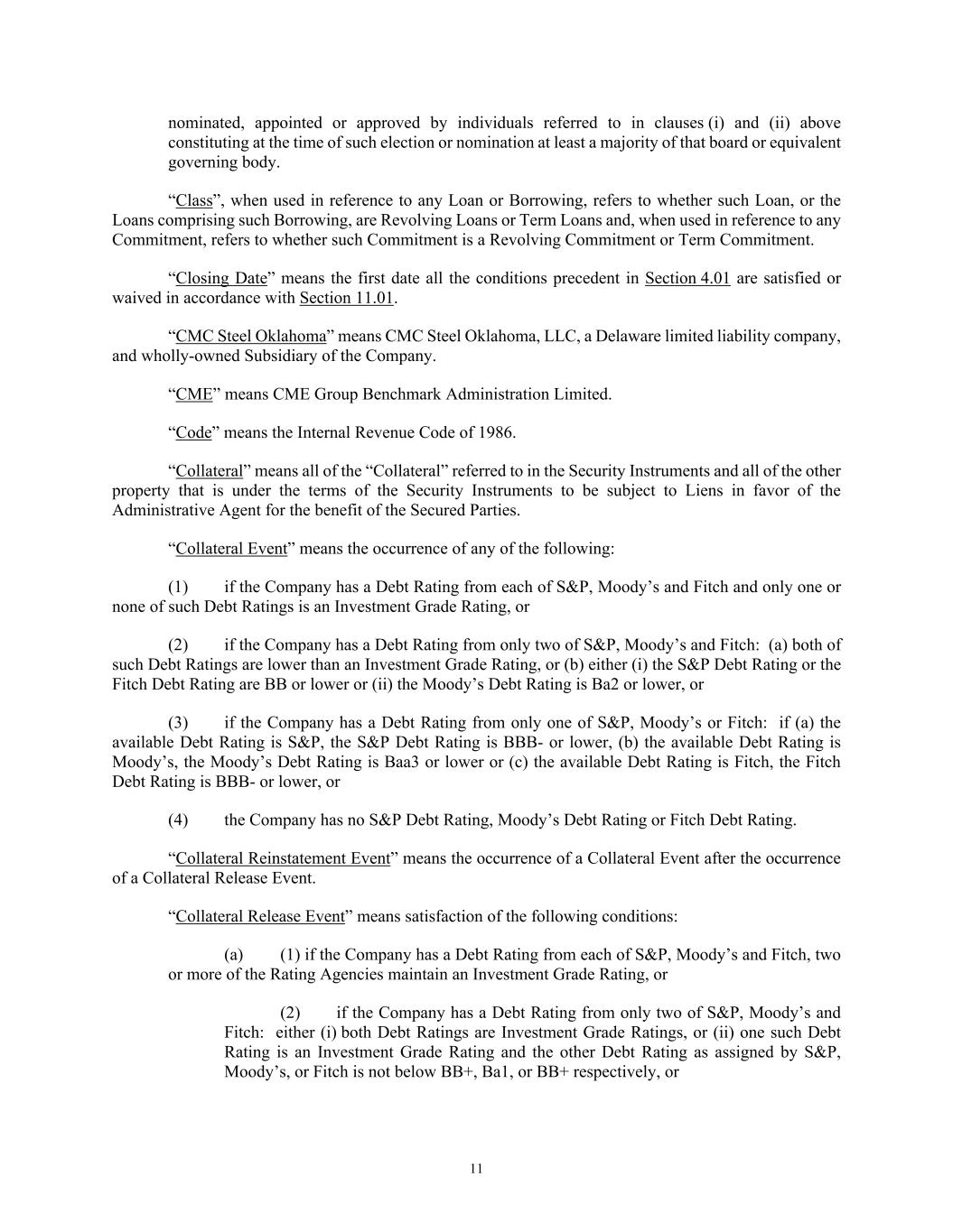 11 nominated, appointed or approved by individuals referred to in clauses (i) and (ii) above constituting at the time of such election or nomination at least a majority of that board or equivalent governing body. “Class”, when used in reference to any Loan or Borrowing, refers to whether such Loan, or the Loans comprising such Borrowing, are Revolving Loans or Term Loans and, when used in reference to any Commitment, refers to whether such Commitment is a Revolving Commitment or Term Commitment. “Closing Date” means the first date all the conditions precedent in Section 4.01 are satisfied or waived in accordance with Section 11.01. “CMC Steel Oklahoma” means CMC Steel Oklahoma, LLC, a Delaware limited liability company, and wholly-owned Subsidiary of the Company. “CME” means CME Group Benchmark Administration Limited. “Code” means the Internal Revenue Code of 1986. “Collateral” means all of the “Collateral” referred to in the Security Instruments and all of the other property that is under the terms of the Security Instruments to be subject to Liens in favor of the Administrative Agent for the benefit of the Secured Parties. “Collateral Event” means the occurrence of any of the following: (1) if the Company has a Debt Rating from each of S&P, Moody’s and Fitch and only one or none of such Debt Ratings is an Investment Grade Rating, or (2) if the Company has a Debt Rating from only two of S&P, Moody’s and Fitch: (a) both of such Debt Ratings are lower than an Investment Grade Rating, or (b) either (i) the S&P Debt Rating or the Fitch Debt Rating are BB or lower or (ii) the Moody’s Debt Rating is Ba2 or lower, or (3) if the Company has a Debt Rating from only one of S&P, Moody’s or Fitch: if (a) the available Debt Rating is S&P, the S&P Debt Rating is BBB- or lower, (b) the available Debt Rating is Moody’s, the Moody’s Debt Rating is Baa3 or lower or (c) the available Debt Rating is Fitch, the Fitch Debt Rating is BBB- or lower, or (4) the Company has no S&P Debt Rating, Moody’s Debt Rating or Fitch Debt Rating. “Collateral Reinstatement Event” means the occurrence of a Collateral Event after the occurrence of a Collateral Release Event. “Collateral Release Event” means satisfaction of the following conditions: (a) (1) if the Company has a Debt Rating from each of S&P, Moody’s and Fitch, two or more of the Rating Agencies maintain an Investment Grade Rating, or (2) if the Company has a Debt Rating from only two of S&P, Moody’s and Fitch: either (i) both Debt Ratings are Investment Grade Ratings, or (ii) one such Debt Rating is an Investment Grade Rating and the other Debt Rating as assigned by S&P, Moody’s, or Fitch is not below BB+, Ba1, or BB+ respectively, or
