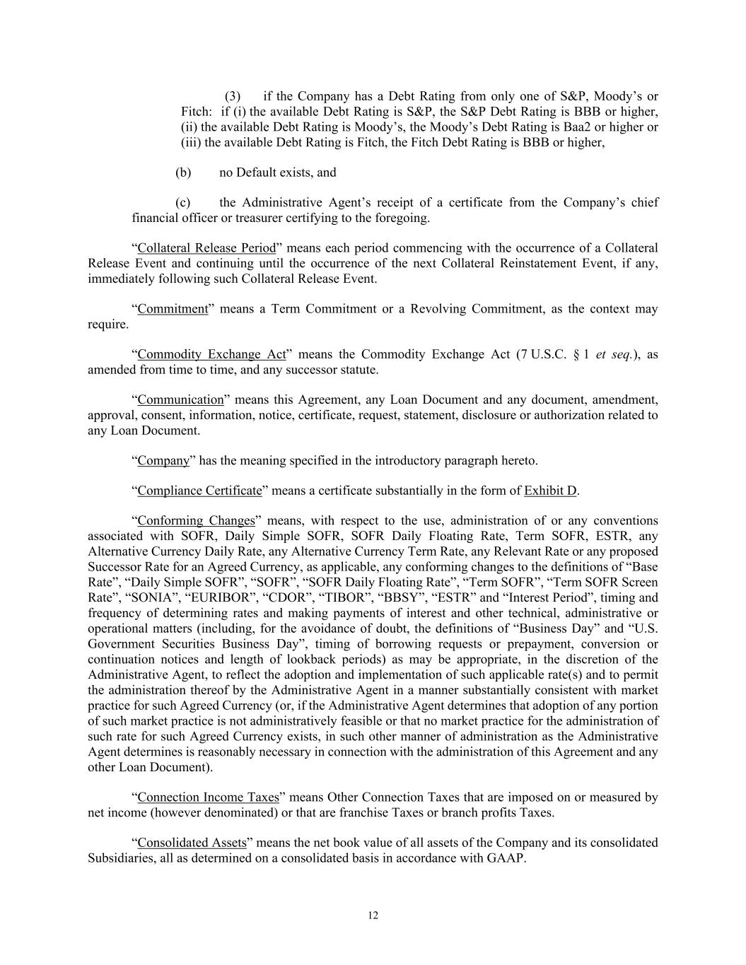 12 (3) if the Company has a Debt Rating from only one of S&P, Moody’s or Fitch: if (i) the available Debt Rating is S&P, the S&P Debt Rating is BBB or higher, (ii) the available Debt Rating is Moody’s, the Moody’s Debt Rating is Baa2 or higher or (iii) the available Debt Rating is Fitch, the Fitch Debt Rating is BBB or higher, (b) no Default exists, and (c) the Administrative Agent’s receipt of a certificate from the Company’s chief financial officer or treasurer certifying to the foregoing. “Collateral Release Period” means each period commencing with the occurrence of a Collateral Release Event and continuing until the occurrence of the next Collateral Reinstatement Event, if any, immediately following such Collateral Release Event. “Commitment” means a Term Commitment or a Revolving Commitment, as the context may require. “Commodity Exchange Act” means the Commodity Exchange Act (7 U.S.C. § 1 et seq.), as amended from time to time, and any successor statute. “Communication” means this Agreement, any Loan Document and any document, amendment, approval, consent, information, notice, certificate, request, statement, disclosure or authorization related to any Loan Document. “Company” has the meaning specified in the introductory paragraph hereto. “Compliance Certificate” means a certificate substantially in the form of Exhibit D. “Conforming Changes” means, with respect to the use, administration of or any conventions associated with SOFR, Daily Simple SOFR, SOFR Daily Floating Rate, Term SOFR, ESTR, any Alternative Currency Daily Rate, any Alternative Currency Term Rate, any Relevant Rate or any proposed Successor Rate for an Agreed Currency, as applicable, any conforming changes to the definitions of “Base Rate”, “Daily Simple SOFR”, “SOFR”, “SOFR Daily Floating Rate”, “Term SOFR”, “Term SOFR Screen Rate”, “SONIA”, “EURIBOR”, “CDOR”, “TIBOR”, “BBSY”, “ESTR” and “Interest Period”, timing and frequency of determining rates and making payments of interest and other technical, administrative or operational matters (including, for the avoidance of doubt, the definitions of “Business Day” and “U.S. Government Securities Business Day”, timing of borrowing requests or prepayment, conversion or continuation notices and length of lookback periods) as may be appropriate, in the discretion of the Administrative Agent, to reflect the adoption and implementation of such applicable rate(s) and to permit the administration thereof by the Administrative Agent in a manner substantially consistent with market practice for such Agreed Currency (or, if the Administrative Agent determines that adoption of any portion of such market practice is not administratively feasible or that no market practice for the administration of such rate for such Agreed Currency exists, in such other manner of administration as the Administrative Agent determines is reasonably necessary in connection with the administration of this Agreement and any other Loan Document). “Connection Income Taxes” means Other Connection Taxes that are imposed on or measured by net income (however denominated) or that are franchise Taxes or branch profits Taxes. “Consolidated Assets” means the net book value of all assets of the Company and its consolidated Subsidiaries, all as determined on a consolidated basis in accordance with GAAP.