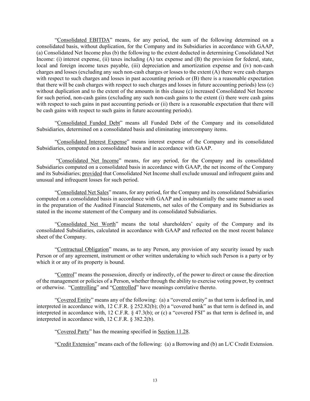 13 “Consolidated EBITDA” means, for any period, the sum of the following determined on a consolidated basis, without duplication, for the Company and its Subsidiaries in accordance with GAAP, (a) Consolidated Net Income plus (b) the following to the extent deducted in determining Consolidated Net Income: (i) interest expense, (ii) taxes including (A) tax expense and (B) the provision for federal, state, local and foreign income taxes payable, (iii) depreciation and amortization expense and (iv) non-cash charges and losses (excluding any such non-cash charges or losses to the extent (A) there were cash charges with respect to such charges and losses in past accounting periods or (B) there is a reasonable expectation that there will be cash charges with respect to such charges and losses in future accounting periods) less (c) without duplication and to the extent of the amounts in this clause (c) increased Consolidated Net Income for such period, non-cash gains (excluding any such non-cash gains to the extent (i) there were cash gains with respect to such gains in past accounting periods or (ii) there is a reasonable expectation that there will be cash gains with respect to such gains in future accounting periods). “Consolidated Funded Debt” means all Funded Debt of the Company and its consolidated Subsidiaries, determined on a consolidated basis and eliminating intercompany items. “Consolidated Interest Expense” means interest expense of the Company and its consolidated Subsidiaries, computed on a consolidated basis and in accordance with GAAP. “Consolidated Net Income” means, for any period, for the Company and its consolidated Subsidiaries computed on a consolidated basis in accordance with GAAP, the net income of the Company and its Subsidiaries; provided that Consolidated Net Income shall exclude unusual and infrequent gains and unusual and infrequent losses for such period. “Consolidated Net Sales” means, for any period, for the Company and its consolidated Subsidiaries computed on a consolidated basis in accordance with GAAP and in substantially the same manner as used in the preparation of the Audited Financial Statements, net sales of the Company and its Subsidiaries as stated in the income statement of the Company and its consolidated Subsidiaries. “Consolidated Net Worth” means the total shareholders’ equity of the Company and its consolidated Subsidiaries, calculated in accordance with GAAP and reflected on the most recent balance sheet of the Company. “Contractual Obligation” means, as to any Person, any provision of any security issued by such Person or of any agreement, instrument or other written undertaking to which such Person is a party or by which it or any of its property is bound. “Control” means the possession, directly or indirectly, of the power to direct or cause the direction of the management or policies of a Person, whether through the ability to exercise voting power, by contract or otherwise. “Controlling” and “Controlled” have meanings correlative thereto. “Covered Entity” means any of the following: (a) a “covered entity” as that term is defined in, and interpreted in accordance with, 12 C.F.R. § 252.82(b); (b) a “covered bank” as that term is defined in, and interpreted in accordance with, 12 C.F.R. § 47.3(b); or (c) a “covered FSI” as that term is defined in, and interpreted in accordance with, 12 C.F.R. § 382.2(b). “Covered Party” has the meaning specified in Section 11.28. “Credit Extension” means each of the following: (a) a Borrowing and (b) an L/C Credit Extension.