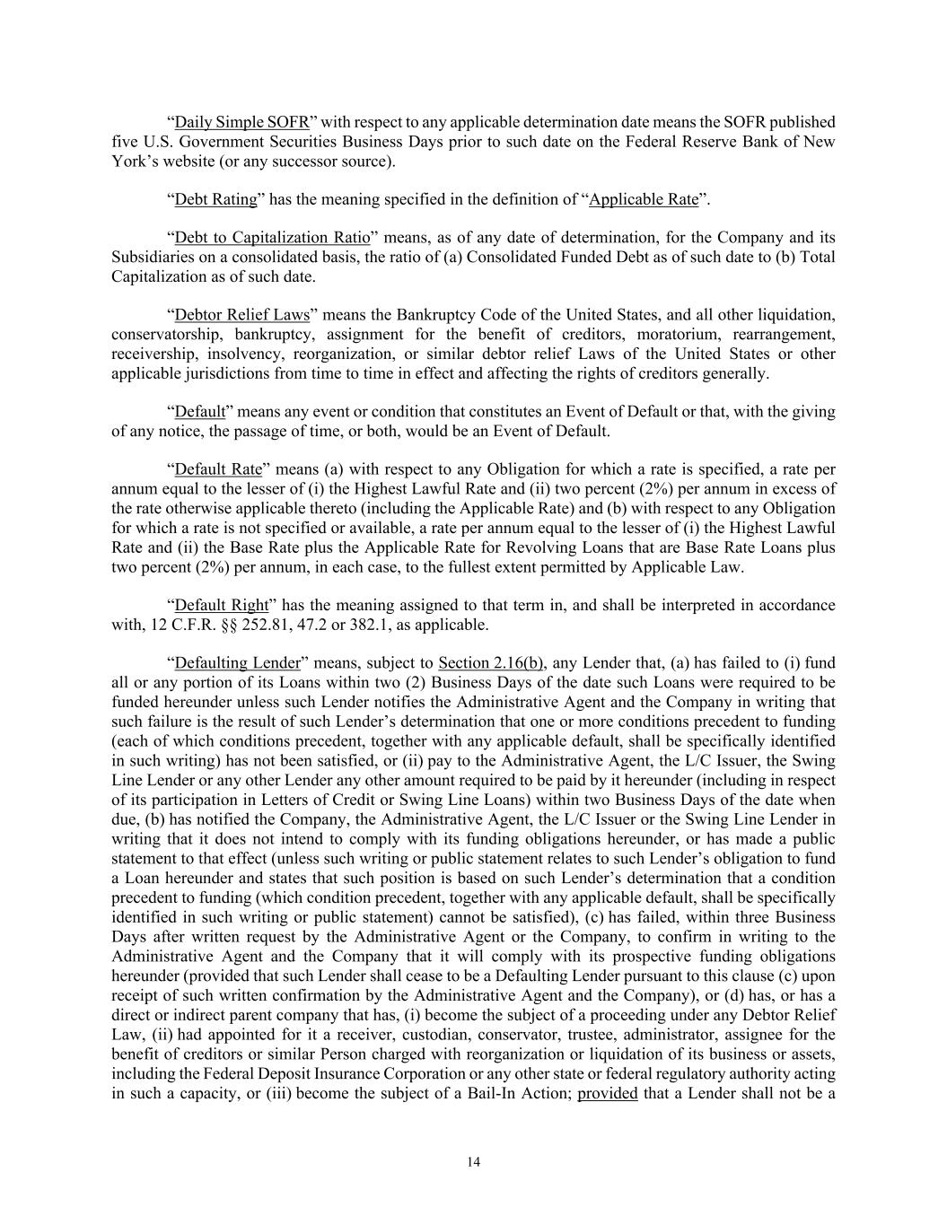 14 “Daily Simple SOFR” with respect to any applicable determination date means the SOFR published five U.S. Government Securities Business Days prior to such date on the Federal Reserve Bank of New York’s website (or any successor source). “Debt Rating” has the meaning specified in the definition of “Applicable Rate”. “Debt to Capitalization Ratio” means, as of any date of determination, for the Company and its Subsidiaries on a consolidated basis, the ratio of (a) Consolidated Funded Debt as of such date to (b) Total Capitalization as of such date. “Debtor Relief Laws” means the Bankruptcy Code of the United States, and all other liquidation, conservatorship, bankruptcy, assignment for the benefit of creditors, moratorium, rearrangement, receivership, insolvency, reorganization, or similar debtor relief Laws of the United States or other applicable jurisdictions from time to time in effect and affecting the rights of creditors generally. “Default” means any event or condition that constitutes an Event of Default or that, with the giving of any notice, the passage of time, or both, would be an Event of Default. “Default Rate” means (a) with respect to any Obligation for which a rate is specified, a rate per annum equal to the lesser of (i) the Highest Lawful Rate and (ii) two percent (2%) per annum in excess of the rate otherwise applicable thereto (including the Applicable Rate) and (b) with respect to any Obligation for which a rate is not specified or available, a rate per annum equal to the lesser of (i) the Highest Lawful Rate and (ii) the Base Rate plus the Applicable Rate for Revolving Loans that are Base Rate Loans plus two percent (2%) per annum, in each case, to the fullest extent permitted by Applicable Law. “Default Right” has the meaning assigned to that term in, and shall be interpreted in accordance with, 12 C.F.R. §§ 252.81, 47.2 or 382.1, as applicable. “Defaulting Lender” means, subject to Section 2.16(b), any Lender that, (a) has failed to (i) fund all or any portion of its Loans within two (2) Business Days of the date such Loans were required to be funded hereunder unless such Lender notifies the Administrative Agent and the Company in writing that such failure is the result of such Lender’s determination that one or more conditions precedent to funding (each of which conditions precedent, together with any applicable default, shall be specifically identified in such writing) has not been satisfied, or (ii) pay to the Administrative Agent, the L/C Issuer, the Swing Line Lender or any other Lender any other amount required to be paid by it hereunder (including in respect of its participation in Letters of Credit or Swing Line Loans) within two Business Days of the date when due, (b) has notified the Company, the Administrative Agent, the L/C Issuer or the Swing Line Lender in writing that it does not intend to comply with its funding obligations hereunder, or has made a public statement to that effect (unless such writing or public statement relates to such Lender’s obligation to fund a Loan hereunder and states that such position is based on such Lender’s determination that a condition precedent to funding (which condition precedent, together with any applicable default, shall be specifically identified in such writing or public statement) cannot be satisfied), (c) has failed, within three Business Days after written request by the Administrative Agent or the Company, to confirm in writing to the Administrative Agent and the Company that it will comply with its prospective funding obligations hereunder (provided that such Lender shall cease to be a Defaulting Lender pursuant to this clause (c) upon receipt of such written confirmation by the Administrative Agent and the Company), or (d) has, or has a direct or indirect parent company that has, (i) become the subject of a proceeding under any Debtor Relief Law, (ii) had appointed for it a receiver, custodian, conservator, trustee, administrator, assignee for the benefit of creditors or similar Person charged with reorganization or liquidation of its business or assets, including the Federal Deposit Insurance Corporation or any other state or federal regulatory authority acting in such a capacity, or (iii) become the subject of a Bail-In Action; provided that a Lender shall not be a