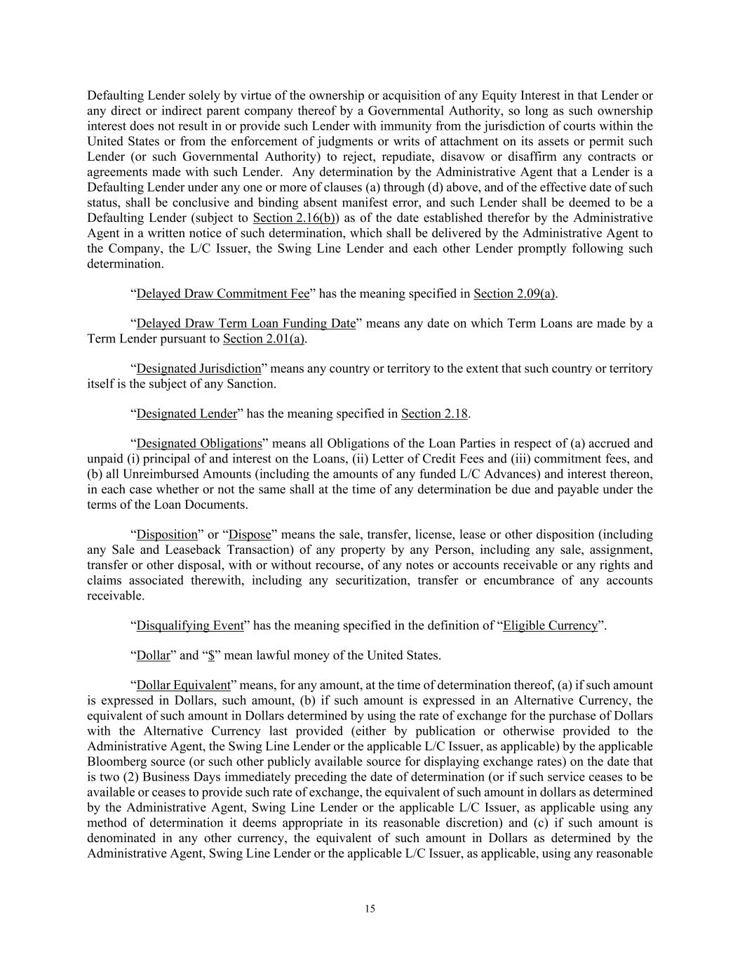 15 Defaulting Lender solely by virtue of the ownership or acquisition of any Equity Interest in that Lender or any direct or indirect parent company thereof by a Governmental Authority, so long as such ownership interest does not result in or provide such Lender with immunity from the jurisdiction of courts within the United States or from the enforcement of judgments or writs of attachment on its assets or permit such Lender (or such Governmental Authority) to reject, repudiate, disavow or disaffirm any contracts or agreements made with such Lender. Any determination by the Administrative Agent that a Lender is a Defaulting Lender under any one or more of clauses (a) through (d) above, and of the effective date of such status, shall be conclusive and binding absent manifest error, and such Lender shall be deemed to be a Defaulting Lender (subject to Section 2.16(b)) as of the date established therefor by the Administrative Agent in a written notice of such determination, which shall be delivered by the Administrative Agent to the Company, the L/C Issuer, the Swing Line Lender and each other Lender promptly following such determination. “Delayed Draw Commitment Fee” has the meaning specified in Section 2.09(a). “Delayed Draw Term Loan Funding Date” means any date on which Term Loans are made by a Term Lender pursuant to Section 2.01(a). “Designated Jurisdiction” means any country or territory to the extent that such country or territory itself is the subject of any Sanction. “Designated Lender” has the meaning specified in Section 2.18. “Designated Obligations” means all Obligations of the Loan Parties in respect of (a) accrued and unpaid (i) principal of and interest on the Loans, (ii) Letter of Credit Fees and (iii) commitment fees, and (b) all Unreimbursed Amounts (including the amounts of any funded L/C Advances) and interest thereon, in each case whether or not the same shall at the time of any determination be due and payable under the terms of the Loan Documents. “Disposition” or “Dispose” means the sale, transfer, license, lease or other disposition (including any Sale and Leaseback Transaction) of any property by any Person, including any sale, assignment, transfer or other disposal, with or without recourse, of any notes or accounts receivable or any rights and claims associated therewith, including any securitization, transfer or encumbrance of any accounts receivable. “Disqualifying Event” has the meaning specified in the definition of “Eligible Currency”. “Dollar” and “$” mean lawful money of the United States. “Dollar Equivalent” means, for any amount, at the time of determination thereof, (a) if such amount is expressed in Dollars, such amount, (b) if such amount is expressed in an Alternative Currency, the equivalent of such amount in Dollars determined by using the rate of exchange for the purchase of Dollars with the Alternative Currency last provided (either by publication or otherwise provided to the Administrative Agent, the Swing Line Lender or the applicable L/C Issuer, as applicable) by the applicable Bloomberg source (or such other publicly available source for displaying exchange rates) on the date that is two (2) Business Days immediately preceding the date of determination (or if such service ceases to be available or ceases to provide such rate of exchange, the equivalent of such amount in dollars as determined by the Administrative Agent, Swing Line Lender or the applicable L/C Issuer, as applicable using any method of determination it deems appropriate in its reasonable discretion) and (c) if such amount is denominated in any other currency, the equivalent of such amount in Dollars as determined by the Administrative Agent, Swing Line Lender or the applicable L/C Issuer, as applicable, using any reasonable