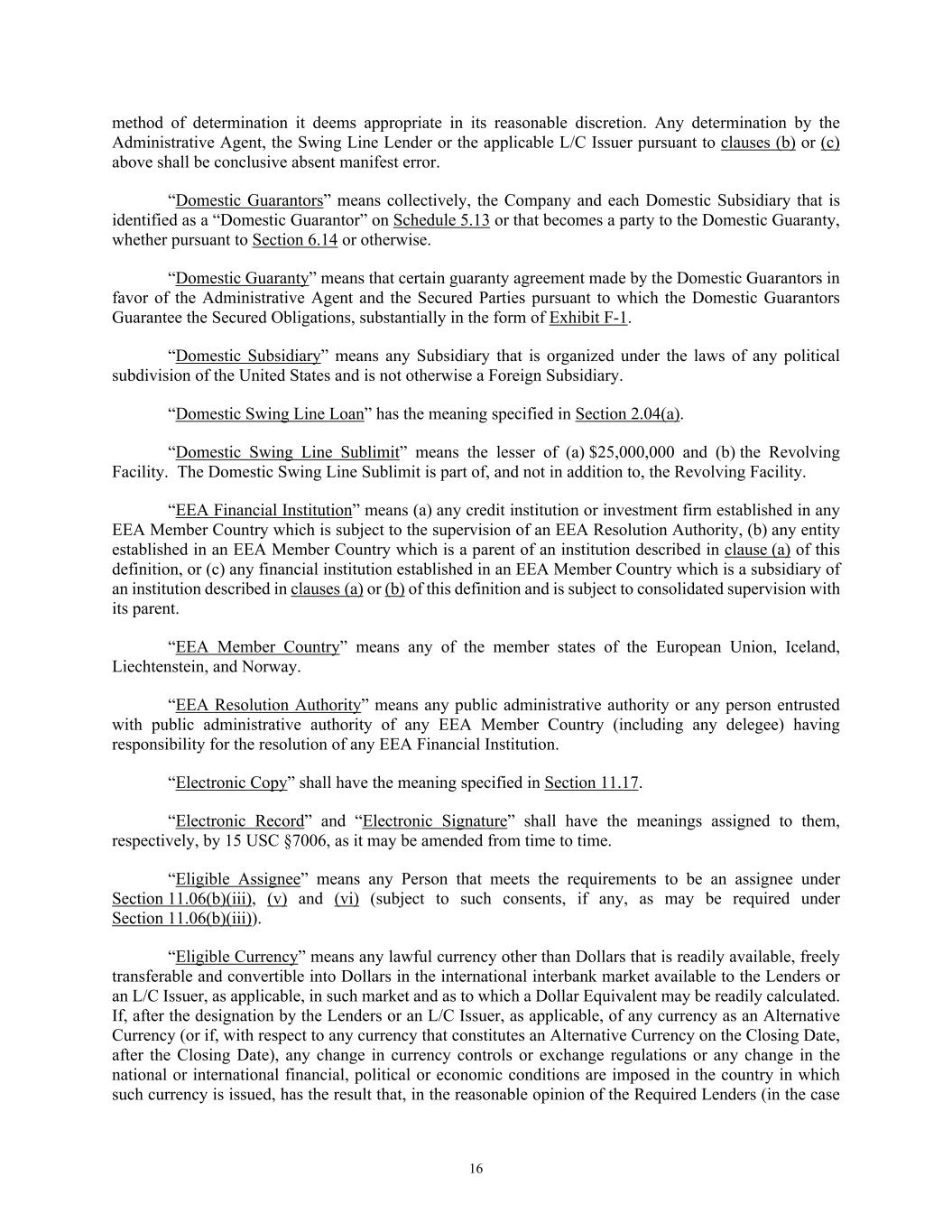 16 method of determination it deems appropriate in its reasonable discretion. Any determination by the Administrative Agent, the Swing Line Lender or the applicable L/C Issuer pursuant to clauses (b) or (c) above shall be conclusive absent manifest error. “Domestic Guarantors” means collectively, the Company and each Domestic Subsidiary that is identified as a “Domestic Guarantor” on Schedule 5.13 or that becomes a party to the Domestic Guaranty, whether pursuant to Section 6.14 or otherwise. “Domestic Guaranty” means that certain guaranty agreement made by the Domestic Guarantors in favor of the Administrative Agent and the Secured Parties pursuant to which the Domestic Guarantors Guarantee the Secured Obligations, substantially in the form of Exhibit F-1. “Domestic Subsidiary” means any Subsidiary that is organized under the laws of any political subdivision of the United States and is not otherwise a Foreign Subsidiary. “Domestic Swing Line Loan” has the meaning specified in Section 2.04(a). “Domestic Swing Line Sublimit” means the lesser of (a) $25,000,000 and (b) the Revolving Facility. The Domestic Swing Line Sublimit is part of, and not in addition to, the Revolving Facility. “EEA Financial Institution” means (a) any credit institution or investment firm established in any EEA Member Country which is subject to the supervision of an EEA Resolution Authority, (b) any entity established in an EEA Member Country which is a parent of an institution described in clause (a) of this definition, or (c) any financial institution established in an EEA Member Country which is a subsidiary of an institution described in clauses (a) or (b) of this definition and is subject to consolidated supervision with its parent. “EEA Member Country” means any of the member states of the European Union, Iceland, Liechtenstein, and Norway. “EEA Resolution Authority” means any public administrative authority or any person entrusted with public administrative authority of any EEA Member Country (including any delegee) having responsibility for the resolution of any EEA Financial Institution. “Electronic Copy” shall have the meaning specified in Section 11.17. “Electronic Record” and “Electronic Signature” shall have the meanings assigned to them, respectively, by 15 USC §7006, as it may be amended from time to time. “Eligible Assignee” means any Person that meets the requirements to be an assignee under Section 11.06(b)(iii), (v) and (vi) (subject to such consents, if any, as may be required under Section 11.06(b)(iii)). “Eligible Currency” means any lawful currency other than Dollars that is readily available, freely transferable and convertible into Dollars in the international interbank market available to the Lenders or an L/C Issuer, as applicable, in such market and as to which a Dollar Equivalent may be readily calculated. If, after the designation by the Lenders or an L/C Issuer, as applicable, of any currency as an Alternative Currency (or if, with respect to any currency that constitutes an Alternative Currency on the Closing Date, after the Closing Date), any change in currency controls or exchange regulations or any change in the national or international financial, political or economic conditions are imposed in the country in which such currency is issued, has the result that, in the reasonable opinion of the Required Lenders (in the case