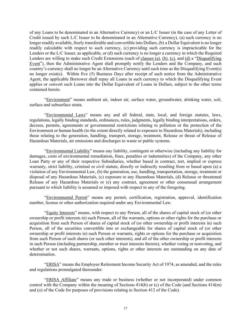 17 of any Loans to be denominated in an Alternative Currency) or an L/C Issuer (in the case of any Letter of Credit issued by such L/C Issuer to be denominated in an Alternative Currency), (a) such currency is no longer readily available, freely transferable and convertible into Dollars, (b) a Dollar Equivalent is no longer readily calculable with respect to such currency, (c) providing such currency is impracticable for the Lenders or the L/C Issuer, as applicable, or (d) such currency is no longer a currency in which the Required Lenders are willing to make such Credit Extensions (each of clauses (a), (b), (c), and (d) a “Disqualifying Event”), then the Administrative Agent shall promptly notify the Lenders and the Company, and such country’s currency shall no longer be an Alternative Currency until such time as the Disqualifying Event(s) no longer exist(s). Within five (5) Business Days after receipt of such notice from the Administrative Agent, the applicable Borrower shall repay all Loans in such currency to which the Disqualifying Event applies or convert such Loans into the Dollar Equivalent of Loans in Dollars, subject to the other terms contained herein. “Environment” means ambient air, indoor air, surface water, groundwater, drinking water, soil, surface and subsurface strata. “Environmental Laws” means any and all federal, state, local, and foreign statutes, laws, regulations, legally binding standards, ordinances, rules, judgments, legally binding interpretations, orders, decrees, permits, agreements or governmental restrictions relating to pollution or the protection of the Environment or human health (to the extent directly related to exposure to Hazardous Materials), including those relating to the generation, handling, transport, storage, treatment, Release or threat of Release of Hazardous Materials, air emissions and discharges to waste or public systems. “Environmental Liability” means any liability, contingent or otherwise (including any liability for damages, costs of environmental remediation, fines, penalties or indemnities) of the Company, any other Loan Party or any of their respective Subsidiaries, whether based in contract, tort, implied or express warranty, strict liability, criminal or civil statute, directly or indirectly resulting from or based upon (a) a violation of any Environmental Law, (b) the generation, use, handling, transportation, storage, treatment or disposal of any Hazardous Materials, (c) exposure to any Hazardous Materials, (d) Release or threatened Release of any Hazardous Materials or (e) any contract, agreement or other consensual arrangement pursuant to which liability is assumed or imposed with respect to any of the foregoing. “Environmental Permit” means any permit, certification, registration, approval, identification number, license or other authorization required under any Environmental Law. “Equity Interests” means, with respect to any Person, all of the shares of capital stock of (or other ownership or profit interests in) such Person, all of the warrants, options or other rights for the purchase or acquisition from such Person of shares of capital stock of (or other ownership or profit interests in) such Person, all of the securities convertible into or exchangeable for shares of capital stock of (or other ownership or profit interests in) such Person or warrants, rights or options for the purchase or acquisition from such Person of such shares (or such other interests), and all of the other ownership or profit interests in such Person (including partnership, member or trust interests therein), whether voting or nonvoting, and whether or not such shares, warrants, options, rights or other interests are outstanding on any date of determination. “ERISA” means the Employee Retirement Income Security Act of 1974, as amended, and the rules and regulations promulgated thereunder. “ERISA Affiliate” means any trade or business (whether or not incorporated) under common control with the Company within the meaning of Sections 414(b) or (c) of the Code (and Sections 414(m) and (o) of the Code for purposes of provisions relating to Section 412 of the Code).