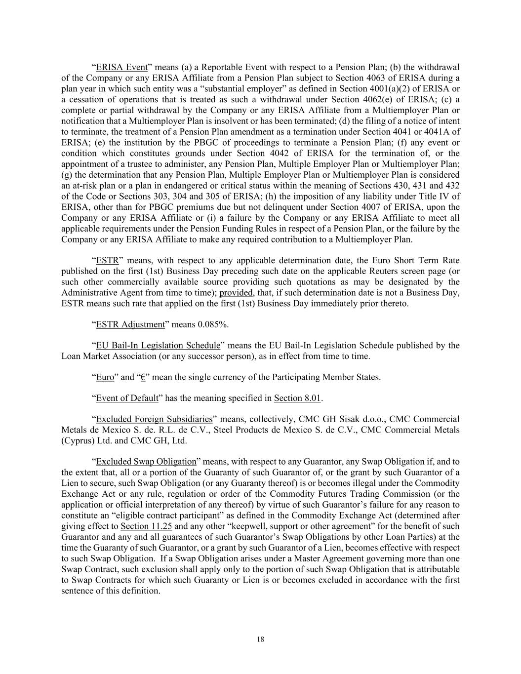 18 “ERISA Event” means (a) a Reportable Event with respect to a Pension Plan; (b) the withdrawal of the Company or any ERISA Affiliate from a Pension Plan subject to Section 4063 of ERISA during a plan year in which such entity was a “substantial employer” as defined in Section 4001(a)(2) of ERISA or a cessation of operations that is treated as such a withdrawal under Section 4062(e) of ERISA; (c) a complete or partial withdrawal by the Company or any ERISA Affiliate from a Multiemployer Plan or notification that a Multiemployer Plan is insolvent or has been terminated; (d) the filing of a notice of intent to terminate, the treatment of a Pension Plan amendment as a termination under Section 4041 or 4041A of ERISA; (e) the institution by the PBGC of proceedings to terminate a Pension Plan; (f) any event or condition which constitutes grounds under Section 4042 of ERISA for the termination of, or the appointment of a trustee to administer, any Pension Plan, Multiple Employer Plan or Multiemployer Plan; (g) the determination that any Pension Plan, Multiple Employer Plan or Multiemployer Plan is considered an at-risk plan or a plan in endangered or critical status within the meaning of Sections 430, 431 and 432 of the Code or Sections 303, 304 and 305 of ERISA; (h) the imposition of any liability under Title IV of ERISA, other than for PBGC premiums due but not delinquent under Section 4007 of ERISA, upon the Company or any ERISA Affiliate or (i) a failure by the Company or any ERISA Affiliate to meet all applicable requirements under the Pension Funding Rules in respect of a Pension Plan, or the failure by the Company or any ERISA Affiliate to make any required contribution to a Multiemployer Plan. “ESTR” means, with respect to any applicable determination date, the Euro Short Term Rate published on the first (1st) Business Day preceding such date on the applicable Reuters screen page (or such other commercially available source providing such quotations as may be designated by the Administrative Agent from time to time); provided, that, if such determination date is not a Business Day, ESTR means such rate that applied on the first (1st) Business Day immediately prior thereto. “ESTR Adjustment” means 0.085%. “EU Bail-In Legislation Schedule” means the EU Bail-In Legislation Schedule published by the Loan Market Association (or any successor person), as in effect from time to time. “Euro” and “€” mean the single currency of the Participating Member States. “Event of Default” has the meaning specified in Section 8.01. “Excluded Foreign Subsidiaries” means, collectively, CMC GH Sisak d.o.o., CMC Commercial Metals de Mexico S. de. R.L. de C.V., Steel Products de Mexico S. de C.V., CMC Commercial Metals (Cyprus) Ltd. and CMC GH, Ltd. “Excluded Swap Obligation” means, with respect to any Guarantor, any Swap Obligation if, and to the extent that, all or a portion of the Guaranty of such Guarantor of, or the grant by such Guarantor of a Lien to secure, such Swap Obligation (or any Guaranty thereof) is or becomes illegal under the Commodity Exchange Act or any rule, regulation or order of the Commodity Futures Trading Commission (or the application or official interpretation of any thereof) by virtue of such Guarantor’s failure for any reason to constitute an “eligible contract participant” as defined in the Commodity Exchange Act (determined after giving effect to Section 11.25 and any other “keepwell, support or other agreement” for the benefit of such Guarantor and any and all guarantees of such Guarantor’s Swap Obligations by other Loan Parties) at the time the Guaranty of such Guarantor, or a grant by such Guarantor of a Lien, becomes effective with respect to such Swap Obligation. If a Swap Obligation arises under a Master Agreement governing more than one Swap Contract, such exclusion shall apply only to the portion of such Swap Obligation that is attributable to Swap Contracts for which such Guaranty or Lien is or becomes excluded in accordance with the first sentence of this definition.
