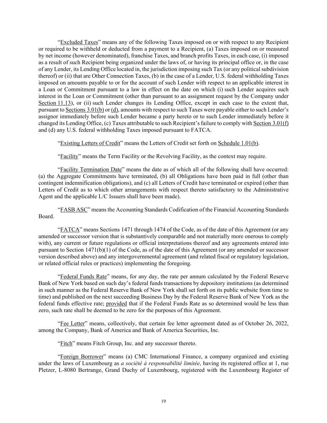 19 “Excluded Taxes” means any of the following Taxes imposed on or with respect to any Recipient or required to be withheld or deducted from a payment to a Recipient, (a) Taxes imposed on or measured by net income (however denominated), franchise Taxes, and branch profits Taxes, in each case, (i) imposed as a result of such Recipient being organized under the laws of, or having its principal office or, in the case of any Lender, its Lending Office located in, the jurisdiction imposing such Tax (or any political subdivision thereof) or (ii) that are Other Connection Taxes, (b) in the case of a Lender, U.S. federal withholding Taxes imposed on amounts payable to or for the account of such Lender with respect to an applicable interest in a Loan or Commitment pursuant to a law in effect on the date on which (i) such Lender acquires such interest in the Loan or Commitment (other than pursuant to an assignment request by the Company under Section 11.13), or (ii) such Lender changes its Lending Office, except in each case to the extent that, pursuant to Sections 3.01(b) or (d), amounts with respect to such Taxes were payable either to such Lender’s assignor immediately before such Lender became a party hereto or to such Lender immediately before it changed its Lending Office, (c) Taxes attributable to such Recipient’s failure to comply with Section 3.01(f) and (d) any U.S. federal withholding Taxes imposed pursuant to FATCA. “Existing Letters of Credit” means the Letters of Credit set forth on Schedule 1.01(b). “Facility” means the Term Facility or the Revolving Facility, as the context may require. “Facility Termination Date” means the date as of which all of the following shall have occurred: (a) the Aggregate Commitments have terminated, (b) all Obligations have been paid in full (other than contingent indemnification obligations), and (c) all Letters of Credit have terminated or expired (other than Letters of Credit as to which other arrangements with respect thereto satisfactory to the Administrative Agent and the applicable L/C Issuers shall have been made). “FASB ASC” means the Accounting Standards Codification of the Financial Accounting Standards Board. “FATCA” means Sections 1471 through 1474 of the Code, as of the date of this Agreement (or any amended or successor version that is substantively comparable and not materially more onerous to comply with), any current or future regulations or official interpretations thereof and any agreements entered into pursuant to Section 1471(b)(1) of the Code, as of the date of this Agreement (or any amended or successor version described above) and any intergovernmental agreement (and related fiscal or regulatory legislation, or related official rules or practices) implementing the foregoing. “Federal Funds Rate” means, for any day, the rate per annum calculated by the Federal Reserve Bank of New York based on such day’s federal funds transactions by depository institutions (as determined in such manner as the Federal Reserve Bank of New York shall set forth on its public website from time to time) and published on the next succeeding Business Day by the Federal Reserve Bank of New York as the federal funds effective rate; provided that if the Federal Funds Rate as so determined would be less than zero, such rate shall be deemed to be zero for the purposes of this Agreement. “Fee Letter” means, collectively, that certain fee letter agreement dated as of October 26, 2022, among the Company, Bank of America and Bank of America Securities, Inc. “Fitch” means Fitch Group, Inc. and any successor thereto. “Foreign Borrower” means (a) CMC International Finance, a company organized and existing under the laws of Luxembourg as a société à responsabilité limitée, having its registered office at 1, rue Pletzer, L-8080 Bertrange, Grand Duchy of Luxembourg, registered with the Luxembourg Register of