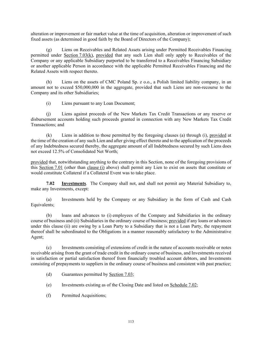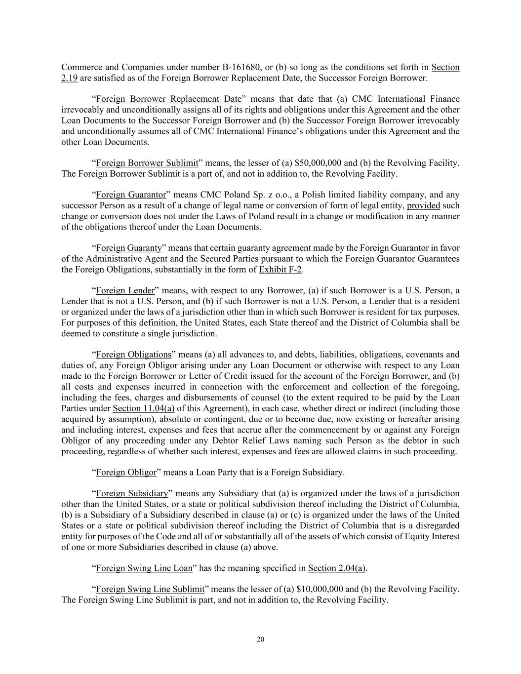 20 Commerce and Companies under number B-161680, or (b) so long as the conditions set forth in Section 2.19 are satisfied as of the Foreign Borrower Replacement Date, the Successor Foreign Borrower. “Foreign Borrower Replacement Date” means that date that (a) CMC International Finance irrevocably and unconditionally assigns all of its rights and obligations under this Agreement and the other Loan Documents to the Successor Foreign Borrower and (b) the Successor Foreign Borrower irrevocably and unconditionally assumes all of CMC International Finance’s obligations under this Agreement and the other Loan Documents. “Foreign Borrower Sublimit” means, the lesser of (a) $50,000,000 and (b) the Revolving Facility. The Foreign Borrower Sublimit is a part of, and not in addition to, the Revolving Facility. “Foreign Guarantor” means CMC Poland Sp. z o.o., a Polish limited liability company, and any successor Person as a result of a change of legal name or conversion of form of legal entity, provided such change or conversion does not under the Laws of Poland result in a change or modification in any manner of the obligations thereof under the Loan Documents. “Foreign Guaranty” means that certain guaranty agreement made by the Foreign Guarantor in favor of the Administrative Agent and the Secured Parties pursuant to which the Foreign Guarantor Guarantees the Foreign Obligations, substantially in the form of Exhibit F-2. “Foreign Lender” means, with respect to any Borrower, (a) if such Borrower is a U.S. Person, a Lender that is not a U.S. Person, and (b) if such Borrower is not a U.S. Person, a Lender that is a resident or organized under the laws of a jurisdiction other than in which such Borrower is resident for tax purposes. For purposes of this definition, the United States, each State thereof and the District of Columbia shall be deemed to constitute a single jurisdiction. “Foreign Obligations” means (a) all advances to, and debts, liabilities, obligations, covenants and duties of, any Foreign Obligor arising under any Loan Document or otherwise with respect to any Loan made to the Foreign Borrower or Letter of Credit issued for the account of the Foreign Borrower, and (b) all costs and expenses incurred in connection with the enforcement and collection of the foregoing, including the fees, charges and disbursements of counsel (to the extent required to be paid by the Loan Parties under Section 11.04(a) of this Agreement), in each case, whether direct or indirect (including those acquired by assumption), absolute or contingent, due or to become due, now existing or hereafter arising and including interest, expenses and fees that accrue after the commencement by or against any Foreign Obligor of any proceeding under any Debtor Relief Laws naming such Person as the debtor in such proceeding, regardless of whether such interest, expenses and fees are allowed claims in such proceeding. “Foreign Obligor” means a Loan Party that is a Foreign Subsidiary. “Foreign Subsidiary” means any Subsidiary that (a) is organized under the laws of a jurisdiction other than the United States, or a state or political subdivision thereof including the District of Columbia, (b) is a Subsidiary of a Subsidiary described in clause (a) or (c) is organized under the laws of the United States or a state or political subdivision thereof including the District of Columbia that is a disregarded entity for purposes of the Code and all of or substantially all of the assets of which consist of Equity Interest of one or more Subsidiaries described in clause (a) above. “Foreign Swing Line Loan” has the meaning specified in Section 2.04(a). “Foreign Swing Line Sublimit” means the lesser of (a) $10,000,000 and (b) the Revolving Facility. The Foreign Swing Line Sublimit is part, and not in addition to, the Revolving Facility.