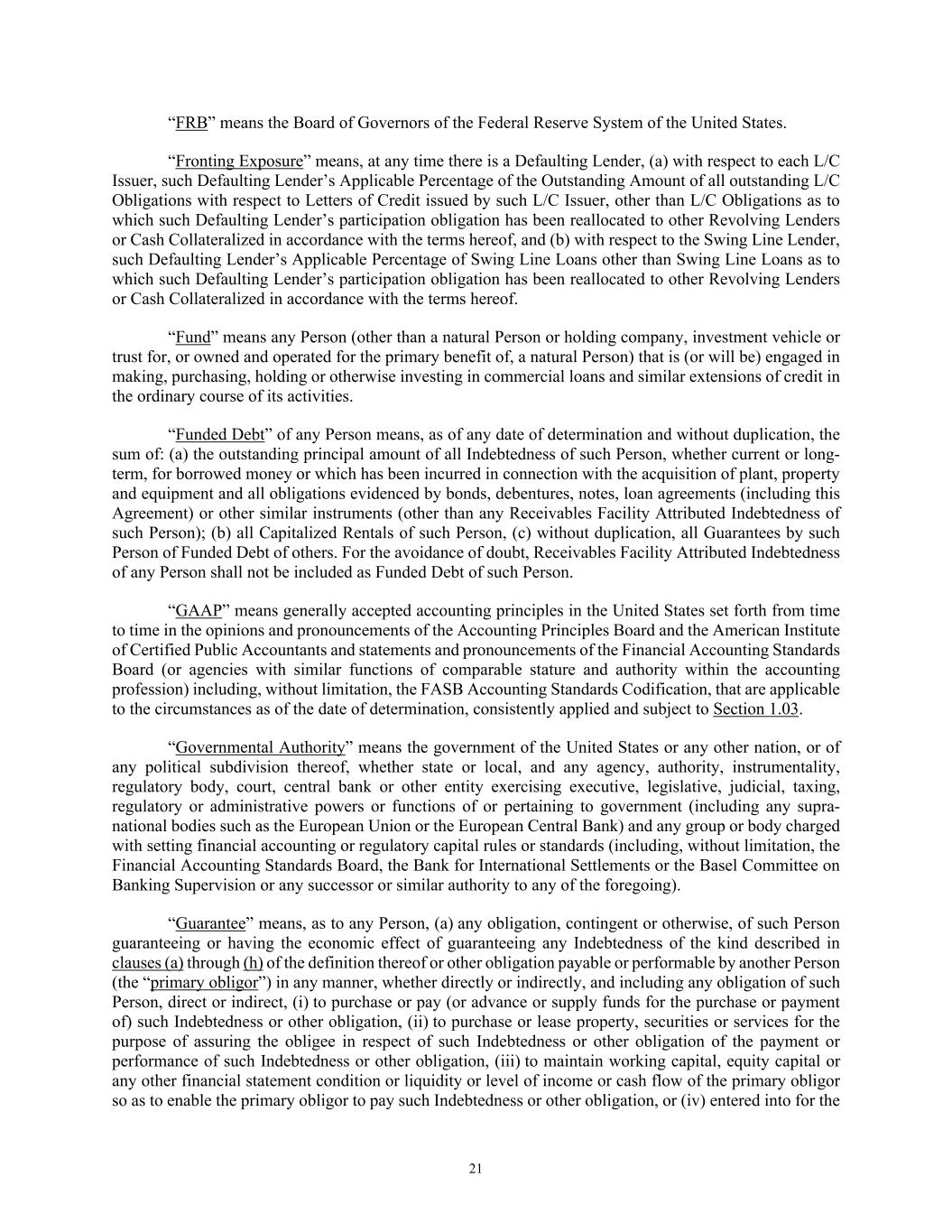 21 “FRB” means the Board of Governors of the Federal Reserve System of the United States. “Fronting Exposure” means, at any time there is a Defaulting Lender, (a) with respect to each L/C Issuer, such Defaulting Lender’s Applicable Percentage of the Outstanding Amount of all outstanding L/C Obligations with respect to Letters of Credit issued by such L/C Issuer, other than L/C Obligations as to which such Defaulting Lender’s participation obligation has been reallocated to other Revolving Lenders or Cash Collateralized in accordance with the terms hereof, and (b) with respect to the Swing Line Lender, such Defaulting Lender’s Applicable Percentage of Swing Line Loans other than Swing Line Loans as to which such Defaulting Lender’s participation obligation has been reallocated to other Revolving Lenders or Cash Collateralized in accordance with the terms hereof. “Fund” means any Person (other than a natural Person or holding company, investment vehicle or trust for, or owned and operated for the primary benefit of, a natural Person) that is (or will be) engaged in making, purchasing, holding or otherwise investing in commercial loans and similar extensions of credit in the ordinary course of its activities. “Funded Debt” of any Person means, as of any date of determination and without duplication, the sum of: (a) the outstanding principal amount of all Indebtedness of such Person, whether current or long- term, for borrowed money or which has been incurred in connection with the acquisition of plant, property and equipment and all obligations evidenced by bonds, debentures, notes, loan agreements (including this Agreement) or other similar instruments (other than any Receivables Facility Attributed Indebtedness of such Person); (b) all Capitalized Rentals of such Person, (c) without duplication, all Guarantees by such Person of Funded Debt of others. For the avoidance of doubt, Receivables Facility Attributed Indebtedness of any Person shall not be included as Funded Debt of such Person. “GAAP” means generally accepted accounting principles in the United States set forth from time to time in the opinions and pronouncements of the Accounting Principles Board and the American Institute of Certified Public Accountants and statements and pronouncements of the Financial Accounting Standards Board (or agencies with similar functions of comparable stature and authority within the accounting profession) including, without limitation, the FASB Accounting Standards Codification, that are applicable to the circumstances as of the date of determination, consistently applied and subject to Section 1.03. “Governmental Authority” means the government of the United States or any other nation, or of any political subdivision thereof, whether state or local, and any agency, authority, instrumentality, regulatory body, court, central bank or other entity exercising executive, legislative, judicial, taxing, regulatory or administrative powers or functions of or pertaining to government (including any supra- national bodies such as the European Union or the European Central Bank) and any group or body charged with setting financial accounting or regulatory capital rules or standards (including, without limitation, the Financial Accounting Standards Board, the Bank for International Settlements or the Basel Committee on Banking Supervision or any successor or similar authority to any of the foregoing). “Guarantee” means, as to any Person, (a) any obligation, contingent or otherwise, of such Person guaranteeing or having the economic effect of guaranteeing any Indebtedness of the kind described in clauses (a) through (h) of the definition thereof or other obligation payable or performable by another Person (the “primary obligor”) in any manner, whether directly or indirectly, and including any obligation of such Person, direct or indirect, (i) to purchase or pay (or advance or supply funds for the purchase or payment of) such Indebtedness or other obligation, (ii) to purchase or lease property, securities or services for the purpose of assuring the obligee in respect of such Indebtedness or other obligation of the payment or performance of such Indebtedness or other obligation, (iii) to maintain working capital, equity capital or any other financial statement condition or liquidity or level of income or cash flow of the primary obligor so as to enable the primary obligor to pay such Indebtedness or other obligation, or (iv) entered into for the