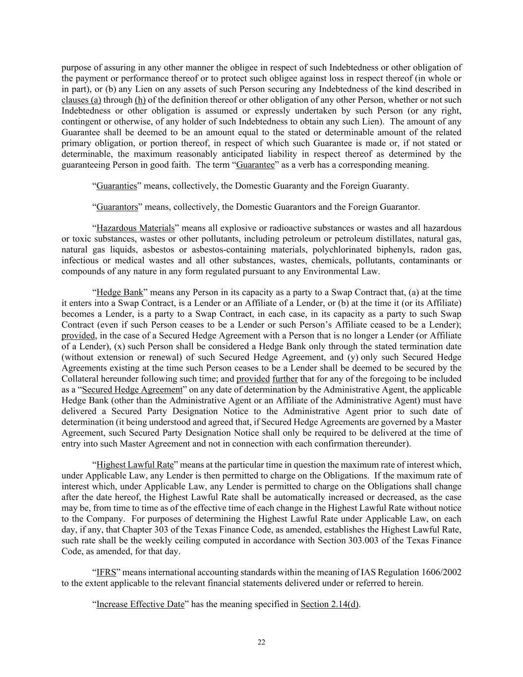 22 purpose of assuring in any other manner the obligee in respect of such Indebtedness or other obligation of the payment or performance thereof or to protect such obligee against loss in respect thereof (in whole or in part), or (b) any Lien on any assets of such Person securing any Indebtedness of the kind described in clauses (a) through (h) of the definition thereof or other obligation of any other Person, whether or not such Indebtedness or other obligation is assumed or expressly undertaken by such Person (or any right, contingent or otherwise, of any holder of such Indebtedness to obtain any such Lien). The amount of any Guarantee shall be deemed to be an amount equal to the stated or determinable amount of the related primary obligation, or portion thereof, in respect of which such Guarantee is made or, if not stated or determinable, the maximum reasonably anticipated liability in respect thereof as determined by the guaranteeing Person in good faith. The term “Guarantee” as a verb has a corresponding meaning. “Guaranties” means, collectively, the Domestic Guaranty and the Foreign Guaranty. “Guarantors” means, collectively, the Domestic Guarantors and the Foreign Guarantor. “Hazardous Materials” means all explosive or radioactive substances or wastes and all hazardous or toxic substances, wastes or other pollutants, including petroleum or petroleum distillates, natural gas, natural gas liquids, asbestos or asbestos-containing materials, polychlorinated biphenyls, radon gas, infectious or medical wastes and all other substances, wastes, chemicals, pollutants, contaminants or compounds of any nature in any form regulated pursuant to any Environmental Law. “Hedge Bank” means any Person in its capacity as a party to a Swap Contract that, (a) at the time it enters into a Swap Contract, is a Lender or an Affiliate of a Lender, or (b) at the time it (or its Affiliate) becomes a Lender, is a party to a Swap Contract, in each case, in its capacity as a party to such Swap Contract (even if such Person ceases to be a Lender or such Person’s Affiliate ceased to be a Lender); provided, in the case of a Secured Hedge Agreement with a Person that is no longer a Lender (or Affiliate of a Lender), (x) such Person shall be considered a Hedge Bank only through the stated termination date (without extension or renewal) of such Secured Hedge Agreement, and (y) only such Secured Hedge Agreements existing at the time such Person ceases to be a Lender shall be deemed to be secured by the Collateral hereunder following such time; and provided further that for any of the foregoing to be included as a “Secured Hedge Agreement” on any date of determination by the Administrative Agent, the applicable Hedge Bank (other than the Administrative Agent or an Affiliate of the Administrative Agent) must have delivered a Secured Party Designation Notice to the Administrative Agent prior to such date of determination (it being understood and agreed that, if Secured Hedge Agreements are governed by a Master Agreement, such Secured Party Designation Notice shall only be required to be delivered at the time of entry into such Master Agreement and not in connection with each confirmation thereunder). “Highest Lawful Rate” means at the particular time in question the maximum rate of interest which, under Applicable Law, any Lender is then permitted to charge on the Obligations. If the maximum rate of interest which, under Applicable Law, any Lender is permitted to charge on the Obligations shall change after the date hereof, the Highest Lawful Rate shall be automatically increased or decreased, as the case may be, from time to time as of the effective time of each change in the Highest Lawful Rate without notice to the Company. For purposes of determining the Highest Lawful Rate under Applicable Law, on each day, if any, that Chapter 303 of the Texas Finance Code, as amended, establishes the Highest Lawful Rate, such rate shall be the weekly ceiling computed in accordance with Section 303.003 of the Texas Finance Code, as amended, for that day. “IFRS” means international accounting standards within the meaning of IAS Regulation 1606/2002 to the extent applicable to the relevant financial statements delivered under or referred to herein. “Increase Effective Date” has the meaning specified in Section 2.14(d).