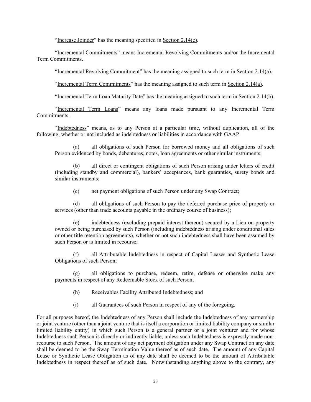 23 “Increase Joinder” has the meaning specified in Section 2.14(e). “Incremental Commitments” means Incremental Revolving Commitments and/or the Incremental Term Commitments. “Incremental Revolving Commitment” has the meaning assigned to such term in Section 2.14(a). “Incremental Term Commitments” has the meaning assigned to such term in Section 2.14(a). “Incremental Term Loan Maturity Date” has the meaning assigned to such term in Section 2.14(b). “Incremental Term Loans” means any loans made pursuant to any Incremental Term Commitments. “Indebtedness” means, as to any Person at a particular time, without duplication, all of the following, whether or not included as indebtedness or liabilities in accordance with GAAP: (a) all obligations of such Person for borrowed money and all obligations of such Person evidenced by bonds, debentures, notes, loan agreements or other similar instruments; (b) all direct or contingent obligations of such Person arising under letters of credit (including standby and commercial), bankers’ acceptances, bank guaranties, surety bonds and similar instruments; (c) net payment obligations of such Person under any Swap Contract; (d) all obligations of such Person to pay the deferred purchase price of property or services (other than trade accounts payable in the ordinary course of business); (e) indebtedness (excluding prepaid interest thereon) secured by a Lien on property owned or being purchased by such Person (including indebtedness arising under conditional sales or other title retention agreements), whether or not such indebtedness shall have been assumed by such Person or is limited in recourse; (f) all Attributable Indebtedness in respect of Capital Leases and Synthetic Lease Obligations of such Person; (g) all obligations to purchase, redeem, retire, defease or otherwise make any payments in respect of any Redeemable Stock of such Person; (h) Receivables Facility Attributed Indebtedness; and (i) all Guarantees of such Person in respect of any of the foregoing. For all purposes hereof, the Indebtedness of any Person shall include the Indebtedness of any partnership or joint venture (other than a joint venture that is itself a corporation or limited liability company or similar limited liability entity) in which such Person is a general partner or a joint venturer and for whose Indebtedness such Person is directly or indirectly liable, unless such Indebtedness is expressly made non- recourse to such Person. The amount of any net payment obligation under any Swap Contract on any date shall be deemed to be the Swap Termination Value thereof as of such date. The amount of any Capital Lease or Synthetic Lease Obligation as of any date shall be deemed to be the amount of Attributable Indebtedness in respect thereof as of such date. Notwithstanding anything above to the contrary, any