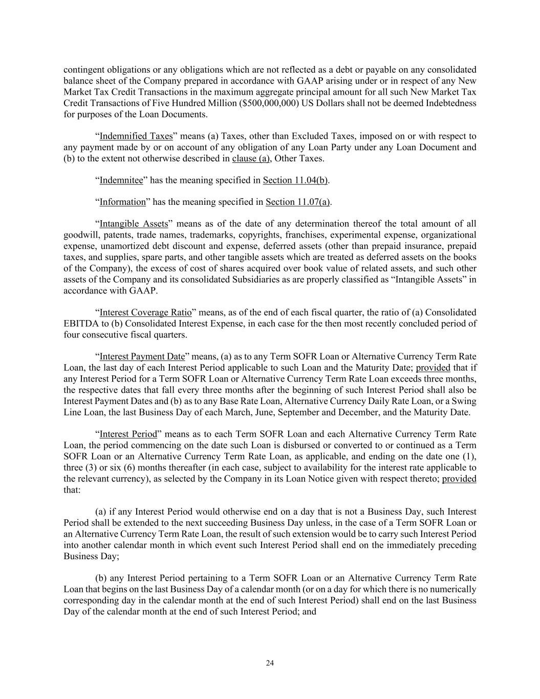 24 contingent obligations or any obligations which are not reflected as a debt or payable on any consolidated balance sheet of the Company prepared in accordance with GAAP arising under or in respect of any New Market Tax Credit Transactions in the maximum aggregate principal amount for all such New Market Tax Credit Transactions of Five Hundred Million ($500,000,000) US Dollars shall not be deemed Indebtedness for purposes of the Loan Documents. “Indemnified Taxes” means (a) Taxes, other than Excluded Taxes, imposed on or with respect to any payment made by or on account of any obligation of any Loan Party under any Loan Document and (b) to the extent not otherwise described in clause (a), Other Taxes. “Indemnitee” has the meaning specified in Section 11.04(b). “Information” has the meaning specified in Section 11.07(a). “Intangible Assets” means as of the date of any determination thereof the total amount of all goodwill, patents, trade names, trademarks, copyrights, franchises, experimental expense, organizational expense, unamortized debt discount and expense, deferred assets (other than prepaid insurance, prepaid taxes, and supplies, spare parts, and other tangible assets which are treated as deferred assets on the books of the Company), the excess of cost of shares acquired over book value of related assets, and such other assets of the Company and its consolidated Subsidiaries as are properly classified as “Intangible Assets” in accordance with GAAP. “Interest Coverage Ratio” means, as of the end of each fiscal quarter, the ratio of (a) Consolidated EBITDA to (b) Consolidated Interest Expense, in each case for the then most recently concluded period of four consecutive fiscal quarters. “Interest Payment Date” means, (a) as to any Term SOFR Loan or Alternative Currency Term Rate Loan, the last day of each Interest Period applicable to such Loan and the Maturity Date; provided that if any Interest Period for a Term SOFR Loan or Alternative Currency Term Rate Loan exceeds three months, the respective dates that fall every three months after the beginning of such Interest Period shall also be Interest Payment Dates and (b) as to any Base Rate Loan, Alternative Currency Daily Rate Loan, or a Swing Line Loan, the last Business Day of each March, June, September and December, and the Maturity Date. “Interest Period” means as to each Term SOFR Loan and each Alternative Currency Term Rate Loan, the period commencing on the date such Loan is disbursed or converted to or continued as a Term SOFR Loan or an Alternative Currency Term Rate Loan, as applicable, and ending on the date one (1), three (3) or six (6) months thereafter (in each case, subject to availability for the interest rate applicable to the relevant currency), as selected by the Company in its Loan Notice given with respect thereto; provided that: (a) if any Interest Period would otherwise end on a day that is not a Business Day, such Interest Period shall be extended to the next succeeding Business Day unless, in the case of a Term SOFR Loan or an Alternative Currency Term Rate Loan, the result of such extension would be to carry such Interest Period into another calendar month in which event such Interest Period shall end on the immediately preceding Business Day; (b) any Interest Period pertaining to a Term SOFR Loan or an Alternative Currency Term Rate Loan that begins on the last Business Day of a calendar month (or on a day for which there is no numerically corresponding day in the calendar month at the end of such Interest Period) shall end on the last Business Day of the calendar month at the end of such Interest Period; and