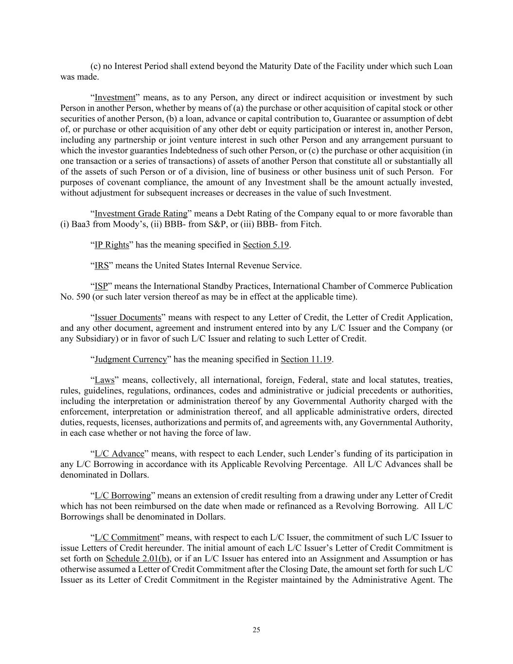25 (c) no Interest Period shall extend beyond the Maturity Date of the Facility under which such Loan was made. “Investment” means, as to any Person, any direct or indirect acquisition or investment by such Person in another Person, whether by means of (a) the purchase or other acquisition of capital stock or other securities of another Person, (b) a loan, advance or capital contribution to, Guarantee or assumption of debt of, or purchase or other acquisition of any other debt or equity participation or interest in, another Person, including any partnership or joint venture interest in such other Person and any arrangement pursuant to which the investor guaranties Indebtedness of such other Person, or (c) the purchase or other acquisition (in one transaction or a series of transactions) of assets of another Person that constitute all or substantially all of the assets of such Person or of a division, line of business or other business unit of such Person. For purposes of covenant compliance, the amount of any Investment shall be the amount actually invested, without adjustment for subsequent increases or decreases in the value of such Investment. “Investment Grade Rating” means a Debt Rating of the Company equal to or more favorable than (i) Baa3 from Moody’s, (ii) BBB- from S&P, or (iii) BBB- from Fitch. “IP Rights” has the meaning specified in Section 5.19. “IRS” means the United States Internal Revenue Service. “ISP” means the International Standby Practices, International Chamber of Commerce Publication No. 590 (or such later version thereof as may be in effect at the applicable time). “Issuer Documents” means with respect to any Letter of Credit, the Letter of Credit Application, and any other document, agreement and instrument entered into by any L/C Issuer and the Company (or any Subsidiary) or in favor of such L/C Issuer and relating to such Letter of Credit. “Judgment Currency” has the meaning specified in Section 11.19. “Laws” means, collectively, all international, foreign, Federal, state and local statutes, treaties, rules, guidelines, regulations, ordinances, codes and administrative or judicial precedents or authorities, including the interpretation or administration thereof by any Governmental Authority charged with the enforcement, interpretation or administration thereof, and all applicable administrative orders, directed duties, requests, licenses, authorizations and permits of, and agreements with, any Governmental Authority, in each case whether or not having the force of law. “L/C Advance” means, with respect to each Lender, such Lender’s funding of its participation in any L/C Borrowing in accordance with its Applicable Revolving Percentage. All L/C Advances shall be denominated in Dollars. “L/C Borrowing” means an extension of credit resulting from a drawing under any Letter of Credit which has not been reimbursed on the date when made or refinanced as a Revolving Borrowing. All L/C Borrowings shall be denominated in Dollars. “L/C Commitment” means, with respect to each L/C Issuer, the commitment of such L/C Issuer to issue Letters of Credit hereunder. The initial amount of each L/C Issuer’s Letter of Credit Commitment is set forth on Schedule 2.01(b), or if an L/C Issuer has entered into an Assignment and Assumption or has otherwise assumed a Letter of Credit Commitment after the Closing Date, the amount set forth for such L/C Issuer as its Letter of Credit Commitment in the Register maintained by the Administrative Agent. The