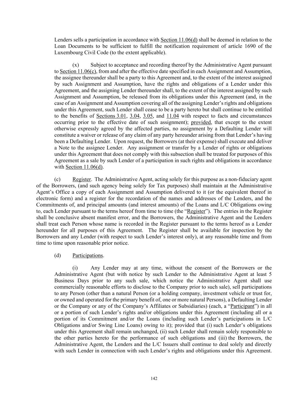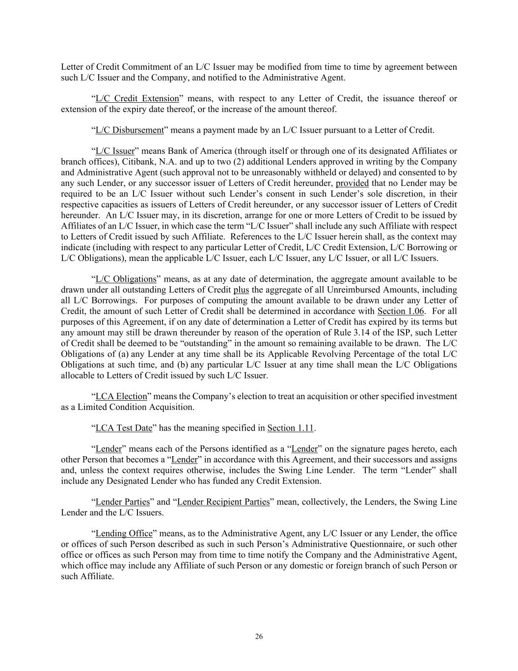 26 Letter of Credit Commitment of an L/C Issuer may be modified from time to time by agreement between such L/C Issuer and the Company, and notified to the Administrative Agent. “L/C Credit Extension” means, with respect to any Letter of Credit, the issuance thereof or extension of the expiry date thereof, or the increase of the amount thereof. “L/C Disbursement” means a payment made by an L/C Issuer pursuant to a Letter of Credit. “L/C Issuer” means Bank of America (through itself or through one of its designated Affiliates or branch offices), Citibank, N.A. and up to two (2) additional Lenders approved in writing by the Company and Administrative Agent (such approval not to be unreasonably withheld or delayed) and consented to by any such Lender, or any successor issuer of Letters of Credit hereunder, provided that no Lender may be required to be an L/C Issuer without such Lender’s consent in such Lender’s sole discretion, in their respective capacities as issuers of Letters of Credit hereunder, or any successor issuer of Letters of Credit hereunder. An L/C Issuer may, in its discretion, arrange for one or more Letters of Credit to be issued by Affiliates of an L/C Issuer, in which case the term “L/C Issuer” shall include any such Affiliate with respect to Letters of Credit issued by such Affiliate. References to the L/C Issuer herein shall, as the context may indicate (including with respect to any particular Letter of Credit, L/C Credit Extension, L/C Borrowing or L/C Obligations), mean the applicable L/C Issuer, each L/C Issuer, any L/C Issuer, or all L/C Issuers. “L/C Obligations” means, as at any date of determination, the aggregate amount available to be drawn under all outstanding Letters of Credit plus the aggregate of all Unreimbursed Amounts, including all L/C Borrowings. For purposes of computing the amount available to be drawn under any Letter of Credit, the amount of such Letter of Credit shall be determined in accordance with Section 1.06. For all purposes of this Agreement, if on any date of determination a Letter of Credit has expired by its terms but any amount may still be drawn thereunder by reason of the operation of Rule 3.14 of the ISP, such Letter of Credit shall be deemed to be “outstanding” in the amount so remaining available to be drawn. The L/C Obligations of (a) any Lender at any time shall be its Applicable Revolving Percentage of the total L/C Obligations at such time, and (b) any particular L/C Issuer at any time shall mean the L/C Obligations allocable to Letters of Credit issued by such L/C Issuer. “LCA Election” means the Company’s election to treat an acquisition or other specified investment as a Limited Condition Acquisition. “LCA Test Date” has the meaning specified in Section 1.11. “Lender” means each of the Persons identified as a “Lender” on the signature pages hereto, each other Person that becomes a “Lender” in accordance with this Agreement, and their successors and assigns and, unless the context requires otherwise, includes the Swing Line Lender. The term “Lender” shall include any Designated Lender who has funded any Credit Extension. “Lender Parties” and “Lender Recipient Parties” mean, collectively, the Lenders, the Swing Line Lender and the L/C Issuers. “Lending Office” means, as to the Administrative Agent, any L/C Issuer or any Lender, the office or offices of such Person described as such in such Person’s Administrative Questionnaire, or such other office or offices as such Person may from time to time notify the Company and the Administrative Agent, which office may include any Affiliate of such Person or any domestic or foreign branch of such Person or such Affiliate.