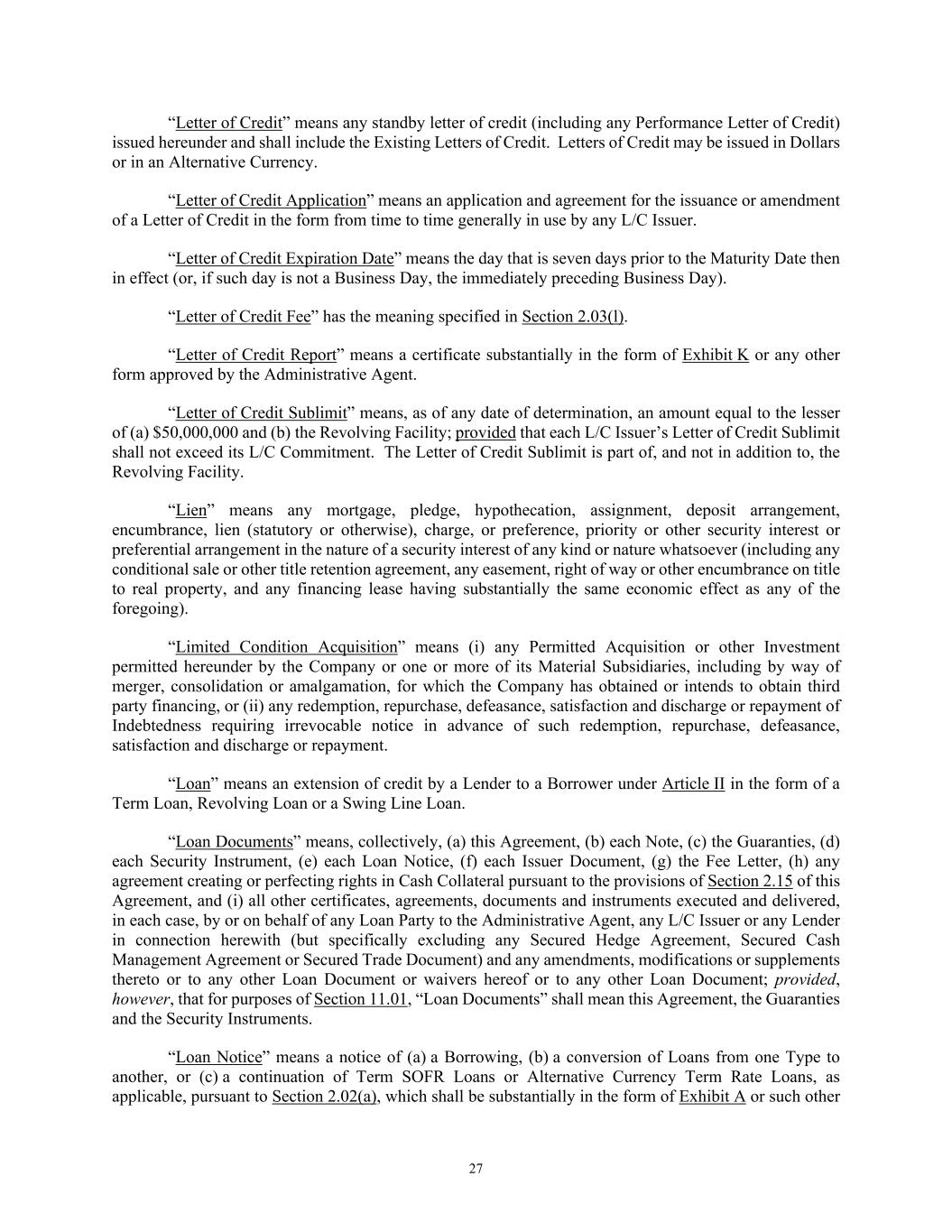 27 “Letter of Credit” means any standby letter of credit (including any Performance Letter of Credit) issued hereunder and shall include the Existing Letters of Credit. Letters of Credit may be issued in Dollars or in an Alternative Currency. “Letter of Credit Application” means an application and agreement for the issuance or amendment of a Letter of Credit in the form from time to time generally in use by any L/C Issuer. “Letter of Credit Expiration Date” means the day that is seven days prior to the Maturity Date then in effect (or, if such day is not a Business Day, the immediately preceding Business Day). “Letter of Credit Fee” has the meaning specified in Section 2.03(l). “Letter of Credit Report” means a certificate substantially in the form of Exhibit K or any other form approved by the Administrative Agent. “Letter of Credit Sublimit” means, as of any date of determination, an amount equal to the lesser of (a) $50,000,000 and (b) the Revolving Facility; provided that each L/C Issuer’s Letter of Credit Sublimit shall not exceed its L/C Commitment. The Letter of Credit Sublimit is part of, and not in addition to, the Revolving Facility. “Lien” means any mortgage, pledge, hypothecation, assignment, deposit arrangement, encumbrance, lien (statutory or otherwise), charge, or preference, priority or other security interest or preferential arrangement in the nature of a security interest of any kind or nature whatsoever (including any conditional sale or other title retention agreement, any easement, right of way or other encumbrance on title to real property, and any financing lease having substantially the same economic effect as any of the foregoing). “Limited Condition Acquisition” means (i) any Permitted Acquisition or other Investment permitted hereunder by the Company or one or more of its Material Subsidiaries, including by way of merger, consolidation or amalgamation, for which the Company has obtained or intends to obtain third party financing, or (ii) any redemption, repurchase, defeasance, satisfaction and discharge or repayment of Indebtedness requiring irrevocable notice in advance of such redemption, repurchase, defeasance, satisfaction and discharge or repayment. “Loan” means an extension of credit by a Lender to a Borrower under Article II in the form of a Term Loan, Revolving Loan or a Swing Line Loan. “Loan Documents” means, collectively, (a) this Agreement, (b) each Note, (c) the Guaranties, (d) each Security Instrument, (e) each Loan Notice, (f) each Issuer Document, (g) the Fee Letter, (h) any agreement creating or perfecting rights in Cash Collateral pursuant to the provisions of Section 2.15 of this Agreement, and (i) all other certificates, agreements, documents and instruments executed and delivered, in each case, by or on behalf of any Loan Party to the Administrative Agent, any L/C Issuer or any Lender in connection herewith (but specifically excluding any Secured Hedge Agreement, Secured Cash Management Agreement or Secured Trade Document) and any amendments, modifications or supplements thereto or to any other Loan Document or waivers hereof or to any other Loan Document; provided, however, that for purposes of Section 11.01, “Loan Documents” shall mean this Agreement, the Guaranties and the Security Instruments. “Loan Notice” means a notice of (a) a Borrowing, (b) a conversion of Loans from one Type to another, or (c) a continuation of Term SOFR Loans or Alternative Currency Term Rate Loans, as applicable, pursuant to Section 2.02(a), which shall be substantially in the form of Exhibit A or such other