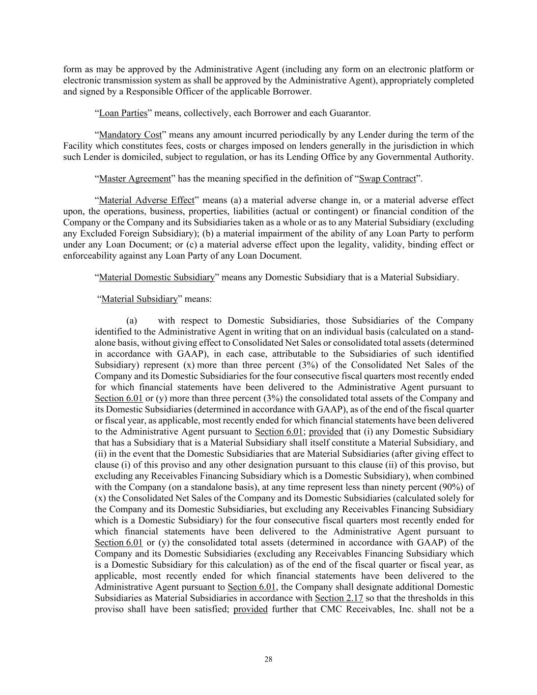 28 form as may be approved by the Administrative Agent (including any form on an electronic platform or electronic transmission system as shall be approved by the Administrative Agent), appropriately completed and signed by a Responsible Officer of the applicable Borrower. “Loan Parties” means, collectively, each Borrower and each Guarantor. “Mandatory Cost” means any amount incurred periodically by any Lender during the term of the Facility which constitutes fees, costs or charges imposed on lenders generally in the jurisdiction in which such Lender is domiciled, subject to regulation, or has its Lending Office by any Governmental Authority. “Master Agreement” has the meaning specified in the definition of “Swap Contract”. “Material Adverse Effect” means (a) a material adverse change in, or a material adverse effect upon, the operations, business, properties, liabilities (actual or contingent) or financial condition of the Company or the Company and its Subsidiaries taken as a whole or as to any Material Subsidiary (excluding any Excluded Foreign Subsidiary); (b) a material impairment of the ability of any Loan Party to perform under any Loan Document; or (c) a material adverse effect upon the legality, validity, binding effect or enforceability against any Loan Party of any Loan Document. “Material Domestic Subsidiary” means any Domestic Subsidiary that is a Material Subsidiary. “Material Subsidiary” means: (a) with respect to Domestic Subsidiaries, those Subsidiaries of the Company identified to the Administrative Agent in writing that on an individual basis (calculated on a stand- alone basis, without giving effect to Consolidated Net Sales or consolidated total assets (determined in accordance with GAAP), in each case, attributable to the Subsidiaries of such identified Subsidiary) represent (x) more than three percent (3%) of the Consolidated Net Sales of the Company and its Domestic Subsidiaries for the four consecutive fiscal quarters most recently ended for which financial statements have been delivered to the Administrative Agent pursuant to Section 6.01 or (y) more than three percent (3%) the consolidated total assets of the Company and its Domestic Subsidiaries (determined in accordance with GAAP), as of the end of the fiscal quarter or fiscal year, as applicable, most recently ended for which financial statements have been delivered to the Administrative Agent pursuant to Section 6.01; provided that (i) any Domestic Subsidiary that has a Subsidiary that is a Material Subsidiary shall itself constitute a Material Subsidiary, and (ii) in the event that the Domestic Subsidiaries that are Material Subsidiaries (after giving effect to clause (i) of this proviso and any other designation pursuant to this clause (ii) of this proviso, but excluding any Receivables Financing Subsidiary which is a Domestic Subsidiary), when combined with the Company (on a standalone basis), at any time represent less than ninety percent (90%) of (x) the Consolidated Net Sales of the Company and its Domestic Subsidiaries (calculated solely for the Company and its Domestic Subsidiaries, but excluding any Receivables Financing Subsidiary which is a Domestic Subsidiary) for the four consecutive fiscal quarters most recently ended for which financial statements have been delivered to the Administrative Agent pursuant to Section 6.01 or (y) the consolidated total assets (determined in accordance with GAAP) of the Company and its Domestic Subsidiaries (excluding any Receivables Financing Subsidiary which is a Domestic Subsidiary for this calculation) as of the end of the fiscal quarter or fiscal year, as applicable, most recently ended for which financial statements have been delivered to the Administrative Agent pursuant to Section 6.01, the Company shall designate additional Domestic Subsidiaries as Material Subsidiaries in accordance with Section 2.17 so that the thresholds in this proviso shall have been satisfied; provided further that CMC Receivables, Inc. shall not be a