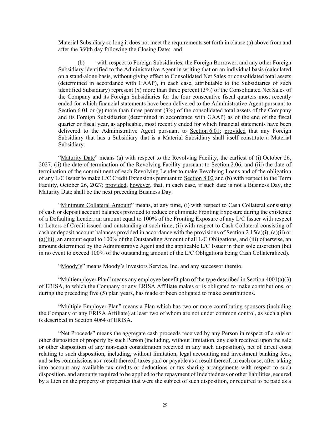 29 Material Subsidiary so long it does not meet the requirements set forth in clause (a) above from and after the 360th day following the Closing Date; and (b) with respect to Foreign Subsidiaries, the Foreign Borrower, and any other Foreign Subsidiary identified to the Administrative Agent in writing that on an individual basis (calculated on a stand-alone basis, without giving effect to Consolidated Net Sales or consolidated total assets (determined in accordance with GAAP), in each case, attributable to the Subsidiaries of such identified Subsidiary) represent (x) more than three percent (3%) of the Consolidated Net Sales of the Company and its Foreign Subsidiaries for the four consecutive fiscal quarters most recently ended for which financial statements have been delivered to the Administrative Agent pursuant to Section 6.01 or (y) more than three percent (3%) of the consolidated total assets of the Company and its Foreign Subsidiaries (determined in accordance with GAAP) as of the end of the fiscal quarter or fiscal year, as applicable, most recently ended for which financial statements have been delivered to the Administrative Agent pursuant to Section 6.01; provided that any Foreign Subsidiary that has a Subsidiary that is a Material Subsidiary shall itself constitute a Material Subsidiary. “Maturity Date” means (a) with respect to the Revolving Facility, the earliest of (i) October 26, 2027, (ii) the date of termination of the Revolving Facility pursuant to Section 2.06, and (iii) the date of termination of the commitment of each Revolving Lender to make Revolving Loans and of the obligation of any L/C Issuer to make L/C Credit Extensions pursuant to Section 8.02 and (b) with respect to the Term Facility, October 26, 2027; provided, however, that, in each case, if such date is not a Business Day, the Maturity Date shall be the next preceding Business Day. “Minimum Collateral Amount” means, at any time, (i) with respect to Cash Collateral consisting of cash or deposit account balances provided to reduce or eliminate Fronting Exposure during the existence of a Defaulting Lender, an amount equal to 100% of the Fronting Exposure of any L/C Issuer with respect to Letters of Credit issued and outstanding at such time, (ii) with respect to Cash Collateral consisting of cash or deposit account balances provided in accordance with the provisions of Section 2.15(a)(i), (a)(ii) or (a)(iii), an amount equal to 100% of the Outstanding Amount of all L/C Obligations, and (iii) otherwise, an amount determined by the Administrative Agent and the applicable L/C Issuer in their sole discretion (but in no event to exceed 100% of the outstanding amount of the L/C Obligations being Cash Collateralized). “Moody’s” means Moody’s Investors Service, Inc. and any successor thereto. “Multiemployer Plan” means any employee benefit plan of the type described in Section 4001(a)(3) of ERISA, to which the Company or any ERISA Affiliate makes or is obligated to make contributions, or during the preceding five (5) plan years, has made or been obligated to make contributions. “Multiple Employer Plan” means a Plan which has two or more contributing sponsors (including the Company or any ERISA Affiliate) at least two of whom are not under common control, as such a plan is described in Section 4064 of ERISA. “Net Proceeds” means the aggregate cash proceeds received by any Person in respect of a sale or other disposition of property by such Person (including, without limitation, any cash received upon the sale or other disposition of any non-cash consideration received in any such disposition), net of direct costs relating to such disposition, including, without limitation, legal accounting and investment banking fees, and sales commissions as a result thereof, taxes paid or payable as a result thereof, in each case, after taking into account any available tax credits or deductions or tax sharing arrangements with respect to such disposition, and amounts required to be applied to the repayment of Indebtedness or other liabilities, secured by a Lien on the property or properties that were the subject of such disposition, or required to be paid as a