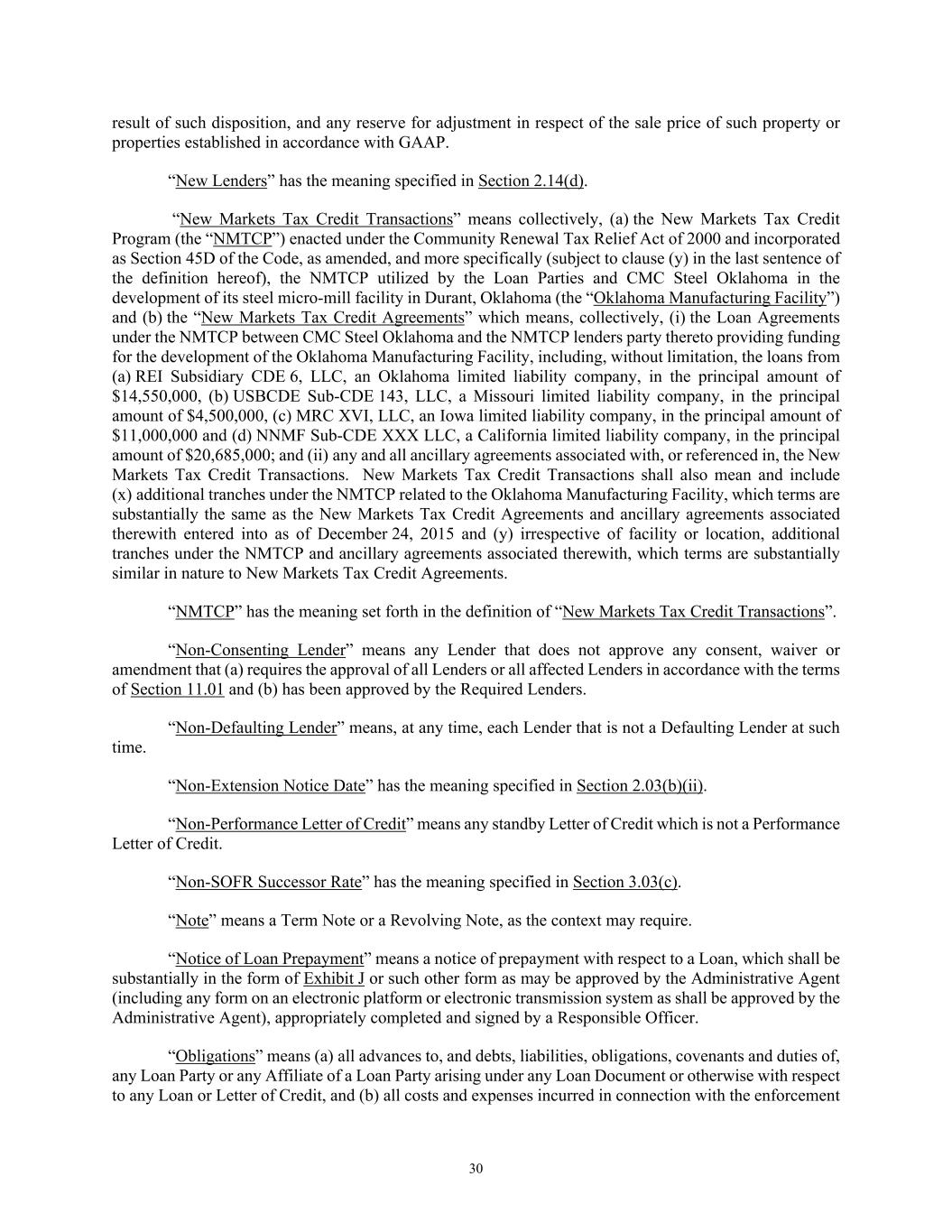 30 result of such disposition, and any reserve for adjustment in respect of the sale price of such property or properties established in accordance with GAAP. “New Lenders” has the meaning specified in Section 2.14(d). “New Markets Tax Credit Transactions” means collectively, (a) the New Markets Tax Credit Program (the “NMTCP”) enacted under the Community Renewal Tax Relief Act of 2000 and incorporated as Section 45D of the Code, as amended, and more specifically (subject to clause (y) in the last sentence of the definition hereof), the NMTCP utilized by the Loan Parties and CMC Steel Oklahoma in the development of its steel micro-mill facility in Durant, Oklahoma (the “Oklahoma Manufacturing Facility”) and (b) the “New Markets Tax Credit Agreements” which means, collectively, (i) the Loan Agreements under the NMTCP between CMC Steel Oklahoma and the NMTCP lenders party thereto providing funding for the development of the Oklahoma Manufacturing Facility, including, without limitation, the loans from (a) REI Subsidiary CDE 6, LLC, an Oklahoma limited liability company, in the principal amount of $14,550,000, (b) USBCDE Sub-CDE 143, LLC, a Missouri limited liability company, in the principal amount of $4,500,000, (c) MRC XVI, LLC, an Iowa limited liability company, in the principal amount of $11,000,000 and (d) NNMF Sub-CDE XXX LLC, a California limited liability company, in the principal amount of $20,685,000; and (ii) any and all ancillary agreements associated with, or referenced in, the New Markets Tax Credit Transactions. New Markets Tax Credit Transactions shall also mean and include (x) additional tranches under the NMTCP related to the Oklahoma Manufacturing Facility, which terms are substantially the same as the New Markets Tax Credit Agreements and ancillary agreements associated therewith entered into as of December 24, 2015 and (y) irrespective of facility or location, additional tranches under the NMTCP and ancillary agreements associated therewith, which terms are substantially similar in nature to New Markets Tax Credit Agreements. “NMTCP” has the meaning set forth in the definition of “New Markets Tax Credit Transactions”. “Non-Consenting Lender” means any Lender that does not approve any consent, waiver or amendment that (a) requires the approval of all Lenders or all affected Lenders in accordance with the terms of Section 11.01 and (b) has been approved by the Required Lenders. “Non-Defaulting Lender” means, at any time, each Lender that is not a Defaulting Lender at such time. “Non-Extension Notice Date” has the meaning specified in Section 2.03(b)(ii). “Non-Performance Letter of Credit” means any standby Letter of Credit which is not a Performance Letter of Credit. “Non-SOFR Successor Rate” has the meaning specified in Section 3.03(c). “Note” means a Term Note or a Revolving Note, as the context may require. “Notice of Loan Prepayment” means a notice of prepayment with respect to a Loan, which shall be substantially in the form of Exhibit J or such other form as may be approved by the Administrative Agent (including any form on an electronic platform or electronic transmission system as shall be approved by the Administrative Agent), appropriately completed and signed by a Responsible Officer. “Obligations” means (a) all advances to, and debts, liabilities, obligations, covenants and duties of, any Loan Party or any Affiliate of a Loan Party arising under any Loan Document or otherwise with respect to any Loan or Letter of Credit, and (b) all costs and expenses incurred in connection with the enforcement