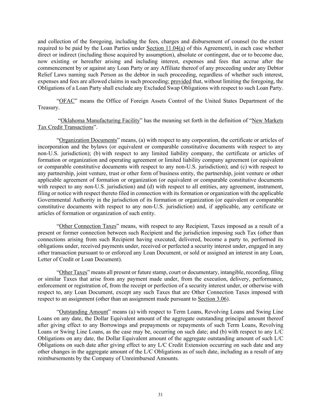 31 and collection of the foregoing, including the fees, charges and disbursement of counsel (to the extent required to be paid by the Loan Parties under Section 11.04(a) of this Agreement), in each case whether direct or indirect (including those acquired by assumption), absolute or contingent, due or to become due, now existing or hereafter arising and including interest, expenses and fees that accrue after the commencement by or against any Loan Party or any Affiliate thereof of any proceeding under any Debtor Relief Laws naming such Person as the debtor in such proceeding, regardless of whether such interest, expenses and fees are allowed claims in such proceeding; provided that, without limiting the foregoing, the Obligations of a Loan Party shall exclude any Excluded Swap Obligations with respect to such Loan Party. “OFAC” means the Office of Foreign Assets Control of the United States Department of the Treasury. “Oklahoma Manufacturing Facility” has the meaning set forth in the definition of “New Markets Tax Credit Transactions”. “Organization Documents” means, (a) with respect to any corporation, the certificate or articles of incorporation and the bylaws (or equivalent or comparable constitutive documents with respect to any non-U.S. jurisdiction); (b) with respect to any limited liability company, the certificate or articles of formation or organization and operating agreement or limited liability company agreement (or equivalent or comparable constitutive documents with respect to any non-U.S. jurisdiction); and (c) with respect to any partnership, joint venture, trust or other form of business entity, the partnership, joint venture or other applicable agreement of formation or organization (or equivalent or comparable constitutive documents with respect to any non-U.S. jurisdiction) and (d) with respect to all entities, any agreement, instrument, filing or notice with respect thereto filed in connection with its formation or organization with the applicable Governmental Authority in the jurisdiction of its formation or organization (or equivalent or comparable constitutive documents with respect to any non-U.S. jurisdiction) and, if applicable, any certificate or articles of formation or organization of such entity. “Other Connection Taxes” means, with respect to any Recipient, Taxes imposed as a result of a present or former connection between such Recipient and the jurisdiction imposing such Tax (other than connections arising from such Recipient having executed, delivered, become a party to, performed its obligations under, received payments under, received or perfected a security interest under, engaged in any other transaction pursuant to or enforced any Loan Document, or sold or assigned an interest in any Loan, Letter of Credit or Loan Document). “Other Taxes” means all present or future stamp, court or documentary, intangible, recording, filing or similar Taxes that arise from any payment made under, from the execution, delivery, performance, enforcement or registration of, from the receipt or perfection of a security interest under, or otherwise with respect to, any Loan Document, except any such Taxes that are Other Connection Taxes imposed with respect to an assignment (other than an assignment made pursuant to Section 3.06). “Outstanding Amount” means (a) with respect to Term Loans, Revolving Loans and Swing Line Loans on any date, the Dollar Equivalent amount of the aggregate outstanding principal amount thereof after giving effect to any Borrowings and prepayments or repayments of such Term Loans, Revolving Loans or Swing Line Loans, as the case may be, occurring on such date; and (b) with respect to any L/C Obligations on any date, the Dollar Equivalent amount of the aggregate outstanding amount of such L/C Obligations on such date after giving effect to any L/C Credit Extension occurring on such date and any other changes in the aggregate amount of the L/C Obligations as of such date, including as a result of any reimbursements by the Company of Unreimbursed Amounts.