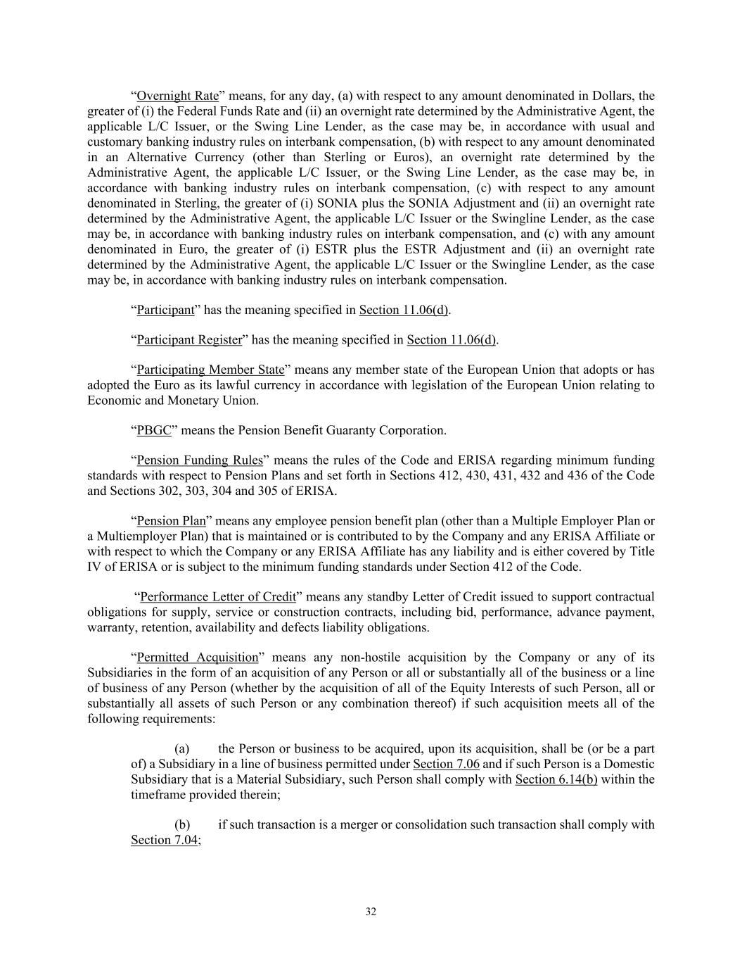 32 “Overnight Rate” means, for any day, (a) with respect to any amount denominated in Dollars, the greater of (i) the Federal Funds Rate and (ii) an overnight rate determined by the Administrative Agent, the applicable L/C Issuer, or the Swing Line Lender, as the case may be, in accordance with usual and customary banking industry rules on interbank compensation, (b) with respect to any amount denominated in an Alternative Currency (other than Sterling or Euros), an overnight rate determined by the Administrative Agent, the applicable L/C Issuer, or the Swing Line Lender, as the case may be, in accordance with banking industry rules on interbank compensation, (c) with respect to any amount denominated in Sterling, the greater of (i) SONIA plus the SONIA Adjustment and (ii) an overnight rate determined by the Administrative Agent, the applicable L/C Issuer or the Swingline Lender, as the case may be, in accordance with banking industry rules on interbank compensation, and (c) with any amount denominated in Euro, the greater of (i) ESTR plus the ESTR Adjustment and (ii) an overnight rate determined by the Administrative Agent, the applicable L/C Issuer or the Swingline Lender, as the case may be, in accordance with banking industry rules on interbank compensation. “Participant” has the meaning specified in Section 11.06(d). “Participant Register” has the meaning specified in Section 11.06(d). “Participating Member State” means any member state of the European Union that adopts or has adopted the Euro as its lawful currency in accordance with legislation of the European Union relating to Economic and Monetary Union. “PBGC” means the Pension Benefit Guaranty Corporation. “Pension Funding Rules” means the rules of the Code and ERISA regarding minimum funding standards with respect to Pension Plans and set forth in Sections 412, 430, 431, 432 and 436 of the Code and Sections 302, 303, 304 and 305 of ERISA. “Pension Plan” means any employee pension benefit plan (other than a Multiple Employer Plan or a Multiemployer Plan) that is maintained or is contributed to by the Company and any ERISA Affiliate or with respect to which the Company or any ERISA Affiliate has any liability and is either covered by Title IV of ERISA or is subject to the minimum funding standards under Section 412 of the Code. “Performance Letter of Credit” means any standby Letter of Credit issued to support contractual obligations for supply, service or construction contracts, including bid, performance, advance payment, warranty, retention, availability and defects liability obligations. “Permitted Acquisition” means any non-hostile acquisition by the Company or any of its Subsidiaries in the form of an acquisition of any Person or all or substantially all of the business or a line of business of any Person (whether by the acquisition of all of the Equity Interests of such Person, all or substantially all assets of such Person or any combination thereof) if such acquisition meets all of the following requirements: (a) the Person or business to be acquired, upon its acquisition, shall be (or be a part of) a Subsidiary in a line of business permitted under Section 7.06 and if such Person is a Domestic Subsidiary that is a Material Subsidiary, such Person shall comply with Section 6.14(b) within the timeframe provided therein; (b) if such transaction is a merger or consolidation such transaction shall comply with Section 7.04;