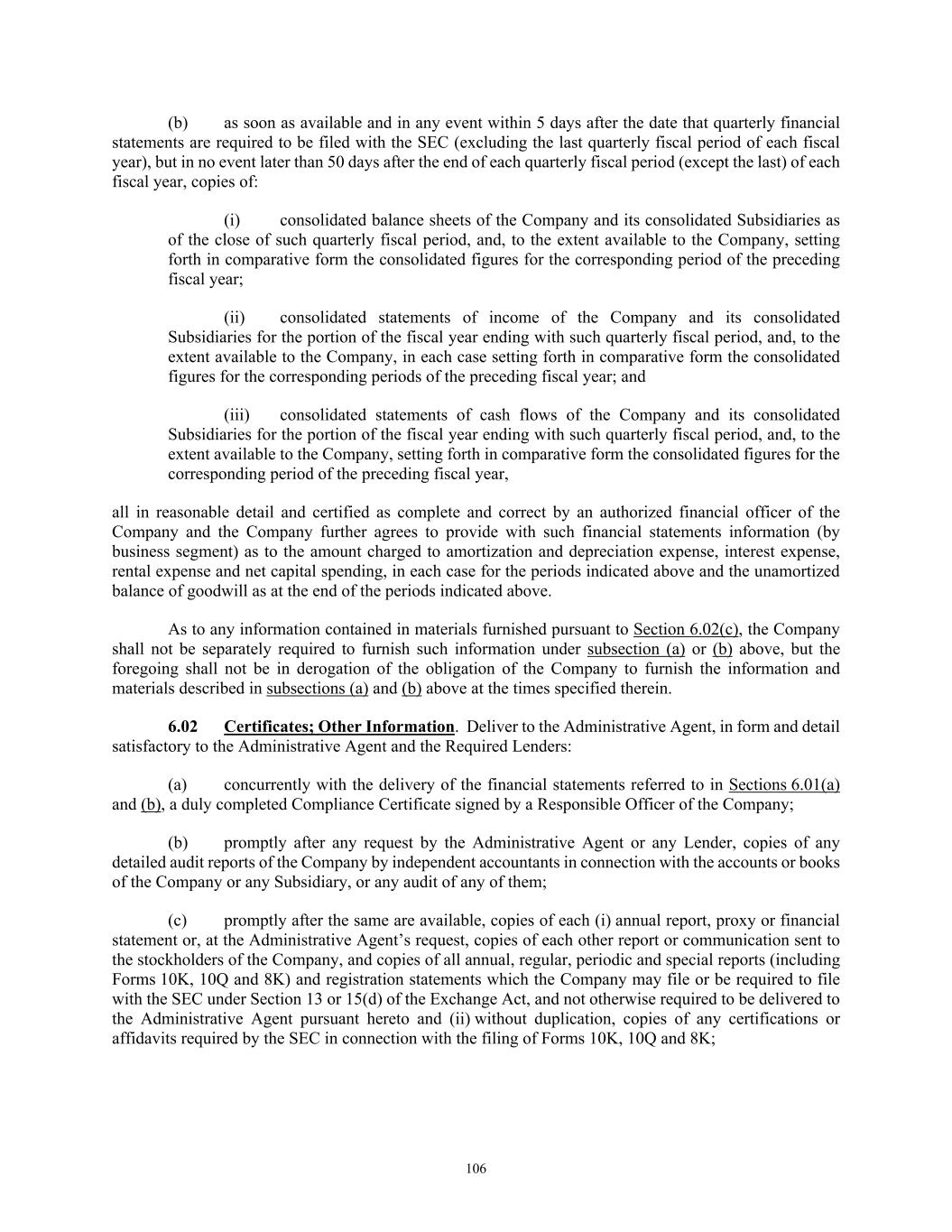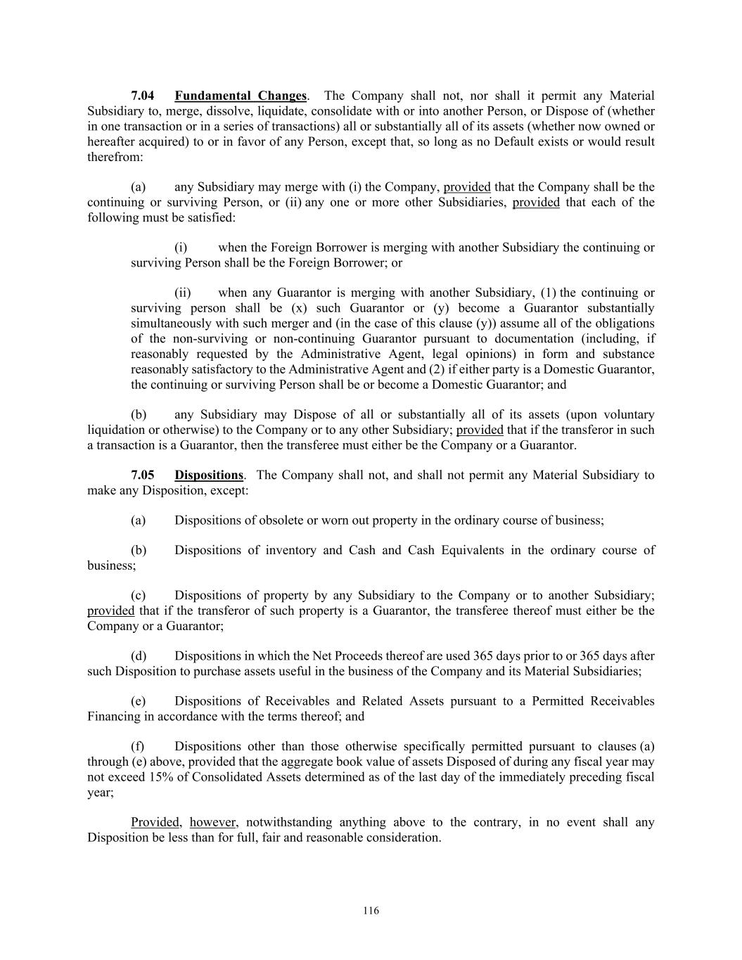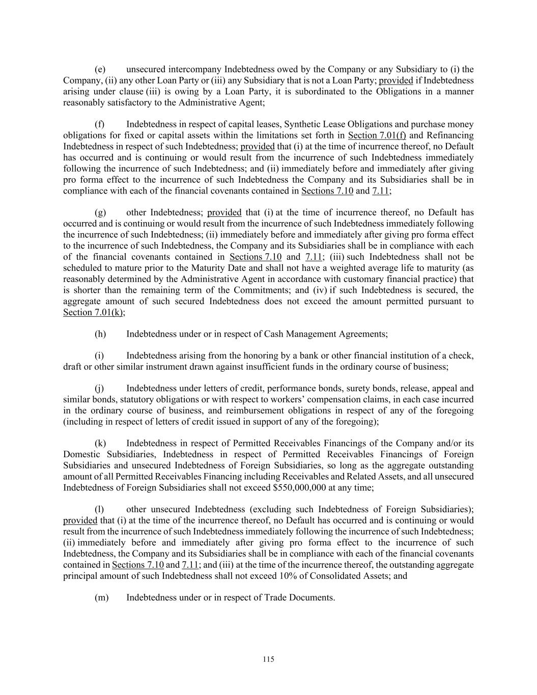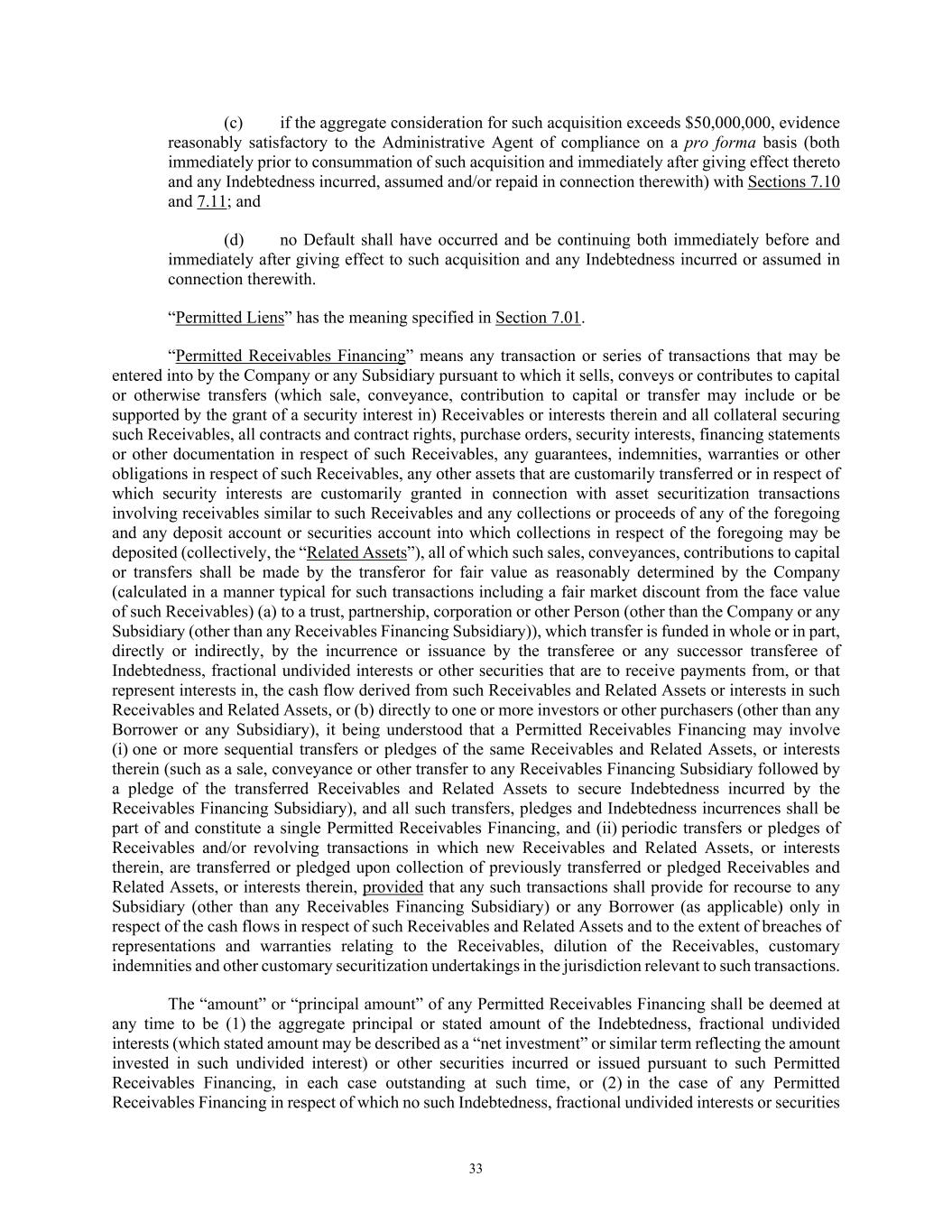 33 (c) if the aggregate consideration for such acquisition exceeds $50,000,000, evidence reasonably satisfactory to the Administrative Agent of compliance on a pro forma basis (both immediately prior to consummation of such acquisition and immediately after giving effect thereto and any Indebtedness incurred, assumed and/or repaid in connection therewith) with Sections 7.10 and 7.11; and (d) no Default shall have occurred and be continuing both immediately before and immediately after giving effect to such acquisition and any Indebtedness incurred or assumed in connection therewith. “Permitted Liens” has the meaning specified in Section 7.01. “Permitted Receivables Financing” means any transaction or series of transactions that may be entered into by the Company or any Subsidiary pursuant to which it sells, conveys or contributes to capital or otherwise transfers (which sale, conveyance, contribution to capital or transfer may include or be supported by the grant of a security interest in) Receivables or interests therein and all collateral securing such Receivables, all contracts and contract rights, purchase orders, security interests, financing statements or other documentation in respect of such Receivables, any guarantees, indemnities, warranties or other obligations in respect of such Receivables, any other assets that are customarily transferred or in respect of which security interests are customarily granted in connection with asset securitization transactions involving receivables similar to such Receivables and any collections or proceeds of any of the foregoing and any deposit account or securities account into which collections in respect of the foregoing may be deposited (collectively, the “Related Assets”), all of which such sales, conveyances, contributions to capital or transfers shall be made by the transferor for fair value as reasonably determined by the Company (calculated in a manner typical for such transactions including a fair market discount from the face value of such Receivables) (a) to a trust, partnership, corporation or other Person (other than the Company or any Subsidiary (other than any Receivables Financing Subsidiary)), which transfer is funded in whole or in part, directly or indirectly, by the incurrence or issuance by the transferee or any successor transferee of Indebtedness, fractional undivided interests or other securities that are to receive payments from, or that represent interests in, the cash flow derived from such Receivables and Related Assets or interests in such Receivables and Related Assets, or (b) directly to one or more investors or other purchasers (other than any Borrower or any Subsidiary), it being understood that a Permitted Receivables Financing may involve (i) one or more sequential transfers or pledges of the same Receivables and Related Assets, or interests therein (such as a sale, conveyance or other transfer to any Receivables Financing Subsidiary followed by a pledge of the transferred Receivables and Related Assets to secure Indebtedness incurred by the Receivables Financing Subsidiary), and all such transfers, pledges and Indebtedness incurrences shall be part of and constitute a single Permitted Receivables Financing, and (ii) periodic transfers or pledges of Receivables and/or revolving transactions in which new Receivables and Related Assets, or interests therein, are transferred or pledged upon collection of previously transferred or pledged Receivables and Related Assets, or interests therein, provided that any such transactions shall provide for recourse to any Subsidiary (other than any Receivables Financing Subsidiary) or any Borrower (as applicable) only in respect of the cash flows in respect of such Receivables and Related Assets and to the extent of breaches of representations and warranties relating to the Receivables, dilution of the Receivables, customary indemnities and other customary securitization undertakings in the jurisdiction relevant to such transactions. The “amount” or “principal amount” of any Permitted Receivables Financing shall be deemed at any time to be (1) the aggregate principal or stated amount of the Indebtedness, fractional undivided interests (which stated amount may be described as a “net investment” or similar term reflecting the amount invested in such undivided interest) or other securities incurred or issued pursuant to such Permitted Receivables Financing, in each case outstanding at such time, or (2) in the case of any Permitted Receivables Financing in respect of which no such Indebtedness, fractional undivided interests or securities