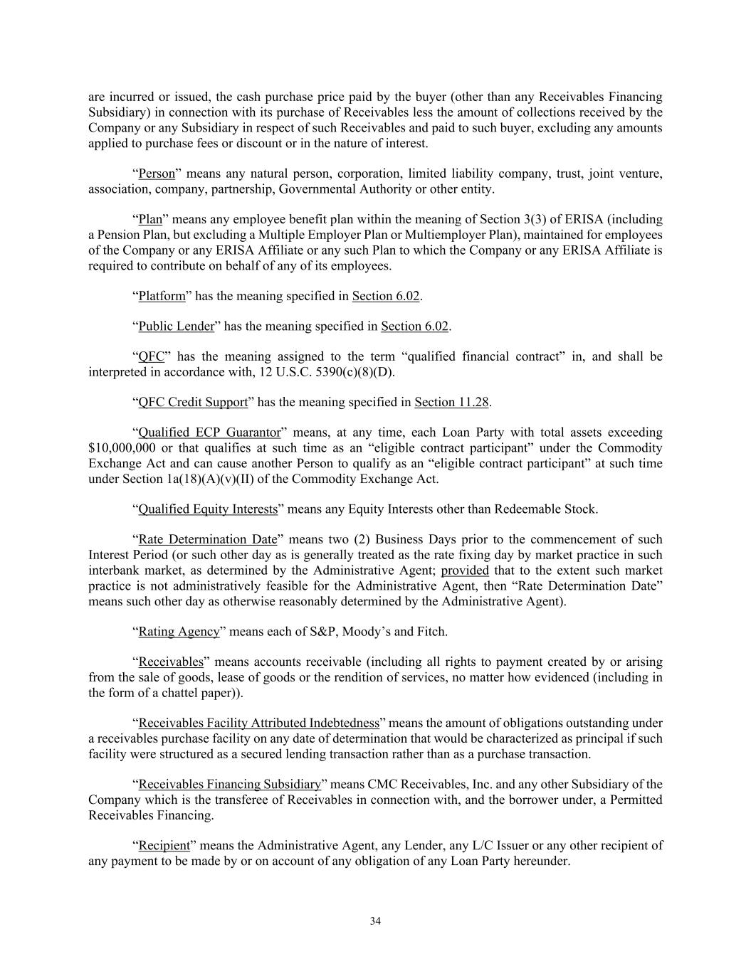 34 are incurred or issued, the cash purchase price paid by the buyer (other than any Receivables Financing Subsidiary) in connection with its purchase of Receivables less the amount of collections received by the Company or any Subsidiary in respect of such Receivables and paid to such buyer, excluding any amounts applied to purchase fees or discount or in the nature of interest. “Person” means any natural person, corporation, limited liability company, trust, joint venture, association, company, partnership, Governmental Authority or other entity. “Plan” means any employee benefit plan within the meaning of Section 3(3) of ERISA (including a Pension Plan, but excluding a Multiple Employer Plan or Multiemployer Plan), maintained for employees of the Company or any ERISA Affiliate or any such Plan to which the Company or any ERISA Affiliate is required to contribute on behalf of any of its employees. “Platform” has the meaning specified in Section 6.02. “Public Lender” has the meaning specified in Section 6.02. “QFC” has the meaning assigned to the term “qualified financial contract” in, and shall be interpreted in accordance with, 12 U.S.C. 5390(c)(8)(D). “QFC Credit Support” has the meaning specified in Section 11.28. “Qualified ECP Guarantor” means, at any time, each Loan Party with total assets exceeding $10,000,000 or that qualifies at such time as an “eligible contract participant” under the Commodity Exchange Act and can cause another Person to qualify as an “eligible contract participant” at such time under Section 1a(18)(A)(v)(II) of the Commodity Exchange Act. “Qualified Equity Interests” means any Equity Interests other than Redeemable Stock. “Rate Determination Date” means two (2) Business Days prior to the commencement of such Interest Period (or such other day as is generally treated as the rate fixing day by market practice in such interbank market, as determined by the Administrative Agent; provided that to the extent such market practice is not administratively feasible for the Administrative Agent, then “Rate Determination Date” means such other day as otherwise reasonably determined by the Administrative Agent). “Rating Agency” means each of S&P, Moody’s and Fitch. “Receivables” means accounts receivable (including all rights to payment created by or arising from the sale of goods, lease of goods or the rendition of services, no matter how evidenced (including in the form of a chattel paper)). “Receivables Facility Attributed Indebtedness” means the amount of obligations outstanding under a receivables purchase facility on any date of determination that would be characterized as principal if such facility were structured as a secured lending transaction rather than as a purchase transaction. “Receivables Financing Subsidiary” means CMC Receivables, Inc. and any other Subsidiary of the Company which is the transferee of Receivables in connection with, and the borrower under, a Permitted Receivables Financing. “Recipient” means the Administrative Agent, any Lender, any L/C Issuer or any other recipient of any payment to be made by or on account of any obligation of any Loan Party hereunder.