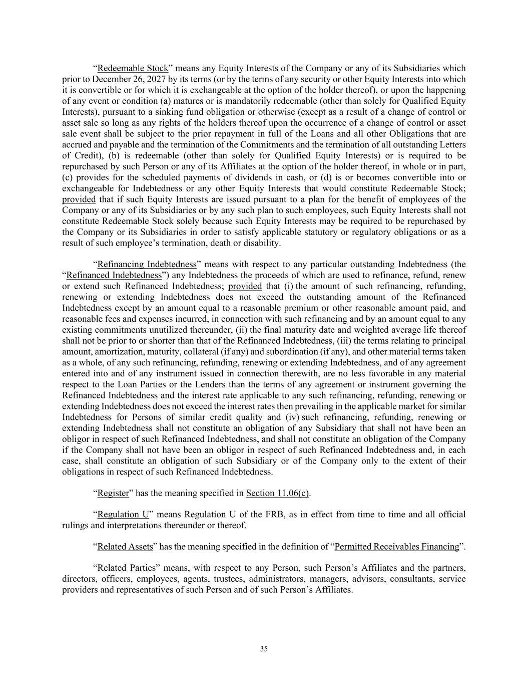 35 “Redeemable Stock” means any Equity Interests of the Company or any of its Subsidiaries which prior to December 26, 2027 by its terms (or by the terms of any security or other Equity Interests into which it is convertible or for which it is exchangeable at the option of the holder thereof), or upon the happening of any event or condition (a) matures or is mandatorily redeemable (other than solely for Qualified Equity Interests), pursuant to a sinking fund obligation or otherwise (except as a result of a change of control or asset sale so long as any rights of the holders thereof upon the occurrence of a change of control or asset sale event shall be subject to the prior repayment in full of the Loans and all other Obligations that are accrued and payable and the termination of the Commitments and the termination of all outstanding Letters of Credit), (b) is redeemable (other than solely for Qualified Equity Interests) or is required to be repurchased by such Person or any of its Affiliates at the option of the holder thereof, in whole or in part, (c) provides for the scheduled payments of dividends in cash, or (d) is or becomes convertible into or exchangeable for Indebtedness or any other Equity Interests that would constitute Redeemable Stock; provided that if such Equity Interests are issued pursuant to a plan for the benefit of employees of the Company or any of its Subsidiaries or by any such plan to such employees, such Equity Interests shall not constitute Redeemable Stock solely because such Equity Interests may be required to be repurchased by the Company or its Subsidiaries in order to satisfy applicable statutory or regulatory obligations or as a result of such employee’s termination, death or disability. “Refinancing Indebtedness” means with respect to any particular outstanding Indebtedness (the “Refinanced Indebtedness”) any Indebtedness the proceeds of which are used to refinance, refund, renew or extend such Refinanced Indebtedness; provided that (i) the amount of such refinancing, refunding, renewing or extending Indebtedness does not exceed the outstanding amount of the Refinanced Indebtedness except by an amount equal to a reasonable premium or other reasonable amount paid, and reasonable fees and expenses incurred, in connection with such refinancing and by an amount equal to any existing commitments unutilized thereunder, (ii) the final maturity date and weighted average life thereof shall not be prior to or shorter than that of the Refinanced Indebtedness, (iii) the terms relating to principal amount, amortization, maturity, collateral (if any) and subordination (if any), and other material terms taken as a whole, of any such refinancing, refunding, renewing or extending Indebtedness, and of any agreement entered into and of any instrument issued in connection therewith, are no less favorable in any material respect to the Loan Parties or the Lenders than the terms of any agreement or instrument governing the Refinanced Indebtedness and the interest rate applicable to any such refinancing, refunding, renewing or extending Indebtedness does not exceed the interest rates then prevailing in the applicable market for similar Indebtedness for Persons of similar credit quality and (iv) such refinancing, refunding, renewing or extending Indebtedness shall not constitute an obligation of any Subsidiary that shall not have been an obligor in respect of such Refinanced Indebtedness, and shall not constitute an obligation of the Company if the Company shall not have been an obligor in respect of such Refinanced Indebtedness and, in each case, shall constitute an obligation of such Subsidiary or of the Company only to the extent of their obligations in respect of such Refinanced Indebtedness. “Register” has the meaning specified in Section 11.06(c). “Regulation U” means Regulation U of the FRB, as in effect from time to time and all official rulings and interpretations thereunder or thereof. “Related Assets” has the meaning specified in the definition of “Permitted Receivables Financing”. “Related Parties” means, with respect to any Person, such Person’s Affiliates and the partners, directors, officers, employees, agents, trustees, administrators, managers, advisors, consultants, service providers and representatives of such Person and of such Person’s Affiliates.
